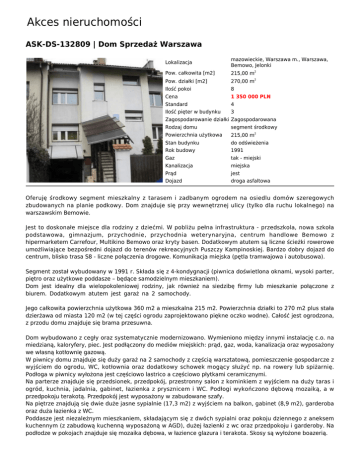 Akces nieruchomości ASK-DS-132809 | Dom Sprzedaż Warszawa Lokalizacja mazowieckie, Warszawa m., Warszawa, Bemowo, Jelonki Pow. całkowita [m2] 215,00 m2 Pow. działki [m2] 270,00 m2 Ilość pokoi 8 Cena 1 350 000 PLN Standard 4 Ilość pięter w budynku 3 Zagospodarowanie działki Zagospodarowana Rodzaj domu segment środkowy Powierzchnia użytkowa 215,00 m2 Stan budynku do odświeżenia Rok budowy 1991 Gaz tak - miejski Kanalizacja miejska Prąd jest Dojazd droga asfaltowa Oferuję środkowy segment mieszkalny z tarasem i zadbanym ogrodem na osiedlu domów szeregowych zbudowanych na planie podkowy. Dom znajduje się przy wewnętrznej ulicy (tylko dla ruchu lokalnego) na warszawskim Bemowie. Jest to doskonałe miejsce dla rodziny z dziećmi. W pobliżu pełna infrastruktura - przedszkola, nowa szkoła podstawowa, gimnazjum, przychodnie, przychodnia weterynaryjna, centrum handlowe Bemowo z hipermarketem Carrefour, Multikino Bemowo oraz kryty basen. Dodatkowym atutem są liczne ścieżki rowerowe umożliwiające bezpośredni dojazd do terenów rekreacyjnych Puszczy Kampinoskiej. Bardzo dobry dojazd do centrum, blisko trasa S8 - liczne połączenia drogowe. Komunikacja miejska (pętla tramwajowa i autobusowa). Segment został wybudowany w 1991 r. Składa się z 4-kondygnacji (piwnica doświetlona oknami, wysoki parter, piętro oraz użytkowe poddasze – będące samodzielnym mieszkaniem). Dom jest idealny dla wielopokoleniowej rodziny, jak również na siedzibę firmy lub mieszkanie połączone z biurem. Dodatkowym atutem jest garaż na 2 samochody. Jego całkowita powierzchnia użytkowa 360 m2 a mieszkalna 215 m2. Powierzchnia działki to 270 m2 plus stała dzierżawa od miasta 120 m2 (w tej części ogrodu zaprojektowano piękne oczko wodne). Całość jest ogrodzona, z przodu domu znajduje się brama przesuwna. Dom wybudowano z cegły oraz systematycznie modernizowano. Wymieniono między innymi instalację c.o. na miedzianą, kaloryfery, piec. Jest podłączony do mediów miejskich: prąd, gaz, woda, kanalizacja oraz wyposażony we własną kotłownię gazową. W piwnicy domu znajduje się duży garaż na 2 samochody z częścią warsztatową, pomieszczenie gospodarcze z wyjściem do ogrodu, WC, kotłownia oraz dodatkowy schowek mogący służyć np. na rowery lub spiżarnię. Podłoga w piwnicy wyłożona jest częściowo lastrico a częściowo płytkami ceramicznymi. Na parterze znajduje się przedsionek, przedpokój, przestronny salon z kominkiem z wyjściem na duży taras i ogród, kuchnia, jadalnia, gabinet, łazienka z prysznicem i WC. Podłogi wykończono dębową mozaiką, a w przedpokoju terakotą. Przedpokój jest wyposażony w zabudowane szafy. Na piętrze znajdują się dwie duże jasne sypialnie (17,3 m2) z wyjściem na balkon, gabinet (8,9 m2), garderoba oraz duża łazienka z WC. Poddasze jest niezależnym mieszkaniem, składającym się z dwóch sypialni oraz pokoju dziennego z aneksem kuchennym (z zabudową kuchenną wyposażoną w AGD), dużej łazienki z wc oraz przedpokoju i garderoby. Na podłodze w pokojach znajduje się mozaika dębowa, w łazience glazura i terakota. Skosy są wyłożone boazerią. Akces nieruchomości Wszystkie kondygnacje łączy klatka schodowa z dębowymi schodami. Agent Ryszard Celej Komórka 793322116 E-mail [email protected]