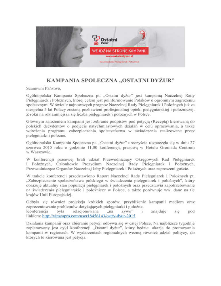 KAMPANIA SPOŁECZNA „OSTATNI DYŻUR” Szanowni Państwo, Ogólnopolska Kampania Społeczna pt. „Ostatni dyżur” jest kampanią Naczelnej Rady Pielęgniarek i Położnych, której celem jest poinformowanie Polaków o ogromnym zagrożeniu społecznym. W świetle najnowszych prognoz Naczelnej Rady Pielęgniarek i Położnych już za niespełna 5 lat Polacy zostaną pozbawieni profesjonalnej opieki pielęgniarskiej i położniczej. Z roku na rok zmniejsza się liczba pielęgniarek i położnych w Polsce. Głównym założeniem kampanii jest zebranie podpisów pod petycją (Receptą) kierowaną do polskich decydentów o podjęcie natychmiastowych działań w celu opracowania, a także wdrożenia programu zabezpieczenia społeczeństwa w świadczenia realizowane przez pielęgniarki i położne. Ogólnopolska Kampania Społeczna pt. „Ostatni dyżur” uroczyście rozpoczęła się w dniu 27 czerwca 2015 roku o godzinie 11.00 konferencją prasową w Hotelu Gromada Centrum w Warszawie. W konferencji prasowej brali udział Przewodniczący Okręgowych Rad Pielęgniarek i Położnych, Członkowie Prezydium Naczelnej Rady Pielęgniarek i Położnych, Przewodniczące Organów Naczelnej Izby Pielęgniarek i Położnych oraz zaproszeni goście. W trakcie konferencji przedstawiono Raport Naczelnej Rady Pielęgniarek i Położnych pt. „Zabezpieczenie społeczeństwa polskiego w świadczenia pielęgniarek i położnych”, który obrazuje aktualny stan populacji pielęgniarek i położnych oraz przedstawia zapotrzebowanie na świadczenia pielęgniarskie i położnicze w Polsce, a także porównuje ww. dane na tle krajów Unii Europejskiej. Odbyła się również projekcja krótkich spotów, przybliżenie kampanii mediom oraz zaprezentowanie problemów dotykających pielęgniarki i położne. Konferencja była relacjonowana „na żywo” i znajduje się pod linkiem: http://vimeopro.com/user18456143/ostry-dyur-2015 Działania kampanii oraz zbieranie petycji odbywa się w całej Polsce. Na najbliższe tygodnie zaplanowany jest cykl konferencji „Ostatni dyżur”, który będzie okazją do promowania kampanii w regionach. W wydarzeniach regionalnych wezmą również udział politycy, do których to kierowana jest petycja. „Ostatni dyżur” to pierwsza kampania społeczna w Europie, a druga na świecie, która wykorzystała najnowszą technologię wirtualnej rzeczywistości. Na potrzeby projektu powstał spot, przedstawiający codzienność pielęgniarek i położnych w technologii VR (spot interaktywny 3D). Dzięki tej technologii można stać się na chwilę pielęgniarką lub położną, zobaczyć jak ciężka i potrzebna jest nasza praca, a właściwie opieka nad pacjentami. Informacje o kampanii dostępne są na stronie internetowej: www.ostatnidyzur.pl. Tam również znajduje się Recepta, którą można podpisać on-line lub wydrukować i podpisaną przesłać na adres Naczelnej Izby Pielęgniarek i Położnych z dopiskiem „Recepta”. Działamy również na Facebooku oraz Twitterze, tam można śledzić przebieg kampanii i włączyć się do akcji udostępniając stronę do znajomych, rodziny. Ostatni dyżur to kampania nas wszystkich - polskich obywateli. W trosce o nasze zdrowie i życie powinniśmy zawalczyć o zapewnienie nam wszystkim podstawowej opieki pielęgniarskiej i położniczej. Niebezpieczeństwo pustych szpitali, hospicjów bez pielęgniarek i położnych jest już blisko - nie możemy pozostawać obojętni. Dlatego zachęcam wszystkich do włączenia się do naszej akcji i podpisywania recept. Z poważaniem Prezes dr. n. med. Grażyna Rogala-Pawelczyk