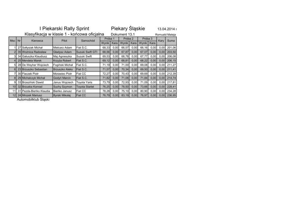 Piekary Śląskie I Piekarski Rally Sprint Klasyfikacja w klasie 1 - końcowa oficjalna Msc Nr Kierowca Pilot Samochód 13.04.2014 r. 10:00 Dokument 13.1 Próba 1 Próba 2 Romuald Mateja Próba 3 Wynik Kara Wynik Kara Wynik Kara Kary Suma 1 27 Sołtysiak Michał Mielcarz Adam Fiat S.C. 68,33 0,00 66,57 0,00 66,16 0,00 0,00 201,06 2 35 Woźnica Radosław Gładysz Adam Suzuki Swift GTI 68,56 0,00 67,87 0,00 67,07 0,00 0,00 203,50 3 34 Gałuszka Klaudiusz Maj Agnieszka Suzuki Swift 69,53 0,00 68,78 0,00 67,77 0,00 0,00 206,08 4 25 Mendela Marek Krzyża Robert Fiat S.C. 69,12 0,00 68,81 0,00 68,22 0,00 0,00 206,15 5 28 De Weyher Wojciech Fogiński Michał Fiat S.C. 71,19 0,00 71,00 0,00 69,08 0,00 0,00 211,27 6 23 Brzuszko Sebastian Brzuszko Aleks Fiat S.C. 71,57 0,00 70,34 0,00 69,50 0,00 0,00 211,41 7 30 Flaczek Piotr Morawiec Piotr Fiat CC 72,27 0,00 70,43 0,00 69,69 0,00 0,00 212,39 8 29 Michalczyk Michał Godyń Marcin Fiat S.C. 71,82 0,00 71,08 0,00 71,84 0,00 0,00 214,74 9 33 Brzeziński Dawid 10 32 Brzuska Konrad Janus Wojciech Toyota Yaris 73,79 0,00 72,93 0,00 71,09 0,00 0,00 217,81 Suchy Szymon Toyota Starlet 76,25 0,00 78,50 0,00 73,66 0,00 0,00 228,41 11 31 Pezda-Bieńko Klaudia Bieńko Janusz Fiat CC 78,28 0,00 75,10 0,00 80,90 0,00 0,00 234,28 12 24 Mrozek Mariusz Byrski Mikołaj Fiat CC 76,79 0,00 83,19 0,00 76,97 0,00 0,00 236,95 Automobilklub Śląski