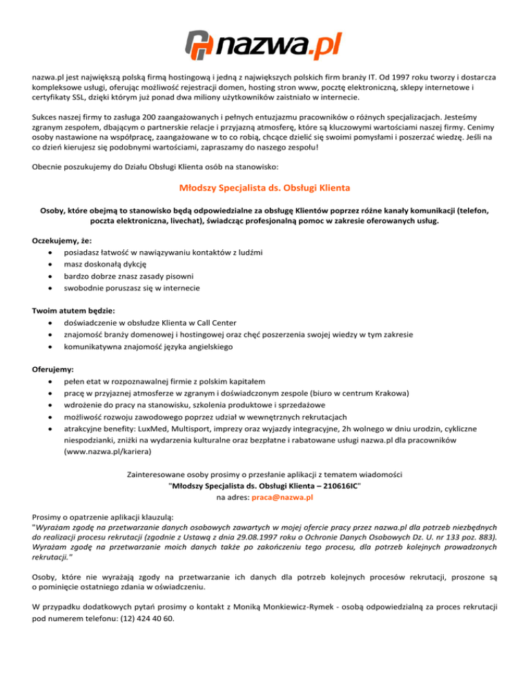 nazwa.pl jest największą polską firmą hostingową i jedną z największych polskich firm branży IT. Od 1997 roku tworzy i dostarcza kompleksowe usługi, oferując możliwość rejestracji domen, hosting stron www, pocztę elektroniczną, sklepy internetowe i certyfikaty SSL, dzięki którym już ponad dwa miliony użytkowników zaistniało w internecie. Sukces naszej firmy to zasługa 200 zaangażowanych i pełnych entuzjazmu pracowników o różnych specjalizacjach. Jesteśmy zgranym zespołem, dbającym o partnerskie relacje i przyjazną atmosferę, które są kluczowymi wartościami naszej firmy. Cenimy osoby nastawione na współpracę, zaangażowane w to co robią, chcące dzielić się swoimi pomysłami i poszerzać wiedzę. Jeśli na co dzień kierujesz się podobnymi wartościami, zapraszamy do naszego zespołu! Obecnie poszukujemy do Działu Obsługi Klienta osób na stanowisko: Młodszy Specjalista ds. Obsługi Klienta Osoby, które obejmą to stanowisko będą odpowiedzialne za obsługę Klientów poprzez różne kanały komunikacji (telefon, poczta elektroniczna, livechat), świadcząc profesjonalną pomoc w zakresie oferowanych usług. Oczekujemy, że: posiadasz łatwość w nawiązywaniu kontaktów z ludźmi masz doskonałą dykcję bardzo dobrze znasz zasady pisowni swobodnie poruszasz się w internecie Twoim atutem będzie: doświadczenie w obsłudze Klienta w Call Center znajomość branży domenowej i hostingowej oraz chęć poszerzenia swojej wiedzy w tym zakresie komunikatywna znajomość języka angielskiego Oferujemy: pełen etat w rozpoznawalnej firmie z polskim kapitałem pracę w przyjaznej atmosferze w zgranym i doświadczonym zespole (biuro w centrum Krakowa) wdrożenie do pracy na stanowisku, szkolenia produktowe i sprzedażowe możliwość rozwoju zawodowego poprzez udział w wewnętrznych rekrutacjach atrakcyjne benefity: LuxMed, Multisport, imprezy oraz wyjazdy integracyjne, 2h wolnego w dniu urodzin, cykliczne niespodzianki, zniżki na wydarzenia kulturalne oraz bezpłatne i rabatowane usługi nazwa.pl dla pracowników (www.nazwa.pl/kariera) Zainteresowane osoby prosimy o przesłanie aplikacji z tematem wiadomości "Młodszy Specjalista ds. Obsługi Klienta – 210616IC" na adres: [email protected] Prosimy o opatrzenie aplikacji klauzulą: "Wyrażam zgodę na przetwarzanie danych osobowych zawartych w mojej ofercie pracy przez nazwa.pl dla potrzeb niezbędnych do realizacji procesu rekrutacji (zgodnie z Ustawą z dnia 29.08.1997 roku o Ochronie Danych Osobowych Dz. U. nr 133 poz. 883). Wyrażam zgodę na przetwarzanie moich danych także po zakończeniu tego procesu, dla potrzeb kolejnych prowadzonych rekrutacji." Osoby, które nie wyrażają zgody na przetwarzanie ich danych dla potrzeb kolejnych procesów rekrutacji, proszone są o pominięcie ostatniego zdania w oświadczeniu. W przypadku dodatkowych pytań prosimy o kontakt z Moniką Monkiewicz-Rymek - osobą odpowiedzialną za proces rekrutacji pod numerem telefonu: (12) 424 40 60.