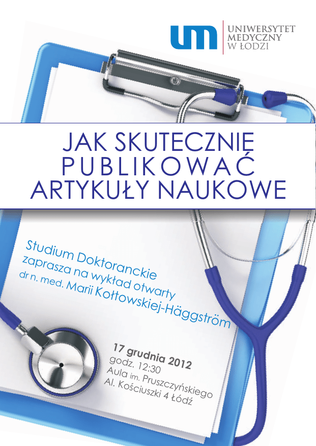 JAK SKUTECZNIE PUBLIKOWAÆ ARTYKU£Y NAUKOWE Stu diu zapra m Dokto ranc sza n a wy kie dr n. med k ³ ad o . Ma twar rii Ko ty ³t owsk iej- 17 gr u Ha¨ gg stro¨ m godz dnia 20 12 . Aula 12:30 im. P rus Al. Ko œcius zczyñskie zki 4 £ódŸ go Zapraszamy na wyk³ad organizowany przez projekt edukacyjny Proper Medical Writing, prowadzony przez dyrektora medycznego Pfizer Endocrine Care w Sztokholmie . PrzyjdŸ i dowiedz siê jak mo¿esz rozwin¹æ i udoskonaliæ umiejêtnoœæ opracowywania wyników naukowych, tak aby je opublikowaæ w czasopismach o wysokim wskaŸniku cytowañ (Impact Factor-IF), jakie elementy tworz¹ publikacjê naukow¹ i jak dok³adnie wygl¹da proces wydawniczy. Proper Medical Writing Szkolenia i us³ugi: t³umaczenie i redagowanie artyku³ów naukowych www.propermedicalwriting.com