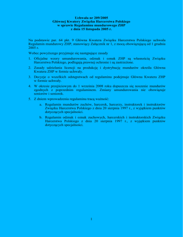 Uchwała nr 209/2005 Głównej Kwatery Związku Harcerstwa Polskiego w sprawie Regulaminu mundurowego ZHP z dnia 15 listopada 2005 r. Na podstawie par. 64 pkt. 9 Główna Kwatera Związku Harcerstwa Polskiego uchwala Regulamin mundurowy ZHP, stanowiący Załącznik nr 1, z mocą obowiązującą od 1 grudnia 2005 r. Wobec powyższego przyjmuje się następujące zasady 1. Oficjalne wzory umundurowania, odznak i oznak ZHP są własnością Związku Harcerstwa Polskiego, podlegają prawnej ochronie i są zastrzeżone. 2. Zasady udzielania licencji na produkcję i dystrybucję mundurów określa Główna Kwatera ZHP w formie uchwały. 3. Decyzje o wszelkich odstępstwach od regulaminu podejmuje Główna Kwatera ZHP w formie uchwały. 4. W okresie przejściowym do 1 września 2008 roku dopuszcza się noszenie mundurów zgodnych z poprzednim regulaminem. Zmiany umundurowania nie obowiązuje seniorów i seniorek. 5. Z dniem wprowadzenia regulaminu tracą ważność: a. Regulamin mundurów zuchów, harcerek, harcerzy, instruktorek i instruktorów Związku Harcerstwa Polskiego z dnia 20 sierpnia 1997 r., z wyjątkiem punktów dotyczących specjalności. b. Regulamin odznak i oznak zuchowych, harcerskich i instruktorskich Związku Harcerstwa Polskiego z dnia 20 sierpnia 1997 r., z wyjątkiem punktów dotyczących specjalności. 1 Regulamin mundurowy Związku Harcerstwa Polskiego Uwaga techniczna: Rysunki w regulaminie mają jedynie charakter poglądowy i nie należy się nimi sugerować w sprawie detali wyglądu umundurowania. Spis treści CZĘŚĆ I. POSTANOWIENIA OGÓLNE ............................................................................................................3 CZĘŚĆ II. MUNDUR ..............................................................................................................................................4 1. ZUCHY - DZIEWCZĘTA .......................................................................................................................................4 2. ZUCHY - CHŁOPCY .............................................................................................................................................4 3. HARCERKI, HARCERKI STARSZE .........................................................................................................................5 4. HARCERZE, HARCERZE STARSI ...........................................................................................................................5 5. WĘDROWNICZKI ................................................................................................................................................6 6. WĘDROWNICY ..................................................................................................................................................6 7. INSTRUKTORKI ..................................................................................................................................................7 8. INSTRUKTORZY .................................................................................................................................................7 CZĘŚĆ III. STRÓJ GALOWY ............................................................................................................................8 1. INSTRUKTORKI - STRÓJ GALOWY ........................................................................................................................8 2. INSTRUKTORZY - STRÓJ GALOWY .......................................................................................................................8 CZĘŚĆ IV. NOSZENIE MUNDURU – PRZEPISY I REGULACJE ................................................................8 1. ZASADY OGÓLNE...............................................................................................................................................8 2. CHUSTA ............................................................................................................................................................8 3. PAS HARCERSKI .................................................................................................................................................8 CZĘŚĆ V. ODZNAKI I OZNAKI ..........................................................................................................................9 1. ROZMIESZCZENIE ODZNAK I OZNAK NA MUNDURZE............................................................................................9 2. ZAŁĄCZNIKI ....................................................................................................................................................15 2 Część I. 1. Postanowienia ogólne Regulamin Mundurowy ZHP obowiązuje wszystkich członków zwyczajnych ZHP. 2. Członkowie ZHP noszą mundury wg oficjalnego wzoru ZHP. Wyjątki określa regulamin. Oficjalne wzory umundurowania ZHP podlegają prawnej ochronie, są oznaczone wszywką z logo ZHP. Koszula mundurowa jest oznaczona dodatkowo haftowanym logo ZHP znajdującym się na lewej patce kieszeni. 3. Krzyż harcerski, znaczek zucha oraz sznur funkcyjny, noszone są wyłącznie na koszuli mundurowej. Na pozostałych ubraniach, oraz strojach galowych ZHP dopuszcza się noszenie miniaturki krzyża. 4. Główna Kwatera ZHP określi w formie uchwały zasady udzielania licencji na produkcję i dystrybucję mundurów. 5. Każda drużyna dąży do pełnego umundurowania swoich członków, oraz dba, aby wygląd członków drużyny/gromady był jednolity. 6. Każdy członek ZHP ma obowiązek dbania o mundur i utrzymywania go w należytym porządku, 7. Podczas występowania razem z gromadą, drużyną szczepem, związkiem drużyn instruktor powinien nosić umundurowanie zgodne z zasadami przyjętymi w tej gromadzie, drużynie, szczepie, związku drużyn. 8. Dobór dolnej części umundurowania powinien uwzględniać warunki atmosferyczne. Podwijanie rękawów w koszuli mundurowej powinno uwzględniać w