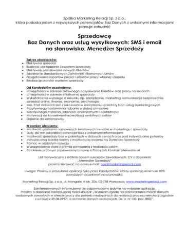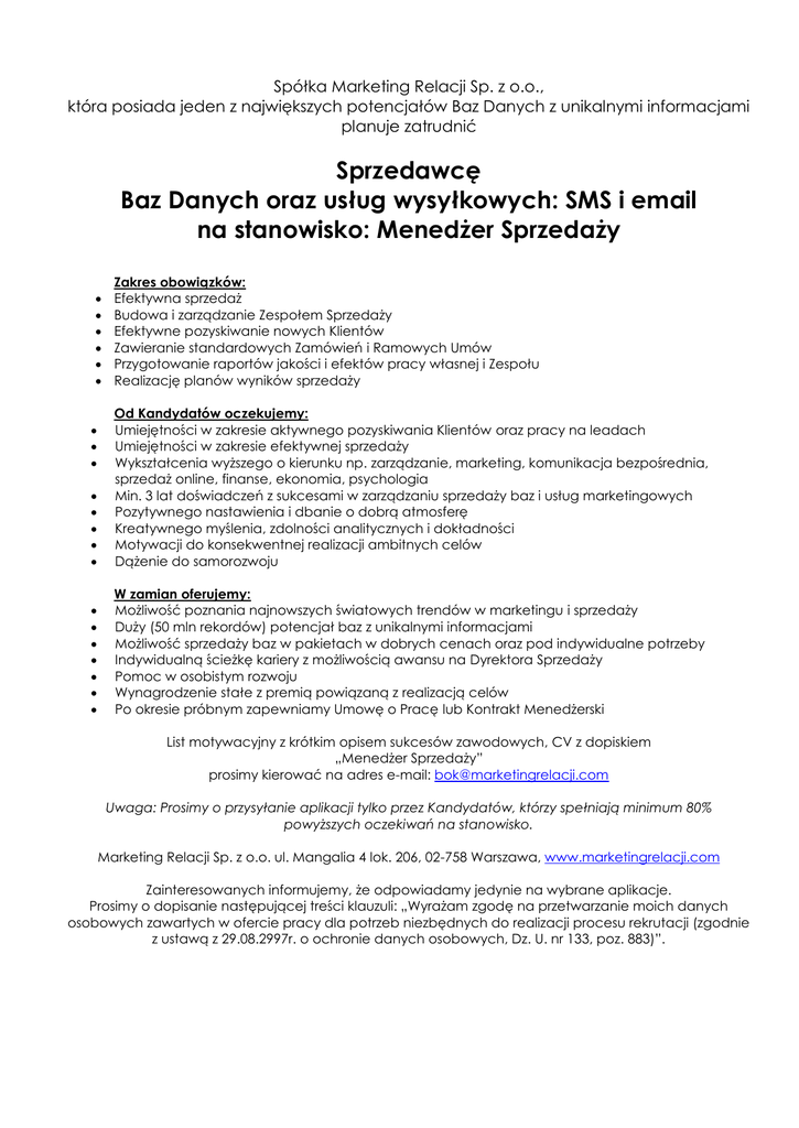 Spółka Marketing Relacji Sp. z o.o., która posiada jeden z największych potencjałów Baz Danych z unikalnymi informacjami planuje zatrudnić Sprzedawcę Baz Danych oraz usług wysyłkowych: SMS i email na stanowisko: Menedżer Sprzedaży Zakres obowiązków: Efektywna sprzedaż Budowa i zarządzanie Zespołem Sprzedaży Efektywne pozyskiwanie nowych Klientów Zawieranie standardowych Zamówień i Ramowych Umów Przygotowanie raportów jakości i efektów pracy własnej i Zespołu Realizację planów wyników sprzedaży Od Kandydatów oczekujemy: Umiejętności w zakresie aktywnego pozyskiwania Klientów oraz pracy na leadach Umiejętności w zakresie efektywnej sprzedaży Wykształcenia wyższego o kierunku np. zarządzanie, marketing, komunikacja bezpośrednia, sprzedaż online, finanse, ekonomia, psychologia Min. 3 lat doświadczeń z sukcesami w zarządzaniu sprzedaży baz i usług marketingowych Pozytywnego nastawienia i dbanie o dobrą atmosferę Kreatywnego myślenia, zdolności analitycznych i dokładności Motywacji do konsekwentnej realizacji ambitnych celów Dążenie do samorozwoju W zamian oferujemy: Możliwość poznania najnowszych światowych trendów w marketingu i sprzedaży Duży (50 mln rekordów) potencjał baz z unikalnymi informacjami Możliwość sprzedaży baz w pakietach w dobrych cenach oraz pod indywidualne potrzeby Indywidualną ścieżkę kariery z możliwością awansu na Dyrektora Sprzedaży Pomoc w osobistym rozwoju Wynagrodzenie stałe z premią powiązaną z realizacją celów Po okresie próbnym zapewniamy Umowę o Pracę lub Kontrakt Menedżerski List motywacyjny z krótkim opisem sukcesów zawodowych, CV z dopiskiem „Menedżer Sprzedaży” prosimy kierować na adres e-mail: [email protected] Uwaga: Prosimy o przysyłanie aplikacji tylko przez Kandydatów, którzy spełniają minimum 80% powyższych oczekiwań na stanowisko. Marketing Relacji Sp. z o.o. ul. Mangalia 4 lok. 206, 02-758 Warszawa, www.marketingrelacji.com Zainteresowanych informujemy, że odpowiadamy jedynie na wybrane aplikacje. Prosimy o dopisanie następującej treści klauzuli: „Wyrażam zgodę na przetwarzanie moich danych osobowych zawartych w ofercie pracy dla potrzeb niezbędnych do realizacji procesu rekrutacji (zgodnie z ustawą z 29.08.2997r. o ochronie danych osobowych, Dz. U. nr 133, poz. 883)”.