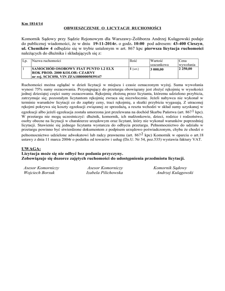Km 1814/14 OBWIESZCZENIE O LICYTACJI RUCHOMOŚCI Komornik Sądowy przy Sądzie Rejonowym dla Warszawy-Żoliborza Andrzej Kulągowski podaje do publicznej wiadomości, że w dniu 19-11-2014r. o godz. 10:00 pod adresem: 43-400 Cieszyn, ul. Chemików 4 odbędzie się w trybie ustalonym w art. 867 kpc pierwsza licytacja ruchomości należących do dłużnika i składających się z: Lp. Nazwa ruchomości Ilość 1 SAMOCHÓD OSOBOWY FIAT PUNTO 1.2 ELX ROK PROD. 2000 KOLOR: CZARNY nr rej. SCIC050, VIN ZFA18800005039147 1 [szt.] Wartość szacunkowa 3 000,00 Cena wywołania 2 250,00 Ruchomości można oglądać w dzień licytacji w miejscu i czasie oznaczonym wyżej. Suma wywołania wynosi 75% sumy oszacowania. Przystępujący do przetargu obowiązany jest złożyć rękojmię w wysokości jednej dziesiątej części sumy oszacowania. Rękojmię złożoną przez licytanta, któremu udzielono przybicia, zatrzymuje się; pozostałym licytantom rękojmię zwraca się niezwłocznie. Jeżeli nabywca nie wykonał w terminie warunków licytacji co do zapłaty ceny, traci rękojmię, a skutki przybicia wygasają. Z utraconej rękojmi pokrywa się koszty egzekucji związanej ze sprzedażą, a reszta wchodzi w skład sumy uzyskanej w egzekucji albo jeżeli egzekucja została umorzona jest przelewana na dochód Skarbu Państwa (art. 867 1 kpc). W przetargu nie mogą uczestniczyć: dłużnik, komornik, ich małżonkowie, dzieci, rodzice i rodzeństwo, osoby obecne na licytacji w charakterze urzędowym oraz licytant, który nie wykonał warunków poprzedniej licytacji. Stawienie się jednego licytanta wystarcza do odbycia przetargu. Pełnomocnictwo do udziału w przetargu powinno być stwierdzone dokumentem z podpisem urzędowo poświadczonym, chyba że chodzi o pełnomocnictwo udzielone adwokatowi lub radcy prawnemu (art. 867 2 kpc) Komornik w oparciu o art.18 ustawy z dnia 11 marca 2004r o podatku od towarów i usług (Dz.U. Nr 54, poz.535) wystawia faktury VAT. UWAGA: Licytacja może się nie odbyć bez podania przyczyny. Zobowiązuje się dozorce zajętych ruchomości do udostępnienia przedmiotu licytacji. Asesor Komorniczy Wojciech Borsuk Asesor Komorniczy Izabela Pilichowska Komornik Sądowy Andrzej Kulągowski
