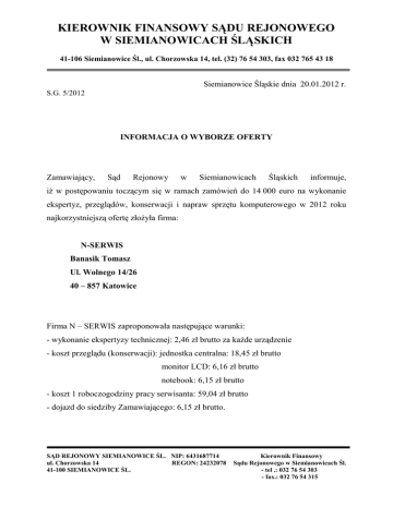 KIEROWNIK FINANSOWY SĄDU REJONOWEGO W SIEMIANOWICACH ŚLĄSKICH 41-106 Siemianowice Śl., ul. Chorzowska 14, tel. (32) 76 54 303, fax 032 765 43 18 Siemianowice Śląskie dnia 20.01.2012 r. S.G. 5/2012 INFORMACJA O WYBORZE OFERTY Zamawiający, Sąd Rejonowy w Siemianowicach Śląskich informuje, iŜ w postępowaniu toczącym się w ramach zamówień do 14 000 euro na wykonanie ekspertyz, przeglądów, konserwacji i napraw sprzętu komputerowego w 2012 roku najkorzystniejszą ofertę złoŜyła firma: N-SERWIS Banasik Tomasz Ul. Wolnego 14/26 40 – 857 Katowice Firma N – SERWIS zaproponowała następujące warunki: - wykonanie ekspertyzy technicznej: 2,46 zł brutto za kaŜde urządzenie - koszt przeglądu (konserwacji): jednostka centralna: 18,45 zł brutto monitor LCD: 6,16 zł brutto notebook: 6,15 zł brutto - koszt 1 roboczogodziny pracy serwisanta: 59,04 zł brutto - dojazd do siedziby Zamawiającego: 6,15 zł brutto. SĄD REJONOWY SIEMIANOWICE ŚL. NIP: 6431687714 ul. Chorzowska 14 REGON: 24232078 41-100 SIEMIANOWICE ŚL. Kierownik Finansowy Sądu Rejonowego w Siemianowicach Śl. - tel .: 032 76 54 303 - fax.: 032 76 54 315 KIEROWNIK FINANSOWY SĄDU REJONOWEGO W SIEMIANOWICACH ŚLĄSKICH 41-106 Siemianowice Śl., ul. Chorzowska 14, tel. (32) 76 54 303, fax 032 765 43 18 W toczącym się postępowaniu w wyznaczonym przez Zamawiającego terminie wpłynęło 8 ofert. Dziękujemy za zainteresowanie oraz złoŜone oferty. Oryginał podpisał Kierownik Finansowy Grzegorz Makowski Do wiadomości: 1. 2. www.siemianowice.sr.gov.pl a/a SĄD REJONOWY SIEMIANOWICE ŚL. NIP: 6431687714 ul. Chorzowska 14 REGON: 24232078 41-100 SIEMIANOWICE ŚL. Kierownik Finansowy Sądu Rejonowego w Siemianowicach Śl. - tel .: 032 76 54 303 - fax.: 032 76 54 315