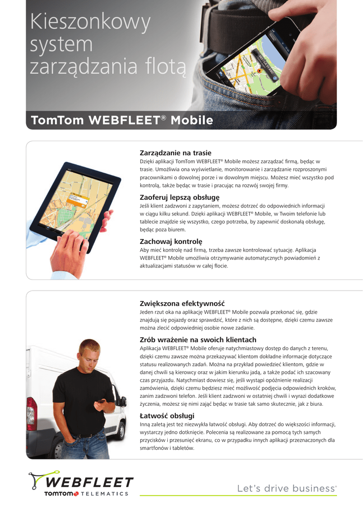 Kieszonkowy system zarządzania flotą TomTom WEBFLEET® Mobile Zarządzanie na trasie Dzięki aplikacji TomTom WEBFLEET® Mobile możesz zarządzać firmą, będąc w trasie. Umożliwia ona wyświetlanie, monitorowanie i zarządzanie rozproszonymi pracownikami o dowolnej porze i w dowolnym miejscu. Możesz mieć wszystko pod kontrolą, także będąc w trasie i pracując na rozwój swojej firmy. Zaoferuj lepszą obsługę Jeśli klient zadzwoni z zapytaniem, możesz dotrzeć do odpowiednich informacji w ciągu kilku sekund. Dzięki aplikacji WEBFLEET® Mobile, w Twoim telefonie lub tablecie znajdzie się wszystko, czego potrzeba, by zapewnić doskonałą obsługę, będąc poza biurem. Zachowaj kontrolę Aby mieć kontrolę nad firmą, trzeba zawsze kontrolować sytuację. Aplikacja WEBFLEET® Mobile umożliwia otrzymywanie automatycznych powiadomień z aktualizacjami statusów w całej flocie. Zwiększona efektywność Jeden rzut oka na aplikację WEBFLEET® Mobile pozwala przekonać się, gdzie znajdują się pojazdy oraz sprawdzić, które z nich są dostępne, dzięki czemu zawsze można zlecić odpowiedniej osobie nowe zadanie. Zrób wrażenie na swoich klientach Aplikacja WEBFLEET® Mobile oferuje natychmiastowy dostęp do danych z terenu, dzięki czemu zawsze można przekazywać klientom dokładne informacje dotyczące statusu realizowanych zadań. Można na przykład powiedzieć klientom, gdzie w danej chwili są kierowcy oraz w jakim kierunku jadą, a także podać ich szacowany czas przyjazdu. Natychmiast dowiesz się, jeśli wystąpi opóźnienie realizacji zamówienia, dzięki czemu będziesz mieć możliwość podjęcia odpowiednich kroków, zanim zadzwoni telefon. Jeśli klient zadzwoni w ostatniej chwili i wyrazi dodatkowe życzenia, możesz się nimi zająć będąc w trasie tak samo skutecznie, jak z biura. Łatwość obsługi Inną zaletą jest też niezwykła łatwość obsługi. Aby dotrzeć do większości informacji, wystarczy jedno dotknięcie. Polecenia są realizowane za pomocą tych samych przycisków i przesunięć ekranu, co w przypadku innych aplikacji przeznaczonych dla smartfonów i tabletów. Przegląd funkcji Pojazdy • Sprawdzaj lokalizację i status poszczególnych pojazdów oraz grup pojazdów. • Zobacz, gdzie jadą pojazdy oraz jaki jest szacowany czas przyjazdu każdego z nich. Ruch drogowy • Zaplanuj swoją trasę na mapie TomTom w smartfonie, biorąc pod uwagę informacje o ruchu drogowym zapewniane przez usługę HD Traffic. Podróże • Wyświetlaj informacje o podróży według daty — dla pojedynczego pojazdu lub dla całej floty. • Wyświetlaj ich trasy na mapie. • Sprawdzaj punkty początkowe i końcowe, czas trwania podróży oraz przebyty dystans. Zamówienia • Wysyłaj zamówienia bezpośrednio ze swojego telefonu lub tabletu. • Wybieraj pojazdy i wyświetlaj realizowane zamówienia. • Sprawdzaj lokalizację pojazdów realizujących zamówienie, a także ich szacowany czas przyjazdu. Wiadomości • Wyświetlaj wiadomości dotyczące zamówień, wiadomości tekstowe i wiadomości o statusie na przejrzystym podglądzie, aby być na bieżąco. • Wysyłaj wiadomości SMS bezpośrednio do urządzenia TomTom kierowcy. Powiadomienia • Otrzymuj natychmiastowe ostrzeżenia o wjechaniu do wyznaczonej strefy lub jej opuszczeniu. • Skorzystaj z możliwości otrzymywania automatycznych powiadomień o zmianie statusu zamówienia. Obsługiwane języki • Angielski, niemiecki, francuski, holenderski, hiszpański, portugalski i włoski. Współpraca z tabletami • Zarządzaj flotą z urządzenia iPad lub tabletu z systemem Android. Rozwiązania TomTom WORKsmart™ do zarządzania flotą pojazdów ułatwiają zarządzanie wszelkimi aspektami firmy transportowej. TomTom WEBFLEET® to bezpieczna internetowa aplikacja służąca do zarządzania flotą o każdej porze i z dowolnego miejsca za pośrednictwem Internetu. Z aplikacji TomTom WEBFLEET® Mobile mogą korzystać wyłącznie użytkownicy z pełną subskrypcją WEBFLEET®. Po pobraniu aplikacji wystarczy zalogować się, korzystając z nazwy użytkownika i hasła wykorzystywanych w koncie głównym. Pobierz aplikację teraz Można ją znaleźć w sklepie App Store lub Android Market, wpisując WEBFLEET® Mobile lub słowo kluczowe TTWFM. TTT_Webfleet_mobile_PL Dostępne z rozwiązaniem TomTom WORKsmart™