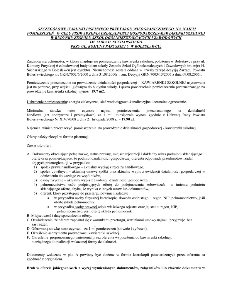 SZCZEGÓŁOWE WARUNKI PISEMNEGO PRZETARGU NIEOGRANICZONEGO NA NAJEM POMIESZCZEŃ W CELU PROWADZENIA DZIAŁALNOŚCI GOSPODARCZEJ-KAWIARENKI SZKOLNEJ W BUDYNKU ZESPOŁU SZKÓŁ OGÓLNOKSZTAŁCĄCYCH I ZAWODOWYCH IM. MJRA H. SUCHARSKIEGO PRZY UL. KOMUNY PARYSKIEJ 6 W BOLESŁAWCU. Zarządcą nieruchomości, w której znajduje się pomieszczenie kawiarenki szkolnej, położonej w Bolesławcu przy ul. Komuny Paryskiej 6 zabudowanej budynkiem szkoły Zespołu Szkół Ogólnokształcących i Zawodowych im. mjra H. Sucharskiego w Bolesławcu jest dyrektor. Nieruchomość została oddana w trwały zarząd decyzją Zarządu Powiatu Bolesławieckiego nr: GKN.7002/6/2000 z dnia 31.08.2000r. i zm. Decyzją GKN.7003/13/2005 z dnia 09.08.2005r. Pomieszczenie przeznaczone na prowadzenie działalności gospodarczej – KAWIARENKI SZKOLNEJ usytuowane jest na parterze, przy wejściu głównym do budynku szkoły. Łączna powierzchnia pomieszczenia przeznaczonego na prowadzenie kawiarenki szkolnej wynosi 19,7 m2. Uzbrojenie pomieszczenia: energia elektryczna, sieć wodociągowo-kanalizacyjna i centralne ogrzewanie. Minimalna stawka netto czynszu najmu pomieszczenia przeznaczonego na działalność handlową (art. spożywcze i przemysłowe) za 1 m2 miesięcznie wynosi zgodnie z Uchwałą Rady Powiatu Bolesławieckiego Nr XIV/70/08 z dnia 21 listopada 2008 r.: - 17,90 zł. Najemca winien przeznaczyć pomieszczenia na prowadzenie działalności gospodarczej - kawiarenki szkolnej. Oferty należy złożyć w formie pisemnej. Zawartość ofert: A.. Dokumenty określające pełną nazwę, status prawny, miejsce rejestracji i dokładny adres podmiotu składającego ofertę oraz potwierdzające, że podmiot działalności gospodarczej oferenta odpowiada przedmiotowi zadań objętych przetargiem, tj. w przypadku: 1) spółek prawa handlowego – aktualny wyciąg z rejestru handlowego, 2) spółek cywilnych – aktualną umowę spółki oraz aktualny wypis z ewidencji działalności gospodarczej w odniesieniu do każdego ze wspólników, 3) osoby fizyczne – aktualny wypis z ewidencji działalności gospodarczej, 4) pełnomocnictwa osób podpisujących ofertę do podejmowania zobowiązań w imieniu podmiotu składającego ofertę, chyba, że wynika z innych ustaw lub dokumentów, 5) oferent, który przystępuje do przetargu powinien załączyć: w przypadku osoby fizycznej kserokopię dowodu osobistego, regon, NIP, pełnomocnictwo, jeśli ofertę składa pełnomocnik. w przypadku osoby prawnej odpis właściwego rejestru oraz jej statut, regon, NIP, pełnomocnictwo, jeśli ofertę składa pełnomocnik. B. Miejscowość i datę sporządzenia oferty. C. Oświadczenie, że oferent zapoznał się z warunkami przetargu, warunkami umowy najmu i przyjmuje bez zastrzeżeń. D. Oferowaną stawkę netto czynszu za 1 m2 pomieszczeń (słownie i cyfrowo). E. Określenie asortymentu prowadzonej kawiarenki szkolnej. F. Określenie proponowanego wniesienia przez oferenta wyposażenia do kawiarenki szkolnej, niezbędnego do realizacji wskazanej formy działalności. Dokumenty wskazane w pkt. A powinny być złożone w formie kserokopii potwierdzonych przez oferenta za zgodność z oryginałem. Brak w ofercie jakiegokolwiek z wyżej wymienionych dokumentów, załączników lub złożenie dokumentu w niewłaściwej formie spowoduje wykluczenie wykonawcy. Warunki umowy najmu: Wg załączonego wzoru umowy Czas trwania umowy: do 3 lat od daty zawarcia. Kryteria oceny ofert: - cena netto czynszu za 1 m2 – 100 %, Ofertę należy umieścić w zamkniętej kopercie z napisem: „Oferta cenowa w zakresie prowadzenia działalności gospodarczej – kawiarenka szkolna" NIE OTWIERAĆ PRZED 01 lipca 2011 roku o godz. 10:00 Oferty należy składać do dnia 01 lipca 2011 roku do godz.9.00 w sekretariacie Zespołu Szkół Ogólnokształcących i Zawodowych w Bolesławcu, ul. Komuny Paryskiej 6. W przypadku wysłania oferty pocztą decyduje data wpływu przesyłki na ww. adres. Część jawna przetargu odbędzie się w dniu 01 lipca 2011 r. o godz.10.00 w Zespole Szkół Ogólnokształcących i Zawodowych w Bolesławcu, ul. Komuny Paryskiej 6. W tej części dopuszcza się udział oferentów. Część niejawna przetargu odbędzie się po zakończeniu części jawnej. W tej części ocenione zostanie merytoryczna wartość oferty. Ogłoszenie wyników przetargu nastąpi przez podanie wiadomości na stronie internetowej szkoły tj. www.sucharski.edu.pl W załączeniu: 1. Oferta 2. Wzór umowy Bolesławiec, 08 czerwca 2011r.