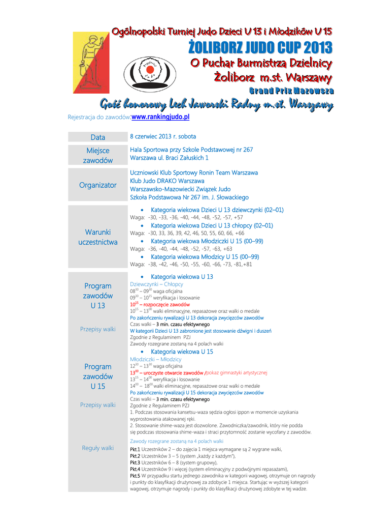 O Oggóóllnnooppoollsskkii TTuurrnniieejj JJuuddoo D Dzziieeccii U U 1133 ii M M??ooddzziikkóów wU U 1155 ŻOLIBORZ JUDO CUP 2013 O O PPuucchhaarr BBuurrm miissttrrzzaa D Dzziieellnniiccyy ŻŻoolliibboorrzz m m..sstt.. W Waarrsszzaaw wyy GGrraanndd PPrriixx M Maazzoow wsszzaa Gość honorowy Lech Jaworski Radny m.st. Warszawy Rejestracja do zawodów:www.rankingjudo.pl Data Miejsce zawodów Organizator 8 czerwiec 2013 r. sobota Hala Sportowa przy Szkole Podstawowej nr 267 Warszawa ul. Braci Załuskich 1 Uczniowski Klub Sportowy Ronin Team Warszawa Klub Judo DRAKO Warszawa Warszawsko-Mazowiecki Związek Judo Szkoła Podstawowa Nr 267 im. J. Słowackiego Kategoria wiekowa Dzieci U 13 dziewczynki (02–01) Waga: -30, -33, -36, -40, -44, -48, -52, -57, +57 Warunki uczestnictwa Kategoria wiekowa Dzieci U 13 chłopcy (02–01) Waga: -30, 33, 36, 39, 42, 46, 50, 55, 60, 66, +66 Kategoria wiekowa Młodziczki U 15 (00–99) Waga: -36, -40, -44, -48, -52, -57, -63, +63 Kategoria wiekowa Młodzicy U 15 (00–99) Waga: -38, -42, -46, -50, -55, -60, -66, -73, -81,+81 Program zawodów U 13 Przepisy walki 0830 – 0930 waga oficjalna 0930 – 1015 weryfikacja i losowanie 1015 – rozpoczęcie zawodów 1015 – 1300 walki eliminacyjne, repasażowe oraz walki o medale Po zakończeniu rywalizacji U 13 dekoracja zwycięzców zawodów Czas walki – 3 min. czasu efektywnego W kategorii Dzieci U 13 zabronione jest stosowanie dźwigni i duszeń Zgodnie z Regulaminem PZJ Zawody rozegrane zostaną na 4 polach walki Program zawodów U 15 Przepisy walki Reguły walki Kategoria wiekowa U 13 Dziewczynki – Chłopcy Kategoria wiekowa U 15 Młodziczki – Młodzicy 1230 – 1330 waga oficjalna 1300 – uroczyste otwarcie zawodów /pokaz gimnastyki artystycznej 1315 – 1400 weryfikacja i losowanie 1400 – 1800 walki eliminacyjne, repasażowe oraz walki o medale Po zakończeniu rywalizacji U 15 dekoracja zwycięzców zawodów Czas walki – 3 min. czasu efektywnego Zgodnie z Regulaminem PZJ 1. Podczas stosowania kansetsu-waza sędzia ogłosi ippon w momencie uzyskania wyprostowania atakowanej ręki. 2. Stosowanie shime-waza jest dozwolone. Zawodniczka/zawodnik, który nie podda się podczas stosowania shime-waza i straci przytomność zostanie wycofany z zawodów. Zawody rozegrane zostaną na 4 polach walki Pkt.1 Uczestników 2 – do zajęcia 1 miejsca wymagane są 2 wygrane walki, Pkt.2 Uczestników 3 – 5 (system „każdy z każdym”), Pkt.3 Uczestników 6 – 8 (system grupowy), Pkt.4 Uczestników 9 i więcej (system eliminacyjny z podwójnymi repasażami), Pkt.5 W przypadku startu jednego zawodnika w kategorii wagowej, otrzymuje on nagrody i punkty do klasyfikacji drużynowej za zdobycie 1 miejsca. Startując w wyższej kategorii wagowej, otrzymuje nagrody i punkty do klasyfikacji drużynowej zdobyte w tej wadze. Nagrody Koszty uczestnictwa Sędziowie Finansowanie Ubezpieczenie Badania lekarskie Patronat medialny Zgłoszenia do zawodów Kontakt Turniej indywidualny 1 – 3 miejsce medale, upominki rzeczowe 1 – 5 miejsce dyplomy Punktacja drużynowa U 13 i U 15 razem Regulaminu do wglądu na zawodach. 1 – 5 miejsce puchary 25 zł. od zawodnika i zawodniczki, zgłoszonych drogą elektroniczną, 35 zł. od zawodnika i zawodniczki, zgłoszonych w dniu zawodów. Powołani przez Warszawsko-Mazowiecki Związek Judo Sponsorzy, środki własne. Każdy uczestnik zawodów powinien posiadać ubezpieczenie NW Organizator nie ponosi odpowiedzialności za zaistniałe wypadki. Obowiązują ważne badania sportowo-lekarskie. Prasa lokalna Klub dokonuje zgłoszenia imiennego do internetowego systemu rejestracji www.rankingjudo.pl najpóźniej do godz.22:00 06.06.2013 (czwartek) Korekta zgłoszenia może nastąpić bezpośrednio przed rozpoczęciem losowania. Zgłoszenie po terminie wiąże się z wyższą opłatą startowego. Odpowiedzialny za organizację: Witold Wasilewski tel kom. 505 101 233 e-mail – [email protected] PARTNERZY Żoliborz Judo Cup 2013 Rejestracja do zawodów: www.rankingjudo.pl