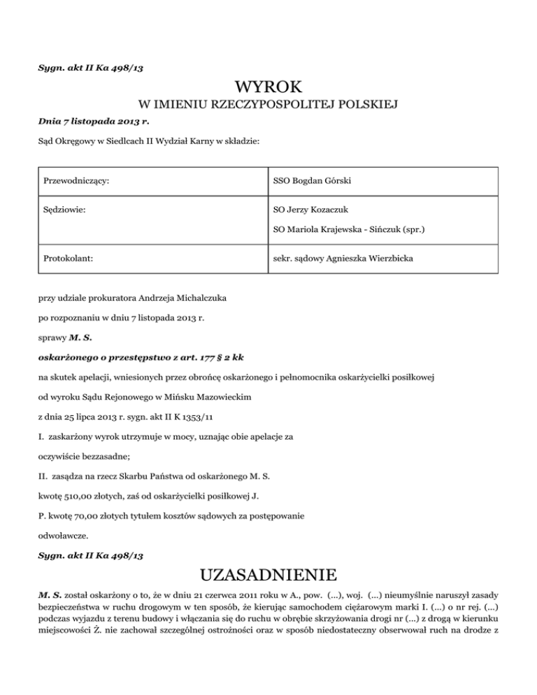 Sygn. akt II Ka 498/13 WYROK W IMIENIU RZECZYPOSPOLITEJ POLSKIEJ Dnia 7 listopada 2013 r. Sąd Okręgowy w Siedlcach II Wydział Karny w składzie: Przewodniczący: SSO Bogdan Górski Sędziowie: SO Jerzy Kozaczuk SO Mariola Krajewska - Sińczuk (spr.) Protokolant: sekr. sądowy Agnieszka Wierzbicka przy udziale prokuratora Andrzeja Michalczuka po rozpoznaniu w dniu 7 listopada 2013 r. sprawy M. S. oskarżonego o przestępstwo z art. 177 § 2 kk na skutek apelacji, wniesionych przez obrońcę oskarżonego i pełnomocnika oskarżycielki posiłkowej od wyroku Sądu Rejonowego w Mińsku Mazowieckim z dnia 25 lipca 2013 r. sygn. akt II K 1353/11 I. zaskarżony wyrok utrzymuje w mocy, uznając obie apelacje za oczywiście bezzasadne; II. zasądza na rzecz Skarbu Państwa od oskarżonego M. S. kwotę 510,00 złotych, zaś od oskarżycielki posiłkowej J. P. kwotę 70,00 złotych tytułem kosztów sądowych za postępowanie odwoławcze. Sygn. akt II Ka 498/13 UZASADNIENIE M. S. został oskarżony o to, że w dniu 21 czerwca 2011 roku w A., pow. (...), woj. (...) nieumyślnie naruszył zasady bezpieczeństwa w ruchu drogowym w ten sposób, że kierując samochodem ciężarowym marki I. (...) o nr rej. (...) podczas wyjazdu z terenu budowy i włączania się do ruchu w obrębie skrzyżowania drogi nr (...) z drogą w kierunku miejscowości Ż. nie zachował szczególnej ostrożności oraz w sposób niedostateczny obserwował ruch na drodze z pierwszeństwem przejazdu, w następstwie czego nie zauważył jadącego drogą z pierwszeństwem przejazdu rowerzysty A. P. i podczas włączania się do ruchu najechał na znajdującego się przed przednią maską pojazdu I. rowerzystę, a następnie kontynuował jazdę ciągnąc pod kołami i podwoziem pojazdu A. P., który w wyniku wypadku doznał obrażeń ciała w postaci oparzeń ran mnogich okolic ciała, rozległych ubytków powłok w obrębie tylnej powierzchni tułowia, otwartego złamania kości stopy prawej, rozejścia spojenia łonowego, rozerwania krezki jelita, krwiaka jamy opłucnowej i odmy urazowej skutkujących jego zgonem w dniu 22 lipca 2011r., tj. o czyn z art. 177 § 2 kk. Wyrokiem z dnia 25 lipca 2013 roku Sąd Rejonowy w Mińsku Mazowieckim: I. oskarżonego M. S. uznał za winnego tego, że w dniu 21 czerwca 2011 roku w A., pow. (...), woj. (...) nieumyślnie naruszył zasady bezpieczeństwa w ruchu drogowym w ten sposób, że kierując samochodem ciężarowym marki I. (...) o nr rej. (...) podczas wyjazdu z terenu budowy i włączania się do ruchu w obrębie skrzyżowania drogi nr (...) z drogą w kierunku miejscowości Ż. nie zachował szczególnej ostrożności oraz w sposób niedostateczny obserwował ruch na drodze z pierwszeństwem przejazdu, w następstwie czego nie zauważył jadącego drogą z pierwszeństwem przejazdu rowerzysty A. P., który znajdował się w stanie nietrzeźwości z wynikiem badania 0,84 promila alkoholu etylowego we krwi i zderzył się z tym rowerzystą, a następnie kontynuował jazdę ciągnąc go pod pojazdem, w wyniku czego A. P. doznał obrażeń ciała między innymi w postaci: rozległych otwartych ran mnogich ciała, otwartego złamania kości stopy prawej, rozerwania krezki jelita, krwiaka jamy opłucnowej i odmy urazowej, rozerwania więzozrostu stawu krzyżowobiodrowego prawego, złamania wyrostków poprzecznych lędźwiowego odcinka kręgosłupa, a w dalszym następstwie niewydolności wielonarządowej w przebiegu uogólnionego zakażenia organizmu, skutkujących jego zgonem w dniu 22 lipca 2011r., tj. czynu stanowiącego występek z art. 177 § 2 kk i za czyn ten na podstawie tego przepisu skazał go i wymierzył mu karę 1 roku i 6 miesięcy pozbawienia wolności; II. na podstawie art. 69 § 1 i 2 kk i art. 70 § 1 pkt 1 kk wykonanie orzeczonej oskarżonemu kary pozbawienia wolności warunkowo zawiesił na okres próby wynoszący 4 lata; III. na podstawie art. 71 § 1 kk orzekł wobec oskarżonego grzywnę w wysokości 100 stawek dziennych, przyjmując na podstawie art. 33 § 3 kk, iż jedna stawka dzienna jest równoważna kwocie 20 złotych; IV. na podstawie art. 46 § kk orzekł od oskarżonego na rzecz osoby uprawnionej – oskarżyciela posiłkowego J. P. kwotę 10.000 zł tytułem zadośćuczynienia za doznaną krzywdę; V. zasądził od oskarżonego na rzecz J. P. kwotę 1343,16 zł tytułem poniesionych przez nią kosztów zastępstwa procesowego w sprawie, a także zasądził od oskarżonego na rzecz Skarbu Państwa kwotę 2.000 zł tytułem zwrotu części kosztów sądowych, zwalniając jednocześnie oskarżonego od zapłaty pozostałych wydatków i w tym zakresie przejmując je na rachunek Skarbu Państwa oraz zwalniając go od uiszczenia opłaty na rzecz Skarbu Państwa. Apelacje od tego wyroku wnieśli: obrońca oskarżonego i pełnomocnik oskarżycielki posiłkowej. Obrońca oskarżonego na podstawie art. 427 § 1 kpk i art. 438 pkt 1 i 2 kpk zaskarżył to orzeczenie w całości, zarzucając mu obrazę przepisów prawa: I. materialnego, a to art. 177 § 2 kk poprzez jego nieprawidłową subsumcję względem ujawnionego stanu faktycznego poprzez ustalenie, iż oskarżony M. S. wyczerpał dyspozycję wyżej wskazanej normy prawnej; II. procesowego, a to: 1. art. 5 § 2 kpk poprzez jego niezastosowanie i nierozstrzygnięcie niedających się usunąć wątpliwości na korzyść oskarżonego M. S. w sytuacji, gdy zgromadzone w postępowaniu sądowym dowody nie potwierdzają zaistnienia zarzucanego oskarżonemu czynu określonego w art. 177 § 2 kk, jak również nie pozwalają na ustalenie zakresu winy i tym samym odpowiedzialności tegoż oskarżonego; 2. art. 92 kpk przez pominięcie okoliczności przemawiających na korzyść oskarżonego M. S., a to : zeznań świadka A. W. (1) złożonych w postępowaniu przygotowawczym w tej części, w której świadek obserwował zatrzymanie pojazdu kierowanego przez oskarżonego po zjechaniu z trasy (...) na drogę prowadzącą do mie