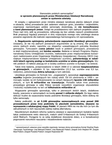 Stanowisko polskich samorządów1 w sprawie planowanych przez Ministerstwo Edukacji Narodowej zmian w systemie oświaty W związku z ogłoszeniem przez ministra edukacji narodowej planów dalszych zmian w oświacie, której prowadzenie jest zadaniem własnym gmin, powiatów i województw, organizacje reprezentujące polskie samorządy stwierdzają, że nie konsultowano z nami planowanych zmian. Dotąd nie przedstawiono nam żadnych projektów ustaw. Prace nad nimi, jeśli są prowadzone, odbywają się bez udziału naszych przedstawicieli. Brak propozycji regulacji prawnych w dniu rozpoczęcia nowego roku szkolnego stwarza poważne zagrożenie dla realności zapowiadanego harmonogramu ich wprowadzania. 1. Negatywnie opiniujemy potwierdzenie zapowiedzi likwidacji gimnazjów. Uważamy, że nie ma żadnych poważnych argumentów za tą zmianą. Nie przedstawiono żadnych analiz, raportów czy ekspertyz uzasadniających potrzebę likwidacji gimnazjów. Tymczasem ocena jakości nauki w polskich gimnazjach, prowadzona w skali międzynarodowej, jest bardzo wysoka. Badania w ramach Programu Międzynarodowej Oceny Umiejętności Uczniów, realizowane przez międzynarodowe konsorcjum nadzorowane przez Organizację Współpracy Gospodarczej i Rozwoju OECD (największe międzynarodowe badanie umiejętności uczniów), potwierdzają w ostatnich latach ogromy postęp w kształceniu uczniów w wieku gimnazjalnym. Wyniki polskich 15-latków plasują ich w ścisłej czołówce uczniów w Europie i na świecie. Także inne badania, przeprowadzone w latach 2008-13 w zakresie bezpieczeństwa w gimnazjach, z udziałem 31 tys. respondentów (21,5 tys. uczniów oraz 9,5 tys. rodziców), potwierdzają dobrą sytuację w tym zakresie. Likwidacja gimnazjów (w formule tzw. „wygaszania”), spowoduje zaprzepaszczenie wysiłku organów prowadzących ten rodzaj szkół. Od ich utworzenia w 1999 r. samorządy wydały na ich funkcjonowanie (w cenach bieżących) łącznie 130 miliardów złotych, w tym 8 miliardów na inwestycje. Ponadto także inne podmioty prowadzące gimnazja w całej Polsce (przede wszystkim organizacje obywatelskie i kościoły) wydatkowały na ten cel kilkanaście miliardów zł. Wygaszanie gimnazjów spowoduje, tylko w pierwszych dwóch latach, dodatkowe koszty, szacowne w samorządach na kwotę ponad 1 miliarda złotych. Do tego należy doliczyć trudne do oszacowania koszty pośrednie likwidacji gimnazjów, które dotkną nie tylko samorządy. Należy podkreślić, że aż 3.100 gimnazjów samorządowych oraz ponad 200 prowadzonych przez inne podmioty to placówki samodzielne, skazane na wymazanie z edukacyjnej mapy Polski. W planach MEN nie ma dla nich (w tym dla zatrudnionych w nich nauczycieli) żadnej realnej alternatywy. Nieuniknionym skutkiem reformy systemu edukacji w zapowiedzianym kształcie będzie także zredukowanie wielu obecnych, małych szkół 6-klasowych do funkcji 4-klasowych szkół filialnych. Pociągnie to za sobą dodatkowe dowożenie dzieci, a w konsekwencji pogorszenie warunków nauczania i niezadowolenie rodziców. reprezentowanych ustawowo przez wszystkie organizacje, tworzące stronę samorządową Komisji Wspólnej Rządu i Samorządu Terytorialnego: Unię Metropolii Polskich, Unię Miasteczek Polskich, Związek Gmin Wiejskich RP, Związek Miast Polskich, Związek Powiatów Polskich i Związek Województw RP. 1 2. Opinie formułowane w ramach debaty nad stanem polskiej oświaty formułują tezę, że młodzież kończąca naukę w szkołach średnich, nie jest wystarczająco przygotowana do podejmowania studiów i do sprostania wymogom oraz oczekiwaniom rynku pracy. Jeśli tak rzeczywiście jest, trzeba wskazać przyczyny takiego stanu rzeczy. Nie jest on spowodowany strukturą szkolnictwa ani jakością pracy nauczycieli czy zaangażowania uczniów. Przyczyną jest nieodpowiedni program nauczania, zwłaszcza w szkołach średnich, w tym zawodowych, ustalany odgórnie przez resort edukacji. 3. Podkreślamy, że w ostatnim czasie przeprowadzono już inne zmiany w polskiej oświacie, także bez konsultacji z samorządami a nawet wbrew naszym opiniom. Pierwszą z nich było cofnięcie obowiązku szkolnego dla sześciolatków i przywrócenie go dla siedmiolatków, z możliwością podjęcia przez rodziców decyzji o wysłaniu dziecka do szkoły w wieku 6 lat. Nie jesteśmy przeciwni, by o tym decydowali rodzice. Wręcz odwrotnie, to środowiska samorządowe postulowały taką zmianę, zanim została ona wprowadzona. Jednakże, sposób przeprowadzenia tej zmiany spowodował w wielu miejscach brak miejsc w przedszkolach, a także negatywne skutki finansowe dla gmin w wysokości 222,5 mln zł (różnica między „utraconą” subwencją szkolną na ucznia a dotacją na przedszkolaka). Wprawdzie MEN zapowiada objęcie sześciolatków w przedszkolach częścią oświatową subwencji ogólnej, jednak w projekcie budżetu państwa na rok 2017 nie ma środków na ten cel. 4. Nie akceptujemy dokonanych ostatnio zmian w ustawie o systemie oświaty, które uzależniają decyzje samorządów dotyczące sieci szkół od zgody kuratora. Powoduje to w istocie przeniesienie decyzji na organ, który nie ponosi żadnej odpowiedzialności, w tym finansowej, za realizację zadań dotyczących prowadzenia szkół. Uważamy, że zmiany w systemie oświaty wprowadzać należy z rozwagą, kierując się dobrem dzieci i młodzieży oraz troską o jakość nauczania. Powinny one wynikać z uzgodnień ze środowiskami rodziców, nauczycieli i samorządów terytorialnych, które w ostatecznym rozrachunku ponoszą odpowiedzialność za realizację zadań oświatowych w gminach, powiatach i województwach. Warszawa, 31 sierpnia 2016 r.