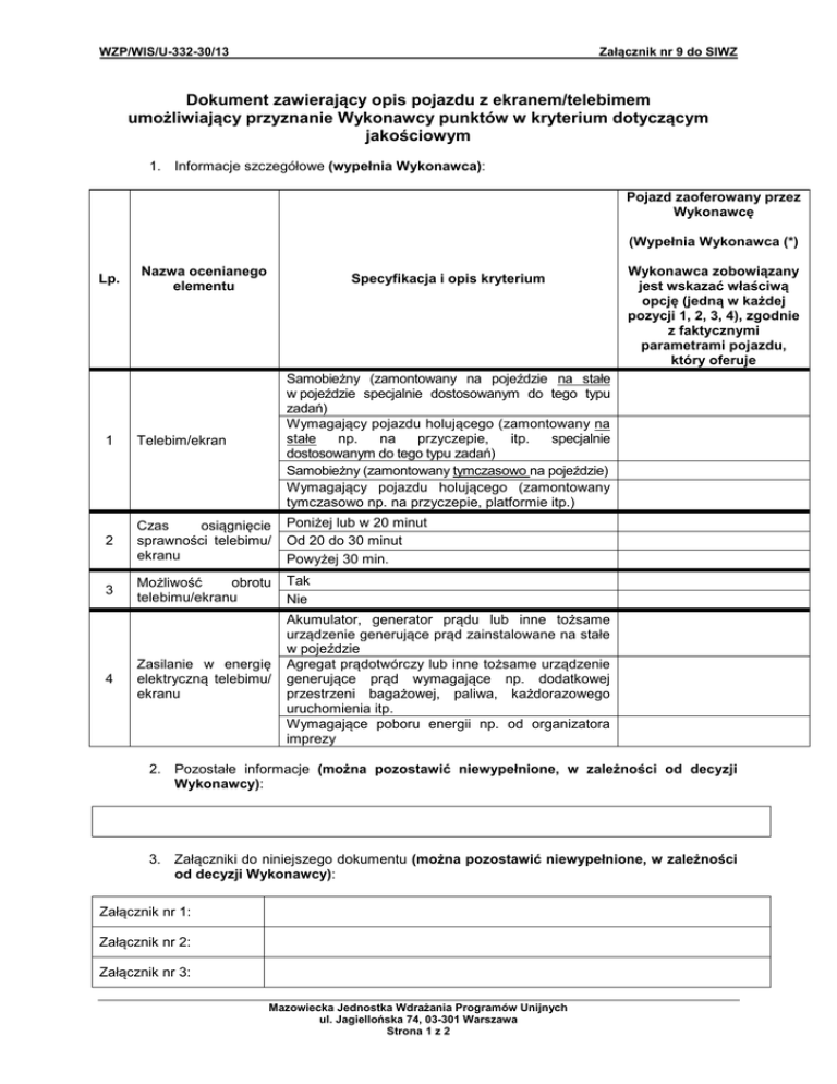 WZP/WIS/U-332-30/13 Załącznik nr 9 do SIWZ Dokument zawierający opis pojazdu z ekranem/telebimem umożliwiający przyznanie Wykonawcy punktów w kryterium dotyczącym jakościowym 1. Informacje szczegółowe (wypełnia Wykonawca): Pojazd zaoferowany przez Wykonawcę (Wypełnia Wykonawca (*) Lp. Nazwa ocenianego elementu Specyfikacja i opis kryterium 1 Telebim/ekran Samobieżny (zamontowany na pojeździe na stałe w pojeździe specjalnie dostosowanym do tego typu zadań) Wymagający pojazdu holującego (zamontowany na stałe np. na przyczepie, itp. specjalnie dostosowanym do tego typu zadań) Samobieżny (zamontowany tymczasowo na pojeździe) Wymagający pojazdu holującego (zamontowany tymczasowo np. na przyczepie, platformie itp.) 2 Czas osiągnięcie sprawności telebimu/ ekranu Poniżej lub w 20 minut Od 20 do 30 minut Powyżej 30 min. 3 Możliwość obrotu telebimu/ekranu Tak Nie Zasilanie w energię elektryczną telebimu/ ekranu Akumulator, generator prądu lub inne tożsame urządzenie generujące prąd zainstalowane na stałe w pojeździe Agregat prądotwórczy lub inne tożsame urządzenie generujące prąd wymagające np. dodatkowej przestrzeni bagażowej, paliwa, każdorazowego uruchomienia itp. Wymagające poboru energii np. od organizatora imprezy 4 Wykonawca zobowiązany jest wskazać właściwą opcję (jedną w każdej pozycji 1, 2, 3, 4), zgodnie z faktycznymi parametrami pojazdu, który oferuje 2. Pozostałe informacje (można pozostawić niewypełnione, w zależności od decyzji Wykonawcy): 3. Załączniki do niniejszego dokumentu (można pozostawić niewypełnione, w zależności od decyzji Wykonawcy): Załącznik nr 1: Załącznik nr 2: Załącznik nr 3: Mazowiecka Jednostka Wdrażania Programów Unijnych ul. Jagiellońska 74, 03-301 Warszawa Strona 1 z 2 WZP/WIS/U-332-30/13 Załącznik nr 9 do SIWZ 4. Uwagi: 1) Pola oznaczone (*) muszą zostać wypełnione przez Wykonawcę. Wykonawca zobowiązany jest podać wymaganą informację. 2) Brak wskazania wymaganych informacji, może skutkować przyznaniem 0 punktów za dany parametr lub odrzucenie oferty Wykonawcy, z uwagi na fakt, iż jej treść nie będzie odpowiadać SIWZ, z zastrzeżeniem art. 87 ustawy P.z.p. ___________________________________ Podpis Wykonawcy lub upoważnionego przedstawiciela Mazowiecka Jednostka Wdrażania Programów Unijnych ul. Jagiellońska 74, 03-301 Warszawa Strona 2 z 2