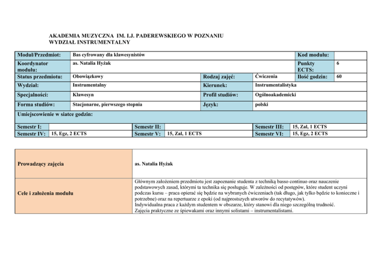 AKADEMIA MUZYCZNA IM. I.J. PADEREWSKIEGO W POZNANIU WYDZIAŁ INSTRUMENTALNY Moduł/Przedmiot: Bas cyfrowany dla klawesynistów Kod modułu: Koordynator modułu: Status przedmiotu: as. Natalia Hyżak Obowiązkowy Rodzaj zajęć: Ćwiczenia Punkty ECTS: Ilość godzin: Wydział: Instrumentalny Kierunek: Instrumentalistyka Specjalności: Klawesyn Profil studiów: Ogólnoakademicki Forma studiów: Stacjonarne, pierwszego stopnia Język: polski 6 60 Umiejscowienie w siatce godzin: Semestr I: Semestr IV: 15, Egz, 2 ECTS Prowadzący zajęcia Cele i założenia modułu Semestr II: Semestr V: 15, Zal, 1 ECTS Semestr III: Semestr VI: 15, Zal, 1 ECTS 15, Egz, 2 ECTS as. Natalia Hyżak Głównym założeniem przedmiotu jest zapoznanie studenta z techniką basso continuo oraz nauczenie podstawowych zasad, którymi ta technika się posługuje. W zależności od postępów, które student uczyni podczas kursu – praca opierać się będzie na wybranych ćwiczeniach (tak długo, jak tylko będzie to konieczne i potrzebne) oraz na repertuarze z epoki (od najprostszych utworów do recytatywów). Indywidualna praca z każdym studentem w obszarze, który stanowi dla niego szczególną trudność. Zajęcia praktyczne ze śpiewakami oraz innymi solistami – instrumentalistami. Wymagania wstępne Podstawowe wiadomości z dziedziny harmonii, umiejętność grania na instrumencie klawiszowym. TREŚCI PROGRAMOWE MODUŁU (przedmiotu) Semestr I Sprawdzenie, jaki poziom realizacji basu cyfrowanego posiada student. Podstawowe wiadomości na temat basso continuo – historia, teoria, praktyka. Realizacji ćwiczeń – możliwie najwięcej. Realizacja ćwiczeń a vista. Semestr II Realizacja basso continuo w konkretnych utworach – najlepiej związanych z programem, zadanym przez pedagoga na zespole kameralnym. Realizacja ćwiczeń a vista. Praca nad indywidualnymi problemami studenta. Przygotowanie do egzaminu. Semestr III Powtórzenie oraz sprawdzenie wiadomości. Praca z solistami, głównie instrumentalistami. Realizacja ćwiczeń a vista. Wprowadzenie realizacji recytatywów – omówienie specyfiki wykonawczej i najważniejszych problemów. Praca nad indywidualnymi problemami studenta. Liczba godzin 15 1 4 6 4 15 4 4 5 2 15 1 4 4 2 4 Semestr IV Nadal – realizacja ćwiczeń (do przygotowania), ćwiczeń a vista oraz repertuaru. Praca z solistami: wokalistami, instrumentalistami. Praca nad realizacją recytatywów. Praca nad indywidualnymi problemami studenta. Przygotowanie do egzaminu. 15 3 4 3 3 2 Wiedza (W) Kod efekt u EFEKTY KSZTAŁCENIA MODUŁU (przedmiotu) W01 Student posiada wiedzę, umożliwiającą docieranie do niezbędnych informacji, pomocnych w realizacji basso continuo. W02 Student charakteryzuje główne cechy dobrej realizacji basso continuo. W03 U02 Student posiada podstawowe wiadomości w zakresie praktycznego wykorzystania wiedzy o harmonii oraz zdolność analizowania swojej realizacji basso continuo pod tym właśnie kątem. Student posiada podstawowe umiejętności kształtowania i tworzenia realizacji basso continuo, umożliwiające odejście od zapisanego tekstu nutowego. Student reaguje na propozycje solisty, z którym współpracuje. U03 Student potrafi rozpoznawać materiał muzyczny i odpowiednio operować nim w swojej realizacji basso continuo. U01 Umiejętnoś ci (U) Efekt kształcenia w obszarze kształcenia K_W04 K_W07 K_W13 K_U16 K_U08 K_U14 Metody kształcenia Metody weryfikacji efektów kształcenia Forma i warunki zaliczenia przedmiotu wykład problemowy wykład konwersatoryjny praca z tekstem i dyskusja rozwiązywanie zadań artystycznych praca indywidualna praca w grupach sesje rozwiązywania problemu Wymagania końcowe – zaliczenie roku, forma oceny egzamin praktyczny (obserwacja wykonawstwa) przesłuchanie (wykonawstwo) realizacja zleconego zadania Nr efektu W01 W01 W01 W02 W02 W02 W03 W03 W03 U01 U01 U01 U02 U02 U02 U03 U03 U03 Warunki zaliczenia: Zaliczenie przedmiotu uwarunkowane jest uczęszczaniem na zajęcia (kontrola obecności) oraz osiągnięciem założonych efektów kształcenia (w minimalnym akceptowalnym stopniu – w wysokości powyżej 50%). Warunki egzaminu: Warunkiem przystąpienia do egzaminu jest uzyskanie zaliczenia z przedmiotu. Warunkiem zdania egzaminu jest uzyskanie więcej niż 50% przewidzianych punktów. Skala ocen w systemie punktów 0-25 obowiązująca w AM w Poznaniu. Inne: Semestr I: Semestr II: Semestr III: Semestr IV: Semestr V: Semestr VI: Zaliczenie Egzamin Zaliczenie Egzamin NAKŁAD PRACY STUDENTA – ILOŚĆ PUNKTÓW ECTS Ilość godzin: Godziny realizowane przy bezpośrednim udziale nauczyciela akademickiego Ilość godzin samodzielnej pracy studenta w czasie trwania przedmiotu Zajęcia dydaktyczne: Konsultacje Ilość godzin egzaminu Suma: 60 8 4 72 Przygotowywanie się do zajęć Przygotowywanie się do ostatecznego zaliczenia/zdania egzaminu Przygotowywanie się do prezentacji w czasie trwania semestru Suma: 74 18 16 108 Inne Sumaryczny nakład pracy: 180 Punkty ECTS: 2 0,27 0,13 2,4 (40,00%) 2,47 0,6 0,53 3,6 (60,00 %) 6 Literatura podstawowa Bourmayan, Frisch Podręcznik do nauki basu cyfrowanego. J. B. Christensen 18h Century Continuo Playing. A Historical Guide to the Basics, tłum. J. B. Robinson, wyd. Barenreiter 2002. J.-F. Dandrieu Principes de l’Accompagnement du Clavecin, 1719 r., wyd. Minkoff Reprint, Geneve 1972. H. Grabner Generalbassubungen, wyd. Fr. Kistner & C. F. W. Siegel & Co., Koln 1970. Literatura uzupełniająca Jak realizować basso continuo? pod red. Z. Szweykowskiego, wyd. Musica Iagellonica, Kraków 1997. F. Wesołowski Basso continuo. Teoria i praktyka, Łódź 2002. Biblioteki wirtualne i zasoby on-line MOŻLIWOŚCI KARIERY ZAWODOWEJ Kurs basu cyfrowanego na studiach pierwszego stopnia ma wprowadzić pojęcie basso continuo, zapoznać studenta z najważniejszymi zasadami tej techniki tak, aby po dwuletnim kursie student realizował partię basso continuo a vista w łatwiejszych utworach z epoki baro