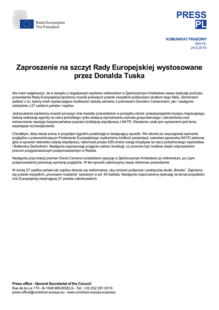 Rada Europejska The President PRESS PL KOMUNIKAT PRASOWY 384/16 24.6.2016 Zaproszenie na szczyt Rady Europejskiej wystosowane przez Donalda Tuska Nie mam wątpliwości, że w związku z negatywnym wynikiem referendum w Zjednoczonym Królestwie nasze dyskusje podczas posiedzenia Rady Europejskiej będziemy musieli poświęcić przede wszystkim politycznym skutkom tego faktu. Zamierzam zadbać o to, byśmy mieli wystarczające możliwości debaty zarówno z premierem Davidem Cameronem, jak i następnie oddzielnie z 27 szefami państw i rządów. Jednocześnie będziemy musieli poruszyć inne kwestie przewidziane w porządku obrad: przezwyciężanie kryzysu migracyjnego, dalszą realizację agendy na rzecz jednolitego rynku służącą stymulowaniu wzrostu gospodarczego i zatrudnienia oraz wzmacnianie naszego bezpieczeństwa poprzez ściślejszą współpracę z NATO. Stawienie czoła tym wyzwaniom jest teraz ważniejsze niż kiedykolwiek. Chciałbym, żeby nasze prace w przyszłym tygodniu przebiegły w następujący sposób. We wtorek po zwyczajowej wymianie poglądów z przewodniczącym Parlamentu Europejskiego wysłuchamy krótkich prezentacji: sekretarz generalny NATO zabierze głos w sprawie natowsko-unijnej współpracy, natomiast prezes EBI omówi swoją inicjatywę na rzecz południowego sąsiedztwa i Bałkanów Zachodnich. Następnie zaproponuję przyjęcie całości konkluzji, co powinno być możliwe dzięki odpowiednim pracom przygotowawczym przeprowadzonym w Radzie. Następnie przy kolacji premier David Cameron przedstawi sytuację w Zjednoczonym Królestwie po referendum, po czym przeprowadzimy pierwszą wymianę poglądów. W ten sposób zakończymy nasze wtorkowe posiedzenie. W środę 27 szefów państw lub rządów zbierze się nieformalnie, aby omówić polityczne i praktyczne skutki „Brexitu”. Zajmiemy się przede wszystkim „procesem rozstania” opisanym w art. 50 traktatu. Następnie rozpoczniemy dyskusję na temat przyszłości Unii Europejskiej obejmującej 27 państw członkowskich. Press office - General Secretariat of the Council Rue de la Loi 175 - B-1048 BRUSSELS - Tel.: +32 (0)2 281 6319 [email protected] - www.consilium.europa.eu/press