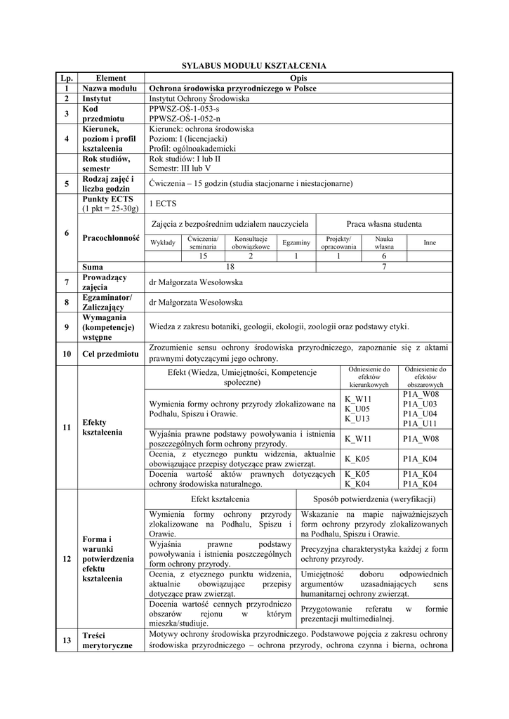 Lp. 1 2 3 4 5 Element Nazwa modułu Instytut Kod przedmiotu Kierunek, poziom i profil kształcenia Rok studiów, semestr Rodzaj zajęć i liczba godzin Punkty ECTS (1 pkt = 25-30g) SYLABUS MODUŁU KSZTAŁCENIA Opis Ochrona środowiska przyrodniczego w Polsce Instytut Ochrony Środowiska PPWSZ-OŚ-1-053-s PPWSZ-OŚ-1-052-n Kierunek: ochrona środowiska Poziom: I (licencjacki) Profil: ogólnoakademicki Rok studiów: I lub II Semestr: III lub V Ćwiczenia – 15 godzin (studia stacjonarne i niestacjonarne) 1 ECTS Zajęcia z bezpośrednim udziałem nauczyciela 6 Pracochłonność Wykłady Ćwiczenia/ seminaria Konsultacje obowiązkowe Egzaminy Projekty/ opracowania Nauka własna 2 1 1 6 7 15 7 8 9 10 Suma Prowadzący zajęcia Egzaminator/ Zaliczający Wymagania (kompetencje) wstępne Cel przedmiotu Praca własna studenta 18 dr Małgorzata Wesołowska dr Małgorzata Wesołowska Wiedza z zakresu botaniki, geologii, ekologii, zoologii oraz podstawy etyki. Zrozumienie sensu ochrony środowiska przyrodniczego, zapoznanie się z aktami prawnymi dotyczącymi jego ochrony. Efekt (Wiedza, Umiejętności, Kompetencje społeczne) Wymienia formy ochrony przyrody zlokalizowane na Podhalu, Spiszu i Orawie. 11 Efekty kształcenia Wyjaśnia prawne podstawy powoływania i istnienia poszczególnych form ochrony przyrody. Ocenia, z etycznego punktu widzenia, aktualnie obowiązujące przepisy dotyczące praw zwierząt. Docenia wartość aktów prawnych dotyczących ochrony środowiska naturalnego. Efekt kształcenia 12 Forma i warunki potwierdzenia efektu kształcenia 13 Treści merytoryczne Inne Odniesienie do efektów kierunkowych Odniesienie do efektów obszarowych K_W11 K_U05 K_U13 P1A_W08 P1A_U03 P1A_U04 P1A_U11 K_W11 P1A_W08 K_K05 P1A_K04 K_K05 K_K04 P1A_K04 P1A_K04 Sposób potwierdzenia (weryfikacji) Wymienia formy ochrony przyrody Wskazanie na mapie najważniejszych zlokalizowane na Podhalu, Spiszu i form ochrony przyrody zlokalizowanych Orawie. na Podhalu, Spiszu i Orawie. Wyjaśnia prawne podstawy Precyzyjna charakterystyka każdej z form powoływania i istnienia poszczególnych ochrony przyrody. form ochrony przyrody. Ocenia, z etycznego punktu widzenia, Umiejętność doboru odpowiednich aktualnie obowiązujące przepisy argumentów uzasadniających sens dotyczące praw zwierząt. humanitarnej ochrony zwierząt. Docenia wartość cennych przyrodniczo Przygotowanie referatu w formie obszarów rejonu w którym prezentacji multimedialnej. mieszka/studiuje. Motywy ochrony środowiska przyrodniczego. Podstawowe pojęcia z zakresu ochrony środowiska przyrodniczego – ochrona przyrody, ochrona czynna i bierna, ochrona przedmiotu 14 Wykaz literatury podstawowej 15 Wykaz literatury uzupełniającej (pomocniczej) ścisła, ochrona częściowa, ekosystem, ochrona środowiska, ekologia, populacja i inne. Prawne aspekty ochrony środowiska przyrodniczego – ustawa o ochronie przyrody, prawo ochrony środowiska, ustawa o ochronie zwierząt oraz związane z nimi rozporządzenia. Omówienie poszczególnych form ochrony przyrody wraz z ich przykładami z województwa małopolskiego. Struktura organizacji ochrony przyrody w Polsce. Korytarze ekologiczne – bariery naturalne i antropogeniczne, metody wyznaczania korytarzy ekologicznych, przykłady korytarzy ekologicznych w Małopolsce. Prawa zwierząt – etyczne i prawne podejście do tematu. Ochrona środowiska przyrodniczego przed zanieczyszczeniami. Podstawowe, aktualne akty prawne: 1. Ustawa z dnia 27 kwietnia 2001 r. 2. Prawo ochrony środowiska. (Dz.U. 2001 nr 62 poz. 627), 3. Ustawa z dnia 16 kwietnia 2004 r. o ochronie przyrody (Dz.U. 2004 nr 92 poz. 880), 4. Ustawa z dnia 21 sierpnia 1997 r. o ochronie zwierząt (Dz.U. 1997 nr 111 poz. 724) 5. Rozporządzenie Ministra Środowiska z dnia 9 lipca 2004 r. w sprawie gatunków dziko występujących roślin objętych ochroną (Dz.U. 2004 Nr 168, poz. 1764), 6. Rozporządzenie Ministra Środowiska z dnia 9 lipca 2004 r. w sprawie gatunków dziko występujących grzybów objętych ochroną (Dz.U. 2004 Nr 168, poz. 1765), 7. Rozporządzenie Ministra Środowiska z dnia 28 września 2004 r. w sprawie gatunków dziko występujących zwierząt objętych ochroną (Dz.U. 2004 Nr 220, poz. 2237) 1. Kazimierczakowa R., Zarzycki K., (red.). 2001. Polska czerwona księga roślin. IB PAN, Kraków. 2. Perzanowska J., Makomaska-Juchiweicz M., Cierlik G., Król W., Tworek S., Kotońska B., Okarma H. 2005. Korytarze ekologiczne w Małopolsce. Instytut Nauk o Środowisku UJ, Instytut Ochrony Przyrody PAN. Kraków.