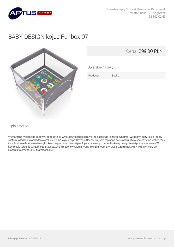 Sklep dziecięcy Smykuś Remigiusz Kaczmarek ul. Nowotoruńska 12, Bydgoszcz 52 362 02 63 BABY DESIGN kojec Funbox 07 Cena: 299,00 PLN Opis słownikowy Producent Espiro Opis produktu Wymarzone miejsce do zabawy i odpoczynku. Wyjątkowy design sprawia, że pasuje do każdego wnętrza. Wygodny, duży kojec Prosty system składania i rozkładania oraz niewielkie wymiary po złożeniu Boczne wejście zapinane na suwak ułatwia samodzielne wchodzenie i wychodzenie Miękki materacyk z kolorowymi obrazkami stymulującymi rozwój dziecka Unikalny design i estetyczne wykonanie W komplecie torba do wygodnego przenoszenia i przechowywania Waga 10,85kg Wymiary: wys.80,5cm szer.105 x 105 Wymiary po złożeniu 97cmx24,5x23 Materac 98x98 Plik wygenerowano: 07-03-2017 Powered by TCPDF (www.tcpdf.org) Oprogramowanie sklepu: AptusShop