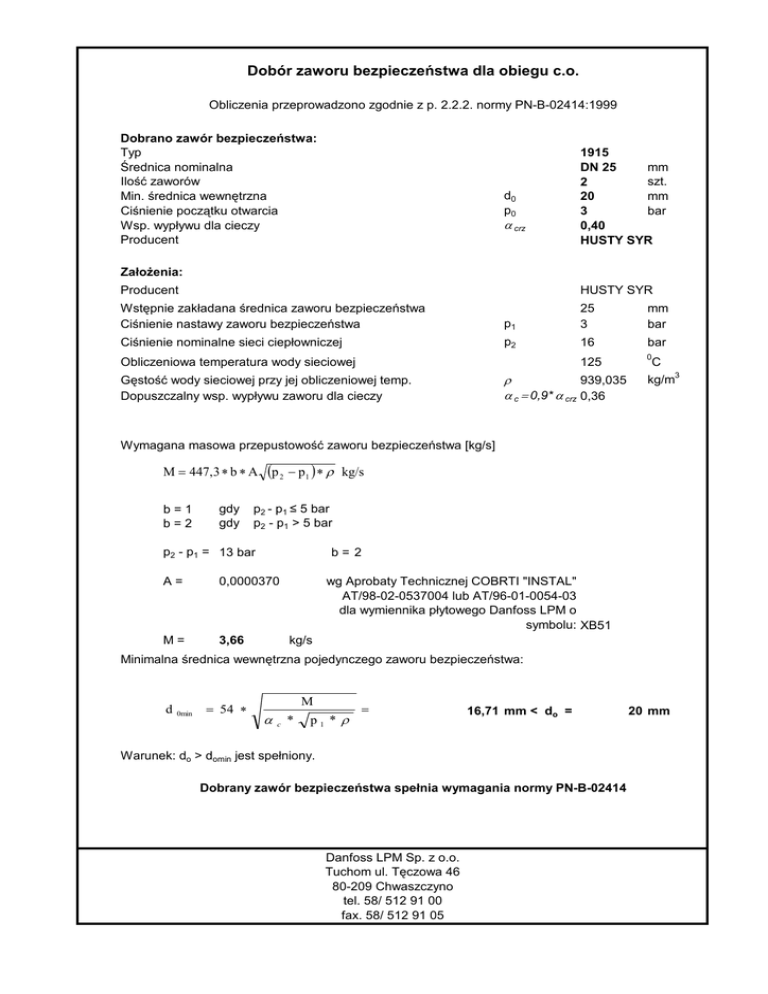 Dobór zaworu bezpieczeństwa dla obiegu c.o. Obliczenia przeprowadzono zgodnie z p. 2.2.2. normy PN-B-02414:1999 Dobrano zawór bezpieczeństwa: Typ Średnica nominalna Ilość zaworów Min. średnica wewnętrzna Ciśnienie początku otwarcia Wsp. wypływu dla cieczy Producent d0 p0 α crz 1915 mm DN 25 szt. 2 mm 20 bar 3 0,40 HUSTY SYR ZałoŜenia: Producent HUSTY SYR Wstępnie zakładana średnica zaworu bezpieczeństwa Ciśnienie nastawy zaworu bezpieczeństwa p1 25 3 Ciśnienie nominalne sieci ciepłowniczej p2 16 bar 125 0 Obliczeniowa temperatura wody sieciowej ρ 939,035 α c = 0,9* α crz 0,36 Gęstość wody sieciowej przy jej obliczeniowej temp. Dopuszczalny wsp. wypływu zaworu dla cieczy mm bar C 3 kg/m Wymagana masowa przepustowość zaworu bezpieczeństwa [kg/s] M = 447,3 ∗ b ∗ A b=1 b=2 gdy gdy (p 2 − p1 ) ∗ ρ kg/s p2 - p1 ≤ 5 bar p2 - p1 > 5 bar p2 - p1 = 13 bar b= 2 A= 0,0000370 M= 3,66 wg Aprobaty Technicznej COBRTI "INSTAL" AT/98-02-0537004 lub AT/96-01-0054-03 dla wymiennika płytowego Danfoss LPM o symbolu: XB51 kg/s Minimalna średnica wewnętrzna pojedynczego zaworu bezpieczeństwa: d 0min = 54 ∗ M α c * p1 * ρ = 16,71 mm < do = Warunek: do > domin jest spełniony. Dobrany zawór bezpieczeństwa spełnia wymagania normy PN-B-02414 Danfoss LPM Sp. z o.o. Tuchom ul. Tęczowa 46 80-209 Chwaszczyno tel. 58/ 512 91 00 fax. 58/ 512 91 05 20 mm