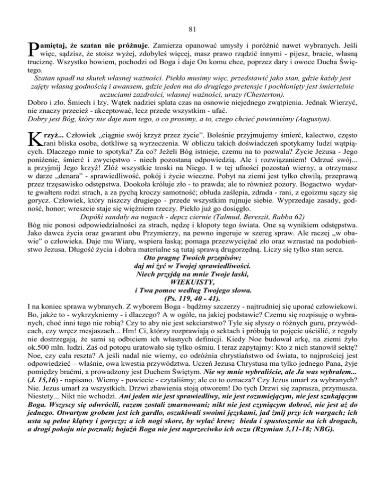 81 P amiętaj, że szatan nie próżnuje. Zamierza opanować umysły i poróżnić nawet wybranych. Jeśli więc, sądzisz, że stoisz wyżej, zdobyłeś więcej, masz prawo rządzić innymi - pijesz, bracie, własną truciznę. Wszystko bowiem, pochodzi od Boga i daje On komu chce, poprzez dary i owoce Ducha Świętego. Szatan upadł na skutek własnej ważności. Piekło musimy więc, przedstawić jako stan, gdzie każdy jest zajęty własną godnością i awansem, gdzie jeden ma do drugiego pretensje i pochłonięty jest śmiertelnie uczuciami zazdrości, własnej ważności, urazy (Chesterton). Dobro i zło. Śmiech i łzy. Wątek nadziei splata czas na osnowie niejednego zwątpienia. Jednak Wierzyć, nie znaczy przecież - akceptować, lecz przede wszystkim - ufać. Dobry jest Bóg, który nie daje nam tego, o co prosimy, a to, czego chcieć powinniśmy (Augustyn). K rzyż... Człowiek „ciągnie swój krzyż przez życie”. Boleśnie przyjmujemy śmierć, kalectwo, często rani bliska osoba, dotkliwe są wyrzeczenia. W obliczu takich doświadczeń spotykamy ludzi wątpiących. Dlaczego mnie to spotyka? Za co? Jeżeli Bóg istnieje, czemu na to pozwala? Życie Jezusa - Jego poniżenie, śmierć i zwycięstwo - niech pozostaną odpowiedzią. Ale i rozwiązaniem! Odrzuć swój... a przyjmij Jego krzyż! Złóż wszystkie troski na Niego. I w tej ufności pozostań wierny, a otrzymasz w darze „denara” - sprawiedliwość, pokój i życie wieczne. Pobyt na ziemi jest tylko chwilą, przeprawą przez trzęsawisko odstępstwa. Dookoła króluje zło - to prawda; ale to również pozory. Bogactwo wydarte gwałtem rodzi strach, a za pychą kroczy samotność; obłuda zaślepia, zdrada - rani, z egoizmu sączy się gorycz. Człowiek, który niszczy drugiego - przede wszystkim rujnuje siebie. Wyprzedaje zasady, godność, honor; wreszcie staje się więźniem rzeczy. Piekło już go dosięgło. Dopóki sandały na nogach - depcz ciernie (Talmud, Bereszit, Rabba 62) Bóg nie ponosi odpowiedzialności za strach, nędzę i kłopoty tego świata. One są wynikiem odstępstwa. Jako dawca życia oraz gwarant obu Przymierzy, na pewno ingeruje w szereg spraw. Ale raczej „w obawie” o człowieka. Daje mu Wiarę, wspiera łaską; pomaga przezwyciężać zło oraz wzrastać na podobieństwo Jezusa. Długość życia i dobra materialne są tutaj sprawą drugorzędną. Liczy się tylko stan serca. Oto pragnę Twoich przepisów; daj mi żyć w Twojej sprawiedliwości. Niech przyjdą na mnie Twoje łaski, WIEKUISTY, i Twa pomoc według Twojego słowa. (Ps. 119, 40 - 41). I na koniec sprawa wybranych. Z wyborem Boga - bądźmy szczerzy - najtrudniej się uporać człowiekowi. Bo, jakże to - wykrzykniemy - i dlaczego? A w ogóle, na jakiej podstawie? Czemu się rozpisuję o wybranych, choć inni tego nie robią? Czy to aby nie jest sekciarstwo? Tyle się słyszy o różnych guru, przywódcach, czy wręcz mesjaszach... Hm! Ci, którzy rozprawiają o sektach i próbują to pojęcie uściślić, z reguły nie dostrzegają, że sami są odbiciem ich własnych definicji. Kiedy Noe budował arkę, na ziemi żyło ok.500 mln. ludzi. Zaś od potopu uratowało się tylko ośmiu. I teraz zapytajmy: Kto z nich stanowił sektę? Noe, czy cała reszta? A jeśli nadal nie wiemy, co odróżnia chrystiaństwo od świata, to najprościej jest odpowiedzieć – właśnie, owa kwestia przywództwa. Uczeń Jezusa Chrystusa ma tylko jednego Pana, żyje pomiędzy braćmi, a prowadzony jest Duchem Świętym. Nie wy mnie wybraliście, ale Ja was wybrałem... (J. 15,16) - napisano. Wiemy - powiecie - czytaliśmy; ale co to oznacza? Czy Jezus umarł za wybranych? Nie. Jezus umarł za wszystkich. Drzwi zbawienia stoją otworem! Do tych Drzwi się zaprasza, przymusza. Niestety... Nikt nie wchodzi. Ani jeden nie jest sprawiedliwy, nie jest rozumiejącym, nie jest szukającym Boga. Wszyscy się odwrócili, razem zostali zmarnowani; nikt nie jest czyniącym dobroć, nie jest aż do jednego. Otwartym grobem jest ich gardło, oszukiwali swoimi językami, jad żmij przy ich wargach; ich usta są pełne klątwy i goryczy; a ich nogi skore, by wylać krew; bieda i spustoszenie na ich drogach, a drogi pokoju nie poznali; bojaźń Boga nie jest naprzeciwko ich oczu (Rzymian 3,11-18; NBG).