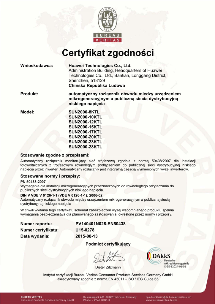 Certyfikat zgodności Wnioskodawca: Huawei Technologies Co., Ltd. Administration Building, Headquarters of Huawei Technologies Co., Ltd., Bantian, Longgang District, Shenzhen, 518129 Chińska Republika Ludowa Produkt: automatyczny rozłącznik obwodu między urządzeniem mikrogeneracyjnym a publiczną siecią dystrybucyjną niskiego napięcia Model: SUN2000-8KTL SUN2000-10KTL SUN2000-12KTL SUN2000-15KTL SUN2000-17KTL SUN2000-20KTL SUN2000-23KTL SUN2000-28KTL Stosowanie zgodne z przepisami: Automatyczny rozłącznik monitorujący sieć trójfazową zgodnie z normą 50438:2007 dla instalacji fotowoltaicznych z trójfazowym równoległym podłączeniem do publicznej sieci dystrybucyjnej niskiego napięcia przez inwerter. Automatyczny rozłącznik jest integralną częścią wymienionych wyżej inwerterów. Stosowane normy i przepisy: PN 50438:2007 Wymagania dla instalacji mikrogeneracyjnych przeznaczonych do równoległego przyłączania do publicznych sieci dystrybucyjnych niskiego napięcia. DIN V VDE V 0126-1-1 (VDE V 0126-1-1): 2006-02 Automatyczny rozłącznik obwodu między urządzeniem mikrogeneracyjnym a publiczną siecią dystrybucyjną niskiego napięcia W chwili wydania tego certyfikatu schemat zabezpieczeń wyżej wspomnianego produktu spełnia wymagania bezpieczeństwa dla planowanego zastosowania, określone przez normy i przepisy. Numer raportu: Numer certyfikatu: Data wydania: PV140401N028-EN50438 U15-0278 2015-08-13 Podmiot certyfikujący Dieter Zitzmann Instytut certyfikacji Bureau Veritas Consumer Products Services Germany GmbH akredytowany zgodnie z normą EN 45011 - ISO / IEC Guide 65