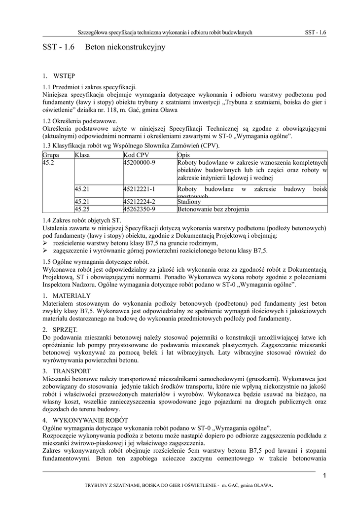 Szczegółowa specyfikacja techniczna wykonania i odbioru robót budowlanych SST - 1.6 SST - 1.6 Beton niekonstrukcyjny 1. WSTĘP 1.1 Przedmiot i zakres specyfikacji. Niniejsza specyfikacja obejmuje wymagania dotyczące wykonania i odbioru warstwy podbetonu pod fundamenty (ławy i stopy) obiektu trybuny z szatniami inwestycji „Trybuna z szatniami, boiska do gier i oświetlenie” działka nr. 118, m. Gać, gmina Oława 1.2 Określenia podstawowe. Określenia podstawowe użyte w niniejszej Specyfikacji Technicznej są zgodne z obowiązującymi (aktualnymi) odpowiednimi normami i określeniami zawartymi w ST-0 „Wymagania ogólne”. 1.3 Klasyfikacja robót wg Wspólnego Słownika Zamówień (CPV). Grupa Klasa Kod CPV Opis 45.2 45200000-9 Roboty budowlane w zakresie wznoszenia kompletnych obiektów budowlanych lub ich części oraz roboty w zakresie inżynierii lądowej i wodnej 45.21 45212221-1 45.21 45.25 45212224-2 45262350-9 Roboty budowlane w zakresie sportowych Stadiony Betonowanie bez zbrojenia budowy boisk 1.4 Zakres robót objętych ST. Ustalenia zawarte w niniejszej Specyfikacji dotyczą wykonania warstwy podbetonu (podłoży betonowych) pod fundamenty (ławy i stopy) obiektu, zgodnie z Dokumentacją Projektową i obejmują: rozścielenie warstwy betonu klasy B7,5 na gruncie rodzimym, zagęszczenie i wyrównanie górnej powierzchni rozścielonego betonu klasy B7,5. 1.5 Ogólne wymagania dotyczące robót. Wykonawca robót jest odpowiedzialny za jakość ich wykonania oraz za zgodność robót z Dokumentacją Projektową, ST i obowiązującymi normami. Ponadto Wykonawca wykona roboty zgodnie z poleceniami Inspektora Nadzoru. Ogólne wymagania dotyczące robót podano w ST-0 „Wymagania ogólne”. 1. MATERIAŁY Materiałem stosowanym do wykonania podłoży betonowych (podbetonu) pod fundamenty jest beton zwykły klasy B7,5. Wykonawca jest odpowiedzialny ze spełnienie wymagań ilościowych i jakościowych materiału dostarczanego na budowę do wykonania przedmiotowych podłoży pod fundamenty. 2. SPRZĘT. Do podawania mieszanki betonowej należy stosować pojemniki o konstrukcji umożliwiającej łatwe ich opróżnianie lub pompy przystosowane do podawania mieszanek plastycznych. Zagęszczanie mieszanki betonowej wykonywać za pomocą belek i łat wibracyjnych. Łaty wibracyjne stosować również do wyrównywania powierzchni betonu. 3. TRANSPORT Mieszanki betonowe należy transportować mieszalnikami samochodowymi (gruszkami). Wykonawca jest zobowiązany do stosowania jedynie takich środków transportu, które nie wpłyną niekorzystnie na jakość robót i właściwości przewożonych materiałów i wyrobów. Wykonawca będzie usuwać na bieżąco, na własny koszt, wszelkie zanieczyszczenia spowodowane jego pojazdami na drogach publicznych oraz dojazdach do terenu budowy. 4. WYKONYWANIE ROBÓT Ogólne wymagania dotyczące wykonania robót podano w ST-0 „Wymagania ogólne”. Rozpoczęcie wykonywania podłoża z betonu może nastąpić dopiero po odbiorze zagęszczenia podkładu z mieszanki żwirowo-piaskowej i jej właściwego zagęszczenia. Zakres wykonywanych robót obejmuje rozścielenie 5cm warstwy betonu B7,5 pod ławami i stopami fundamentowymi. Beton ten zapobiega ucieczce zaczynu cementowego w trakcie betonowania 1 TRYBUNY Z SZATNIAMI, BOISKA DO GIER I OŚWIETLENIE - m. GAĆ, gmina OŁAWA. Szczegółowa specyfikacja techniczna wykonania i odbioru robót budowlanych SST - 1.6 fundamentów oraz ułatwia ułożenie zbrojenia. Powierzchnię górną można wyrównywać również przez ściągnięcie łatą wyrównawczą. 5. KONTROLA JAKOŚCI ROBÓT Ogólne zasady kontroli jakości robót podano w ST2.4 – dla betonu konstrukcyjnego. Rozpoczęcie wykonania podłoża z betonu może nastąpić dopiero po odbiorze zagęszczenia gruntu. Przy sprawdzeniu stanu gruntów w podłożu należy stosować makroskopowe metody badań gruntów zgodnie z aktualnie obowiązującymi normami. Badania składników betonu powinny być wykonywane przed przystąpieniem do przygotowania mieszanki betonowej i prowadzone systematycznie przez cały czas trwania robót betonowych. W przeciętnych warunkach wykonania betonu zakres kontroli powinien obejmować wszystkie wymagane normami właściwości betonu. Wykonywanie mieszanki betonowej powinno być kontrolowane na bieżąco. Kontroli powinny podlegać parametry, od których zależy jakość betonu. Należy sprawdzić zgodność z Projektem pod względem kształtu, wymiarów i rzędnych ułożonej warstwy betonu. Dopuszczalne odchyłki wymiarowe: głębokość nie więcej niż 20mm wymiary w planie nie więcej niż 30mm usytuowanie nie więcej niż 50mm 6. OBMIAR ROBÓT Ogólne zasady i wymagania dotyczące obmiaru robót podano w ST-0 „Wymagania ogólne”. Obmiar robót określa ilość wykonanych robót zgodnie z Dokumentacją Projektową i postanowieniami Umowy. Jednostką obmiarową dla podłoży betonowych jest 1m2 betonu. 7. ODBIÓR ROBÓT Ogólne warunki odbioru podano w ST-0 „Wymagania ogólne”. Celem odbioru jest protokolarne dokonanie finalnej oceny rzeczywistego wykonania robót w odniesieniu do ich ilości, jakości i wartości. Odbiorom podlegają: dostarczona na plac budowy gotowa mieszanka betonowa beton wykonanych elementów. 8. PODSTAWA PŁATNOŚCI Ogólne wymagania dotyczące płatności podano w ST-0 „Wymagania ogólne”. Płatności należy przyjmować zgodnie z obmiarem i oceną jakości robót, w oparciu o wyniki pomiarów. Należy wykonać zakres robót wymieniony w pkt. 1.4 niniejszej ST, zgodnie z Dokumentacją projektową. 9. DOKUMENTY ODNIESIENIA Dokumentami odniesienia są Polskie Normy, Aprobaty techniczne i Dokumentacja Projektowa. 1) PN-EN 206-1:2003 Beton. Część 1: Wymagania, właściwości, produkcja i zgodność 2) PN-88/B-06250 Beton zwykły 3) PN-63/B-06251 Roboty betonowe i żelbetowe. Wymagania techniczne 4) PN-EN 197-1:2002 Cement. Część 1: Skład, wymagania i kryteria zgodności dotycząc