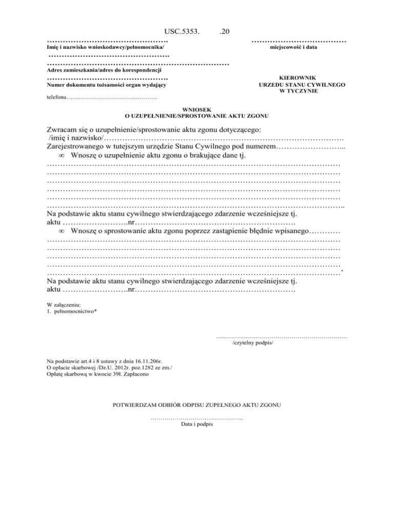 USC.5353. ………………………………………. .20 ……………………………… Imię i nazwisko wnioskodawcy/pełnomocnika/ miejscowość i data ………………………………………. …………………………………………………………… Adres zamieszkania/adres do korespondencji ………………………………………. KIEROWNIK URZEDU STANU CYWILNEGO W TYCZYNIE Numer dokumentu tożsamości organ wydający telefonu………………………………………. WNIOSEK O UZUPEŁNIENIE/SPROSTOWANIE AKTU ZGONU Zwracam się o uzupełnienie/sprostowanie aktu zgonu dotyczącego: /imię i nazwisko/………………………………………………………………………………. Zarejestrowanego w tutejszym urzędzie Stanu Cywilnego pod numerem……………………... • Wnoszę o uzupełnienie aktu zgonu o brakujące dane tj. ………………………………………………………………………………………………… ………………………………………………………………………………………………… ………………………………………………………………………………………………… ………………………………………………………………………………………………… ………………………………………………………………………………………………… ………………………………………………………………………………………………….. Na podstawie aktu stanu cywilnego stwierdzającego zdarzenie wcześniejsze tj. aktu …………………….nr……………………………………………………. • Wnoszę o sprostowanie aktu zgonu poprzez zastąpienie błędnie wpisanego………… ………………………………………………………………………………………………… ………………………………………………………………………………………………… ………………………………………………………………………………………………… ………………………………………………………………………………………………… …………………………………………………………………………………………………’ Na podstawie aktu stanu cywilnego stwierdzającego zdarzenie wcześniejsze tj. aktu …………………….nr……………………………………………………. W załączeniu: 1. pełnomocnictwo* ………………………………………………………… /czytelny podpis/ Na podstawie art.4 i 8 ustawy z dnia 16.11.206r. O opłacie skarbowej /Dz.U. 2012r. poz.1282 ze zm./ Opłatę skarbową w kwocie 39ł. Zapłacono POTWIERDZAM ODBIÓR ODPISU ZUPEŁNEGO AKTU ZGONU ……………………………………….. Data i podpis