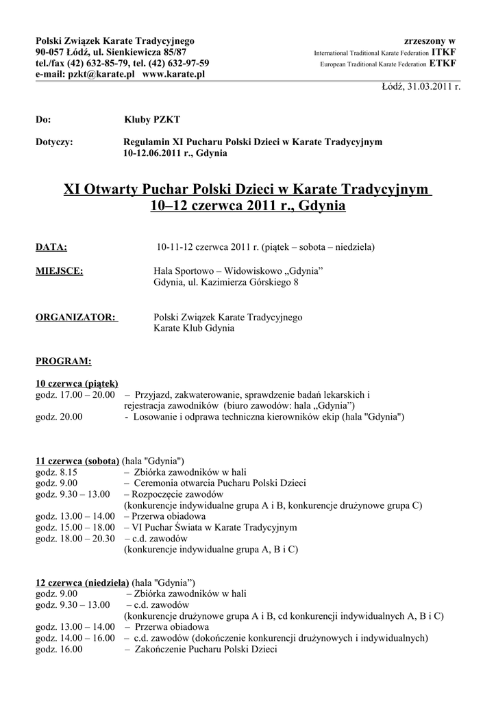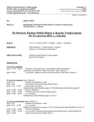 Polski Związek Karate Tradycyjnego 90-057 Łódź, ul. Sienkiewicza 85/87 tel./fax (42) 632-85-79, tel. (42) 632-97-59 e-mail: [email protected] www.karate.pl zrzeszony w ITKF European Traditional Karate Federation ETKF International Traditional Karate Federation Łódź, 31.03.2011 r. Do: Kluby PZKT Dotyczy: Regulamin XI Pucharu Polski Dzieci w Karate Tradycyjnym 10-12.06.2011 r., Gdynia XI Otwarty Puchar Polski Dzieci w Karate Tradycyjnym 10–12 czerwca 2011 r., Gdynia DATA: 10-11-12 czerwca 2011 r. (piątek – sobota – niedziela) MIEJSCE: Hala Sportowo – Widowiskowo „Gdynia” Gdynia, ul. Kazimierza Górskiego 8 ORGANIZATOR: Polski Związek Karate Tradycyjnego Karate Klub Gdynia PROGRAM: 10 czerwca (piątek) godz. 17.00 – 20.00 – Przyjazd, zakwaterowanie, sprawdzenie badań lekarskich i rejestracja zawodników (biuro zawodów: hala „Gdynia”) godz. 20.00 - Losowanie i odprawa techniczna kierowników ekip (hala ''Gdynia'') 11 czerwca (sobota) (hala ''Gdynia'') godz. 8.15 – Zbiórka zawodników w hali godz. 9.00 – Ceremonia otwarcia Pucharu Polski Dzieci godz. 9.30 – 13.00 – Rozpoczęcie zawodów (konkurencje indywidualne grupa A i B, konkurencje drużynowe grupa C) godz. 13.00 – 14.00 – Przerwa obiadowa godz. 15.00 – 18.00 – VI Puchar Świata w Karate Tradycyjnym godz. 18.00 – 20.30 – c.d. zawodów (konkurencje indywidualne grupa A, B i C) 12 czerwca (niedziela) (hala ''Gdynia”) godz. 9.00 – Zbiórka zawodników w hali godz. 9.30 – 13.00 – c.d. zawodów (konkurencje drużynowe grupa A i B, cd konkurencji indywidualnych A, B i C) godz. 13.00 – 14.00 – Przerwa obiadowa godz. 14.00 – 16.00 – c.d. zawodów (dokończenie konkurencji drużynowych i indywidualnych) godz. 16.00 – Zakończenie Pucharu Polski Dzieci KONKURENCJE: Grupa A (7 lat i młodsi) ur. 2004 i młodsi Grupa B (8, 9 lat) ur. 2003, 2002 Grupa C (10, 11, 12 lat) ur. 2001, 2000, 1999 Kata ind. chłopców Kata ind. dziewcząt Kata ind. chłopców Kata ind. dziewcząt Kata ind. chłopców Kata ind. dziewcząt w 3 grupach: 9-7 kyu 6-4 kyu 3-1 kyu w 3 grupach: 9-7 kyu 6-4 kyu 3-1 kyu w 3 grupach: 9-7 kyu 6-4 kyu 3-1 kyu Grupa A i Grupa B (9 lat i młodsi) Grupa C (10,11,12 lat) Kata drużynowe dzieci (zespół może być jednorodny - dziewczęta, chłopcy lub mieszany) Kata drużynowe dziewcząt Kata drużynowe chłopców En-bu dziewczyna/chłopiec En-bu chłopiec/chłopiec En-bu dziewczyna/chłopiec En-bu chłopiec/chłopiec PRZEPISY Grupa A (7 lat i młodsi) ur. 2004 i młodsi Kata: Grupa 9-7 kyu: Grupa 6-4 kyu: Grupa 3-1 kyu: Grupa B (8, 9 lat) ur. 2003, 2002 Grupa C (10, 11, 12 lat) ur. 2001, 2000, 1999 Wykonywane parami, Aka losuje – ocena systemem chorągiewkowym Eliminacje, półfinał i finał: HEIAN 1-2 Eliminacje, półfinał: HEIAN 1-5 finał: HEIAN 4-5 Eliminacje, półfinał: HEIAN 1-5 + BASSAI DAI finał: BASSAI DAI, JION, KANKU DAI, w finale sędzia wybiera kata, dostosowując do niższego stopnia Grupa A i Grupa B ur. 2002 i młodsi Grupa C ur. 2001, 2000, 1999 Kata drużynowe dzieci: Kata drużynowe dziewcząt, HEIAN 1-3 Kata drużynowe chłopców: wystarczy jedno kata, HEIAN 1-5 w finale z bunkai wystarczy jedno kata, eliminacje – ocena systemem chorągiewkowym w finale z bunkai finały i półfinały (m-ca I-VIII) – ocena systemem punktowym eliminacje – ocena systemem chorągiewkowym finały i półfinały (m-ca I–VIII) – ocena systemem punktowym En-bu dziewczyna/chłopiec i chłopiec/chłopiec: (gong w 55sek.i w 65sek.; poza czasem kara) En-bu dziewczyna/chłopiec i chłopiec/chłopiec: (gong w 55sek.i w 65sek.; poza czasem kara) 1. Ilość zawodników z jednego klubu w jednej konkurencji indywidualnej w danej grupie stopni: bez ograniczeń. 2. Konkurencja zostanie rozegrana przy udziale minimum 4 zawodników lub 4 drużyn. Konkurencja zostanie odwołana, kiedy po upłynięciu terminu zgłoszeń na zawody nie będzie wymaganej liczby zawodników lub drużyn, o czym zainteresowane kluby zostaną powiadomione. WARUNKI STARTU DLA ZAWODNIKÓW: 1. Odpowiedni wiek: wg wymienionych roczników. 2. Odpowiedni stopień zarejestrowany w PZKT. 3. Zawodnicy w kategorii wiekowej młodzik 10-11-12 lat zobowiązani są posiadać licencję zawodnika uprawniającą do udziału we współzawodnictwie sportowym. W celu przyznania licencji zawodniczej należy przesłać do Biura Promocji PZKT w Warszawie (ul. Osowska 82) następujące dokumenty: A/ Wniosek o nadanie licencji zawodnika PZKT (W ORYGINALE); formularz wniosku dostępny jest na stronie internetowej www.karate.pl w zakładce Związek – Druki. UWAGA! Prosimy zwrócić uwagę, aby wniosek został podpisany zarówno przez zawodnika, jak i rodzica/ustawowego przedstawiciela w przeznaczonych do tego miejscach. B/ Kserokopię badań od lekarza ze specjalizacją medycyna sportowa lub z certyfikatem Polskiego Towarzystwa Medycyny Sportowej Licencja zawodnika w roku 2011 (ważna 1 stycznia – 31 grudnia 2011 r.) jest bezpłatna. 4. Aktualne badania lekarskie. Zgodnie z informacją Komisji Medycznej PZKT dzieci startujące w Pucharze Polski Dzieci zobowiązane są posiadać następujące badania lekarskie: I. Z klubów, które mają w swoją działalność wpisaną rekreację jako formę ćwiczenia karate: a) dzieci do 9 roku życia włącznie, bez względu na stopień – zaświadczenie dopuszczające do rekreacyjnego uprawiania karate wydane przez dowolnego lekarza (ważne 1 rok), b) dzieci w wieku 10-11-12 – zaświadczenie od lekarza ze specjalizacją medycyny sportowej lub z certyfikatem Polskiego Towarzystwa Medycyny Sportowej (badania ważne 6 miesięcy); badania do licencji zawodniczej. II. Z klubów, które nie mają w statucie wpisanej rekreacji jako formy ćwiczenia karate: wszystkie dzieci, bez względu na wiek - zaświadczenie od lekarza ze specjalizacją medycyny sportowej lub z certyfikatem Polskiego Towarzystwa Medycyny Sportowej (badania ważne 6 miesięcy). 5. Ubezpieczenie NNW. Uwaga! Zgodnie z