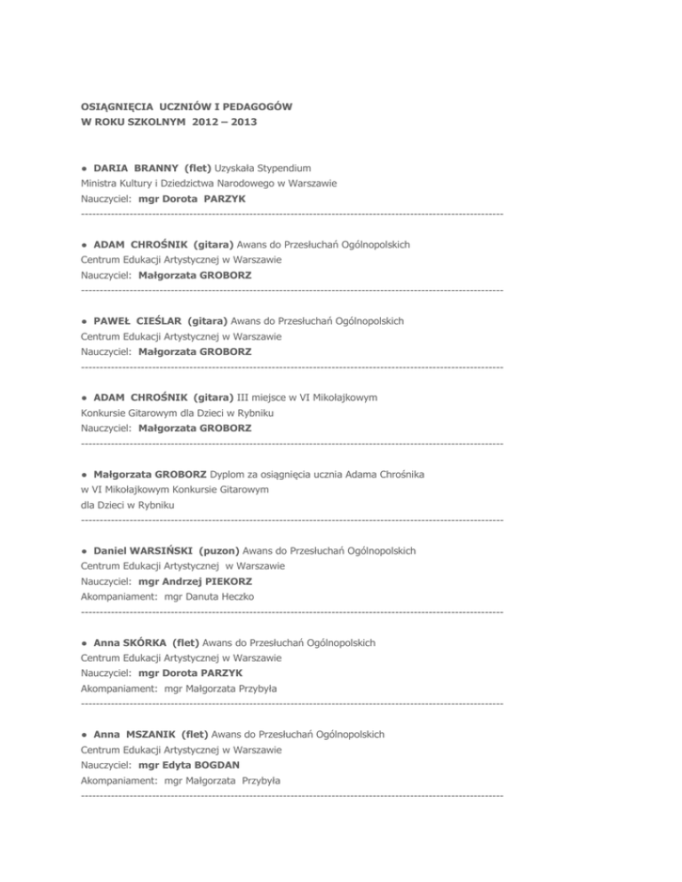 OSIĄGNIĘCIA UCZNIÓW I PEDAGOGÓW W ROKU SZKOLNYM 2012 – 2013 ● DARIA BRANNY (flet) Uzyskała Stypendium Ministra Kultury i Dziedzictwa Narodowego w Warszawie Nauczyciel: mgr Dorota PARZYK ----------------------------------------------------------------------------------------------------------------● ADAM CHROŚNIK (gitara) Awans do Przesłuchań Ogólnopolskich Centrum Edukacji Artystycznej w Warszawie Nauczyciel: Małgorzata GROBORZ ----------------------------------------------------------------------------------------------------------------● PAWEŁ CIEŚLAR (gitara) Awans do Przesłuchań Ogólnopolskich Centrum Edukacji Artystycznej w Warszawie Nauczyciel: Małgorzata GROBORZ ----------------------------------------------------------------------------------------------------------------● ADAM CHROŚNIK (gitara) III miejsce w VI Mikołajkowym Konkursie Gitarowym dla Dzieci w Rybniku Nauczyciel: Małgorzata GROBORZ ----------------------------------------------------------------------------------------------------------------● Małgorzata GROBORZ Dyplom za osiągnięcia ucznia Adama Chrośnika w VI Mikołajkowym Konkursie Gitarowym dla Dzieci w Rybniku ----------------------------------------------------------------------------------------------------------------● Daniel WARSIŃSKI (puzon) Awans do Przesłuchań Ogólnopolskich Centrum Edukacji Artystycznej w Warszawie Nauczyciel: mgr Andrzej PIEKORZ Akompaniament: mgr Danuta Heczko ----------------------------------------------------------------------------------------------------------------● Anna SKÓRKA (flet) Awans do Przesłuchań Ogólnopolskich Centrum Edukacji Artystycznej w Warszawie Nauczyciel: mgr Dorota PARZYK Akompaniament: mgr Małgorzata Przybyła ----------------------------------------------------------------------------------------------------------------● Anna MSZANIK (flet) Awans do Przesłuchań Ogólnopolskich Centrum Edukacji Artystycznej w Warszawie Nauczyciel: mgr Edyta BOGDAN Akompaniament: mgr Małgorzata Przybyła ----------------------------------------------------------------------------------------------------------------- ● Oliwia WANTULOK (flet) Awans do Przesłuchań Ogólnopolskich Centrum Edukacji Artystycznej w Warszawie Nauczyciel: mgr Teresa ZIĘBA – JANASIK Akompaniament: mgr Zuzanna Pradela ----------------------------------------------------------------------------------------------------------------● Mikołaj RUDECKI (flet) Awans do Przesłuchań Ogólnopolskich Centrum Edukacji Artystycznej w Warszawie Nauczyciel: mgr Teresa ZIĘBA – JANASIK Akompaniament: mgr Zuzanna Pradela ----------------------------------------------------------------------------------------------------------------● mgr Dorota PARZYK Wyróżnienie za przygotowanie uczniów do Makroregionalnych Przesłuchań Centrum Edukacji Artystycznej w Katowicach ----------------------------------------------------------------------------------------------------------------● mgr Edyta BOGDAN Wyróżnienie za przygotowanie ucznia do Makroregionalnych Przesłuchań Centrum Edukacji Artystycznej w Katowicach ----------------------------------------------------------------------------------------------------------------● mgr Teresa ZIĘBA – JANASIK Wyróżnienie za przygotowanie uczniów do Makroregionalnych Przesłuchań Centrum Edukacji Artystycznej w Katowicach ----------------------------------------------------------------------------------------------------------------● mgr Andrzej PIEKORZ Wyróżnienie za przygotowanie uczniów do Makroregionalnych Przesłuchań Centrum Edukacji Artystycznej w Katowicach ----------------------------------------------------------------------------------------------------------------● Oliwia WANTULOK (flet) Wyróżnienie w Ogólnopolskich Przesłuchaniach Centrum Edukacji Artystycznej w Warszawie Nauczyciel: mgr Teresa ZIĘBA – JANASIK Akompaniament: mgr Zuzanna Pradela ----------------------------------------------------------------------------------------------------------------● Paweł CIEŚLAR (gitara) III miejsce w Ogólnopolskich Przesłuchaniach Centrum Edukacji Artystycznej w Warszawie Nauczyciel: Małgorzata GROBORZ ----------------------------------------------------------------------------------------------------------------● Adam CHROŚNIK (gitara) Wyróżnienie w Ogólnopolskich Przesłuchaniach Centrum Edukacji Artystycznej w Warszawie Nauczyciel: Małgorzata GROBORZ ----------------------------------------------------------------------------------------------------------------- ● Daria BRANNY (flet) Wyróżnienie w Ogólnopolskim Konkursie Instrumentów Dętych „ Miniatura ” w Bydgoszczy Nauczyciel: mgr Dorota PARZYK Akompaniament: mgr Małgorzata Przybyła ---------------------------------------------------------------------------------------------------------------● Daria BRANNY (flet) Uzyskała prestiżowe stypendium „ Młoda Polska ” Nauczyciel: mgr Dorota PARZYK ----------------------------------------------------------------------------------------------------------------● Daniel WARSIŃSKI (puzon) Wyróżnienie w XII Ogólnopolskim Konkursie Młodych Solistów w Jaworznie Nauczyciel: mgr Andrzej PIEKORZ Akompaniament: mgr Danuta Heczko ----------------------------------------------------------------------------------------------------------------● Maciej RUDECKI (saksofon) II miejsce w X Międzynarodowym Festiwalu Saksofonowym w Przeworsku Nauczyciel: mgr Tomasz GMYREK Akompaniament: mgr Małgorzata Przybyła ----------------------------------------------------------------------------------------------------------------● Blanka KŁAPTOCZ (skrzypce) Wyróżnienie w XII Prezentacjach Miniatur Skrzypcowych w Sieradzu Nauczyciel: mgr Barbara LITWINIUK Akompaniament: mgr Danuta Heczko ----------------------------------------------------------------------------------------------------------------● Maciej RUDECKI (sa