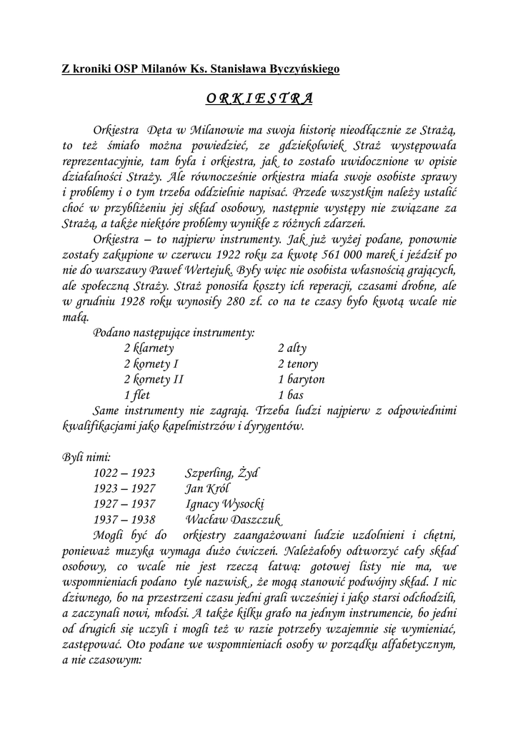 Z kroniki OSP Milanów Ks. Stanisława Byczyńskiego ORKIESTRA Orkiestra Dęta w Milanowie ma swoja historię nieodłącznie ze Strażą, to też śmiało można powiedzieć, ze gdziekolwiek Straż występowała reprezentacyjnie, tam była i orkiestra, jak to zostało uwidocznione w opisie działalności Straży. Ale równocześnie orkiestra miała swoje osobiste sprawy i problemy i o tym trzeba oddzielnie napisać. Przede wszystkim należy ustalić choć w przybliżeniu jej skład osobowy, następnie występy nie związane za Strażą, a także niektóre problemy wynikłe z różnych zdarzeń. Orkiestra – to najpierw instrumenty. Jak już wyżej podane, ponownie zostały zakupione w czerwcu 1922 roku za kwotę 561 000 marek i jeździł po nie do warszawy Paweł Wertejuk. Były więc nie osobista własnością grających, ale społeczną Straży. Straż ponosiła koszty ich reperacji, czasami drobne, ale w grudniu 1928 roku wynosiły 280 zł. co na te czasy było kwotą wcale nie małą. Podano następujące instrumenty: 2 klarnety 2 alty 2 kornety I 2 tenory 2 kornety II 1 baryton 1 flet 1 bas Same instrumenty nie zagrają. Trzeba ludzi najpierw z odpowiednimi kwalifikacjami jako kapelmistrzów i dyrygentów. Byli nimi: 1022 – 1923 Szperling, Żyd 1923 – 1927 Jan Król 1927 – 1937 Ignacy Wysocki 1937 – 1938 Wacław Daszczuk Mogli być do orkiestry zaangażowani ludzie uzdolnieni i chętni, ponieważ muzyka wymaga dużo ćwiczeń. Należałoby odtworzyć cały skład osobowy, co wcale nie jest rzeczą łatwą: gotowej listy nie ma, we wspomnieniach podano tyle nazwisk , że mogą stanowić podwójny skład. I nic dziwnego, bo na przestrzeni czasu jedni grali wcześniej i jako starsi odchodzili, a zaczynali nowi, młodsi. A także kilku grało na jednym instrumencie, bo jedni od drugich się uczyli i mogli też w razie potrzeby wzajemnie się wymieniać, zastępować. Oto podane we wspomnieniach osoby w porządku alfabetycznym, a nie czasowym: Bierzejewski Józef Daniluk Grzegorz Hordejuk Adolf Hordejuk Bolesław Hordejuk Wincenty Jaszczuk Jan Kalinowski Jan Kalinowski Ryszard Kalinowski Stanisław Kalinowski Stanisław II Kałdun Gabriel Kowalik Czesław Kwiatek Bronisław Kwiatek Ignacy Kwiatek Józef Kwiatek Wincenty Matyńkowski Ludwik Ostapiuk Stanisław Siuciak Franciszek Siuciak Ignacy Siuciak Jan Siuciak Piotr Smoliński Bolesław Smoliński Wacław Ściuba Antoni Żelazowski Jan Orkiestra występowała bardzo często, nie tylko ze Strażą, w kościele i defiladach, ale również podczas przedstawień teatralnych przed rozpoczęciem i podczas przerw, gdy zmieniały się dekoracje do nowego aktu, a także na zabawach. Otrzymywała za to suty poczęstunek zakrapiany także alkoholem. Stało się to powodem poważnych niesnasek wówczas, gdy Biskup był obecny na przedstawieniu teatralnym. Nie było bufetu i orkiestra nie otrzymała poczęstunku, zaczęła wiec w sposób gwałtowny domagać się, co wywołało duże zamieszanie, niemal awanturę. Wykrzykującym muzykom odebrano instrumenty, grożąc In całkowitym usunięciem, do czasu zawieszając w działaniu. Sprawa znalazła się na wokandzie narady Zarządu Towarzystwa Straży w dniu 28 maja 1928 roku. Oto dosłowny opis z protokołu: - Po przyjęciu przez obecnych porządku dziennego, skarbnik zdał relacje z dochodu zebranego z przedstawienia, które wykazało 143,90 zł. brutto … - Następnie prezes honorowy p. Niwiński wykazał, jak owocna jest praca sekcji teatralnej, oraz wyraził tej imieniem Zarządu pochwały, przy czym wykazał, jak potrzebny jest nam Dom Ludowy, oraz zapewnienie Zarządu, że będziemy dalej forsownie iść w obranym przez nas kierunku podniesienia i uszlachetnienia ducha. Dalej omawiał p. Niwiński zachowanie się niektórych członków Towarzystwa podczas obecności ks. Biskupa na przedstawieniu, przyczep Zarząd postanowił usunąć szer. R… z szeregów Straży za złe zachowanie się jako obywatel i członek organizacji podczas obecności ks. Biskupa w teatrze, oraz powzięto wniosek udzielenia R … publicznej nagany na ogólnym zebraniu Straży, co zebranie zatwierdziło i poleciło to przeprowadzić naczelnikowi Straży. - Następnie zabrał głos naczelnik Straży przedstawiając faktyczny stan rzeczy co do zawieszenia czasowego orkiestry. P. Niwiński w dalszej dyskusji braki i obowiązki członków orkiestry, że niektórzy orkiestranci pragnęliby szerzyć ferment w orkiestrze, nic więcej. - Kapral Kwiatek otrzymawszy głos wskazał, w jak ciężkich warunkach powstała orkiestra i że dopiero na sam przyjazd Biskupa powstało nieporozumienie. Siuciak zabrał głos podrażniony, że odebrano siłą instrumenty orkiestrze. Wertejuk proponuje sprawę załagodzić i orkiestrę nadal utrzymać i piętnuje muzykantów za to, że domagali się wódki po przedstawieniu i proponuje, ażeby się zrzekli takowej. - P. Niwiński dyskutuje nad kwestią porozumienia i zaznacza że orkiestra jest czynnikiem agitacyjnym i pobudza do życia gromadzkiego i takową trzeba koniecznie utrzymać … - Zarząd naznacza zebranie się orkiestry i Zarządu za dzień 31 bm. celem wspólnego opracowanie regulaminu orkiestry, przyczep ma wyznaczyć 2 członków celem opracowania wzmiankowanego regulaminu z Zarządem Towarzystwa. Instrumenty zaś pozostają nadal złożone aż do dalszego postanowienia … Ostatecznie sprawę kończy posiedzenie Zarządu Towarzystwa dniu 11 grudnia 1926 roku: - orkiestra pozostaje nadal na tych samych warunkach, z wyjątkiem gdy orkiestra wyjeżdża w dalsze strony, będzie otrzymywać, jeśli to będzie dogodniej, pieniądze gotówką na kupno pożywienia … Kapelmistrz Ignacy Wysocki otrzyma za swa pracę 10 zł. miesięcznie. Podczas lekcji orkiestry nie wolno bezinteresownym /nie zainteresowanym/ wchodzić do czytelni, gdzie odbywają się dotychczas lekcje 3 razy w tygodniu. Lokal będzie otwierał i zamykał gospodarz Straży. W protokóle sprawozdawczym za rok