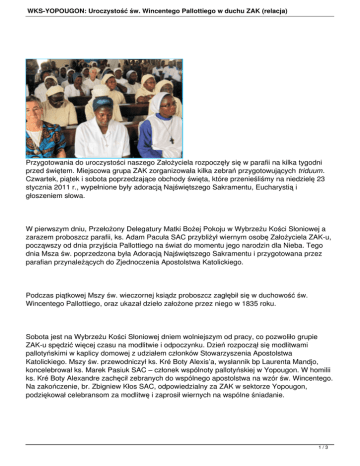 WKS-YOPOUGON: Uroczystość św. Wincentego Pallottiego w duchu ZAK (relacja) Przygotowania do uroczystości naszego Założyciela rozpoczęły się w parafii na kilka tygodni przed świętem. Miejscowa grupa ZAK zorganizowała kilka zebrań przygotowujących triduum. Czwartek, piątek i sobota poprzedzające obchody święta, które przenieśliśmy na niedzielę 23 stycznia 2011 r., wypełnione były adoracją Najświętszego Sakramentu, Eucharystią i głoszeniem słowa. W pierwszym dniu, Przełożony Delegatury Matki Bożej Pokoju w Wybrzeżu Kości Słoniowej a zarazem proboszcz parafii, ks. Adam Pacuła SAC przybliżył wiernym osobę Założyciela ZAK-u, począwszy od dnia przyjścia Pallottiego na świat do momentu jego narodzin dla Nieba. Tego dnia Msza św. poprzedzona była Adoracją Najświętszego Sakramentu i przygotowana przez parafian przynależących do Zjednoczenia Apostolstwa Katolickiego. Podczas piątkowej Mszy św. wieczornej ksiądz proboszcz zagłębił się w duchowość św. Wincentego Pallottiego, oraz ukazał dzieło założone przez niego w 1835 roku. Sobota jest na Wybrzeżu Kości Słoniowej dniem wolniejszym od pracy, co pozwoliło grupie ZAK-u spędzić więcej czasu na modlitwie i odpoczynku. Dzień rozpoczął się modlitwami pallotyńskimi w kaplicy domowej z udziałem członków Stowarzyszenia Apostolstwa Katolickiego. Mszy św. przewodniczył ks. Kré Boty Alexis’a, wysłannik bp Laurenta Mandjo, koncelebrował ks. Marek Pasiuk SAC – członek wspólnoty pallotyńskiej w Yopougon. W homilii ks. Kré Boty Alexandre zachęcił zebranych do wspólnego apostolstwa na wzór św. Wincentego. Na zakończenie, br. Zbigniew Kłos SAC, odpowiedzialny za ZAK w sektorze Yopougon, podziękował celebransom za modlitwę i zaprosił wiernych na wspólne śniadanie. 1/3 WKS-YOPOUGON: Uroczystość św. Wincentego Pallottiego w duchu ZAK (relacja) Następnie podczas konferencji, ks. Marek Pasiuk SAC przedstawił członkom ZAK-u charyzmat Założyciela zwracając uwagę na świadomość pełnej przynależności każdego z nas do dzieła pallotyńskiego. Niedziela, 23 stycznia zgromadziła licznych wiernych z parafii i okolic. Sekretarz biskupa, ks. Kré Boty głosił na mszach św. kazania na temat św. Wincentego Pallottiego i jego dzieła. Na początku każdej Mszy św. członkowie ZAK-u przedstawiali grupę zachęcając innych do przyłączenia się do tego dzieła. Punktem centralnym dnia była uroczysta Msza św., której przewodniczył delegat ordynariusza diecezji Yopougon. Pogarszający sie stan zdrowia bp Laurenta Mandjo nie pozwala mu już na przewodniczenie Mszy św. Pomimo tego zaszczycił on nas swoją obecnością. Po uczcie duchowej, zaproszeni goście, członkowie Zjednoczenia Apostolstwa Katolickiego, najbliżsi współpracownicy pallotynów i Rada parafialna, udali się na uroczysty obiad, który poprzedziła modlitwa i przemowa Przewodniczącego Rady Parafialnej, Léandre Monney. Zwyczajem w parafii, w dniu uroczystości św. Wincentego Pallottiego jest składanie życzeń proboszczowi i jego współpracownikom. Niespodzianką było odśpiewanie pieśni „Otwórzmy serca nasze” przez członków ZAK-u i chęć wstąpienia w jego szeregi ks. Kré Boty Alexandre. Wybrzeże Kości Słoniowej liczy obecnie trzy wspólnoty ZAK-u: w Yamoussoukro, w Grand-Béréby i w Yopugon (dzielnica Abidjanu). Ta ostatnia składa się ze wspólnoty SAK w Yopougon oraz 30 osób świeckich, którzy spotykają sie trzy razy w miesiącu na modlitwie i formacji. Organizowane są też spotkania ogólnokrajowe, na które zjeżdżają się członkowie z całego kraju. Zważywszy jednak na dość krótki czas od założenia ZAK-u i trudną sytuację polityczną w kraju, w zjazdach uczestniczą raczej przedstawiciele wyżej wymienionych grup. Pierwsze próby zorganizowania ZAK-u sięgają początku lat 90-tych. Rozwój nastąpił dopiero w 2004 roku w Yopougon. Duży wkład w rozwój dzieła na tych ziemiach mają ks. Tadeusz Bazan SAC i ks. Côme-Damien Musaviri SAC. Obecnie koordynatorem krajowym ZAK-u jest ks. Zenon Bazan SAC a przewodniczącą na cały kraj Christine Boussou z parafii w Yopougon. 2/3 WKS-YOPOUGON: Uroczystość św. Wincentego Pallottiego w duchu ZAK (relacja) Br. Zbigniew Kłos SAC, Yopougon 3/3