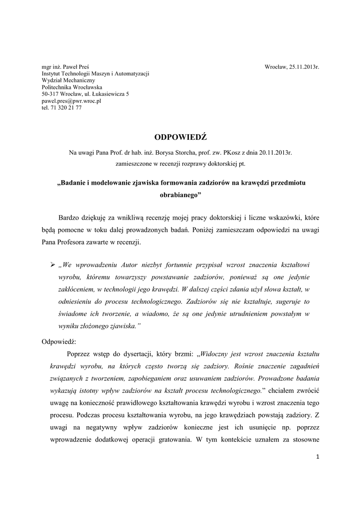 mgr inż. Paweł Preś Instytut Technologii Maszyn i Automatyzacji Wydział Mechaniczny Politechnika Wrocławska 50-317 Wrocław, ul. Łukasiewicza 5 [email protected] tel. 71 320 21 77 Wrocław, 25.11.2013r. ODPOWIEDŹ Na uwagi Pana Prof. dr hab. inż. Borysa Storcha, prof. zw. PKosz z dnia 20.11.2013r. zamieszczone w recenzji rozprawy doktorskiej pt. „Badanie i modelowanie zjawiska formowania zadziorów na krawędzi przedmiotu obrabianego” Bardzo dziękuję za wnikliwą recenzję mojej pracy doktorskiej i liczne wskazówki, które będą pomocne w toku dalej prowadzonych badań. Poniżej zamieszczam odpowiedzi na uwagi Pana Profesora zawarte w recenzji. „We wprowadzeniu Autor niezbyt fortunnie przypisał wzrost znaczenia kształtowi wyrobu, któremu towarzyszy powstawanie zadziorów, ponieważ są one jedynie zakłóceniem, w technologii jego krawędzi. W dalszej części zdania użył słowa kształt, w odniesieniu do procesu technologicznego. Zadziorów się nie kształtuje, sugeruje to świadome ich tworzenie, a wiadomo, że są one jedynie utrudnieniem powstałym w wyniku złożonego zjawiska.” Odpowiedź: Poprzez wstęp do dysertacji, który brzmi: „Widoczny jest wzrost znaczenia kształtu krawędzi wyrobu, na których często tworzą się zadziory. Rośnie znaczenie zagadnień związanych z tworzeniem, zapobieganiem oraz usuwaniem zadziorów. Prowadzone badania wykazują istotny wpływ zadziorów na kształt procesu technologicznego.” chciałem zwrócić uwagę na konieczność prawidłowego kształtowania krawędzi wyrobu i wzrost znaczenia tego procesu. Podczas procesu kształtowania wyrobu, na jego krawędziach powstają zadziory. Z uwagi na negatywny wpływ zadziorów konieczne jest ich usunięcie np. poprzez wprowadzenie dodatkowej operacji gratowania. W tym kontekście uznałem za stosowne 1 sformułowanie poglądu, iż zadziory wpływają na przebieg (kształt) procesu technologicznego wyrobu. „Podobnie niefortunne jest stwierdzenie, że ”Rozwój technik ograniczających negatywny wpływ zadziorów zależy od [3, 38, 44]:”, podobnie wymieniane kolejno modele i dostępne narzędzia numeryczne, nie mają negatywnego wpływu na powstawanie zadziorów, jak to chce Autor. Właściwość związana jest z fizyczną formą przedmiotu, a własność określa przynależność. Odpowiedź: W nadmienionym fragmencie dysertacji wymieniłem obszary, w zakresie, których postęp będzie sprzyjał rozwojowi technik ograniczających wielkość zadziorów (w konsekwencji technik niwelujących negatywny wpływ zadziorów na wyrób). W mojej opinii rozwój modeli numerycznych procesu skrawania, może doprowadzić do poszerzenia wiedzy z zakresu charakteru interakcji pomiędzy różnymi czynnikami wpływającymi na wielkość zadziorów, a w rezultacie do opracowania nowych technik lub metod pozwalających efektywnie ograniczać te zadziory i ich negatywny wpływ. „Zauważalny jest fakt, że Autor nie wyraził swojego zdania w doborze nazwy dla obserwowanego zjawiska.” Odpowiedź: We wprowadzeniu do dysertacji przedstawiłem efekty wykonanego przeglądu literaturowego. Między innymi podałem sześć definicji pojęcia zadzior zamieszczonych w różnych pracach przez cytowanych autorów, posiadających wieloletnie, czasami nawet kilkudziesięcioletnie doświadczenie w zakresie omawianej tematyki. Ten fragment dysertacji podsumowałem definicją pojęcia zadzior przedstawioną w normie BS ISO 13715:2000 „Technical drawings – Edges of undefined shape – Vocabulary and indications.”. Definicję pojęcia zadzior zawartą w tej międzynarodowej normie uznaję za wyczerpującą. 2 „Podane we wzorze (1) wielkości nie zostały zilustrowane pomocniczym rysunkiem a na rysunku 9 nie wskazano wektorów ruchu.” Odpowiedź: Podane we wzorze (1) wielkości przedstawiłem na pomocniczym Rys. 8 oraz dodatkowo opisałem we fragmencie dysertacji znajdującym się pod tym rysunkiem. Rys. 9 przedstawiłem w oryginalnej formie, zgodnie ze sposobem jego przedstawienia w licznych artykułach cytowanego autora publikowanych w renomowanych czasopismach. „Na stronie 11 stwierdzenie, że ”obserwowane jest płynięcie materiału w kierunku przeciwnym do kierunku ruchu narzędzia”, zostało mocno udokumentowane w publikacji ”Distribution of unit forces on the tool nose rounding in the case of constrained Turing”, Borys Storch, Anna Zawada-Tomkiewicz. ELSEVIER International Journal of Machine Tools & Manufacture 57 (2012) 1-9, rys. 10c. Natomiast w pracy "Distribution of unit forces on the tool edge rounding in the case of finishing turning” Borys Storch, Anna Zawada-Tomkiewicz. Int J Adv Manuf Technol (2012) opisano pracę zaokrąglenia krawędzi skrawającej szczególnie w otoczeniu promienia rn. Nie przeceniam wartości tych prac ale mają one podstawowe znaczenie dla dociekań Autora opisywanych w następnych rozdziałach. Praca habilitacyjna o ”Wzajemnym oddziaływaniu naroża ostrza i materiału skrawanego” 1989. Monografie nr. 8, obroniona w ITBM Politechniki Wrocławskiej, czyli 24 lat temu, mogła być przez Autora nie zauważona i w spisie literatury nie uwzględniona. Właśnie w tej pracy na stronach 68 do 73 przedstawiam wyniki obliczeń za pomocą całki brzegowej, nie MES, rozkłady naprężeń i odkształceń w strefie skrawania swobodnego. Dokładnie przybliża to do wyników z pracy [65] tylko inne były wówczas stosowane nazwy (p. rys.26). Przednia granica i tylna granica odkształceń plastycznych w miejsce pierwotnej i wtórnej. Z przeprowadzonych badań wynikało, że przednia wyprzedza, w kierunku skrawania, o 2 krotną wartość grubości warstwy skrawanej, powierzchnię w której działa krawędź skrawająca.” 3 Odpowiedź: W dysertacji z uwagi na obszar tematyczny realizowanych zadań badawczych cytowałem przede wszystkim prace bezpośrednio odnoszące się do procesu formowania zadzioru. Za kluczowe w odniesieniu do tematu dysertacji uznałem 