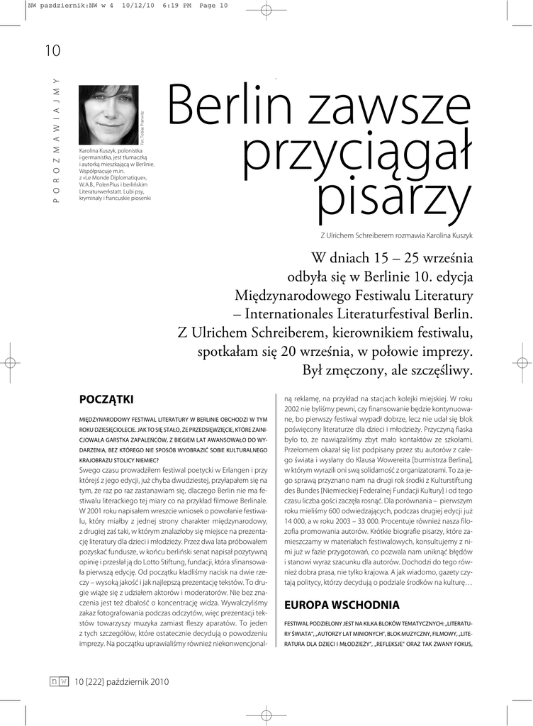 NW pazdziernik:NW w 4 10/12/10 6:19 PM Page 10 Fot. Tobias Pranwitz P O R O Z M A W I A J M Y 10 Karolina Kuszyk, polonistka i germanistka, jest tłumaczką i autorką mieszkającą w Berlinie. Współpracuje m.in. z «Le Monde Diplomatique», W.A.B., PolenPlus i berlińskim Literaturwerkstatt. Lubi psy, kryminały i francuskie piosenki Berlin zawsze przyciągał pisarzy Z Ulrichem Schreiberem rozmawia Karolina Kuszyk W dniach 15 – 25 września odbyła się w Berlinie 10. edycja Międzynarodowego Festiwalu Literatury – Internationales Literaturfestival Berlin. Z Ulrichem Schreiberem, kierownikiem festiwalu, spotkałam się 20 września, w połowie imprezy. Był zmęczony, ale szczęśliwy. POCZĄTKI MIĘDZYNARODOWY FESTIWAL LITERATURY W BERLINIE OBCHODZI W TYM ROKU DZIESIĘCIOLECIE. JAK TO SIĘ STAŁO, ŻE PRZEDSIĘWZIĘCIE, KTÓRE ZAINICJOWAŁA GARSTKA ZAPALEŃCÓW, Z BIEGIEM LAT AWANSOWAŁO DO WYDARZENIA, BEZ KTÓREGO NIE SPOSÓB WYOBRAZIĆ SOBIE KULTURALNEGO KRAJOBRAZU STOLICY NIEMIEC? Swego czasu prowadziłem festiwal poetycki w Erlangen i przy którejś z jego edycji, już chyba dwudziestej, przyłapałem się na tym, że raz po raz zastanawiam się, dlaczego Berlin nie ma festiwalu literackiego tej miary co na przykład filmowe Berlinale. W 2001 roku napisałem wreszcie wniosek o powołanie festiwalu, który miałby z jednej strony charakter międzynarodowy, z drugiej zaś taki, w którym znalazłoby się miejsce na prezentację literatury dla dzieci i młodzieży. Przez dwa lata próbowałem pozyskać fundusze, w końcu berliński senat napisał pozytywną opinię i przesłał ją do Lotto Stiftung, fundacji, która sfinansowała pierwszą edycję. Od początku kładliśmy nacisk na dwie rzeczy – wysoką jakość i jak najlepszą prezentację tekstów. To drugie wiąże się z udziałem aktorów i moderatorów. Nie bez znaczenia jest też dbałość o koncentrację widza. Wywalczyliśmy zakaz fotografowania podczas odczytów, więc prezentacji tekstów towarzyszy muzyka zamiast fleszy aparatów. To jeden z tych szczegółów, które ostatecznie decydują o powodzeniu imprezy. Na początku uprawialiśmy również niekonwencjonal- 10 [222] październik 2010 ną reklamę, na przykład na stacjach kolejki miejskiej. W roku 2002 nie byliśmy pewni, czy finansowanie będzie kontynuowane, bo pierwszy festiwal wypadł dobrze, lecz nie udał się blok poświęcony literaturze dla dzieci i młodzieży. Przyczyną fiaska było to, że nawiązaliśmy zbyt mało kontaktów ze szkołami. Przełomem okazał się list podpisany przez stu autorów z całego świata i wysłany do Klausa Wowereita [burmistrza Berlina], w którym wyrazili oni swą solidarność z organizatorami. To za jego sprawą przyznano nam na drugi rok środki z Kulturstiftung des Bundes [Niemieckiej Federalnej Fundacji Kultury] i od tego czasu liczba gości zaczęła rosnąć. Dla porównania – pierwszym roku mieliśmy 600 odwiedzających, podczas drugiej edycji już 14 000, a w roku 2003 – 33 000. Procentuje również nasza filozofia promowania autorów. Krótkie biografie pisarzy, które zamieszczamy w materiałach festiwalowych, konsultujemy z nimi już w fazie przygotowań, co pozwala nam uniknąć błędów i stanowi wyraz szacunku dla autorów. Dochodzi do tego również dobra prasa, nie tylko krajowa. A jak wiadomo, gazety czytają politycy, którzy decydują o podziale środków na kulturę… EUROPA WSCHODNIA FESTIWAL PODZIELONY JEST NA KILKA BLOKÓW TEMATYCZNYCH: „LITERATURY ŚWIATA”, „AUTORZY LAT MINIONYCH”, BLOK MUZYCZNY, FILMOWY, „LITERATURA DLA DZIECI I MŁODZIEŻY”, „REFLEKSJE” ORAZ TAK ZWANY FOKUS, NW pazdziernik:NW w 4 10/12/10 6:19 PM Page 11 sza, bardziej intensywna niż komunikacja tych krajów z „Zachodem”. Poza tym nie raz mogłem się przekonać, że Europa Wschodnia to chociażby dla wielu Anglików nadal terra incognita, również pod względem literackim. W tłumaczeniu angielskim wychodzi bardzo mało książek z tej części Europy. Z zewnątrz państwa Europy Wschodniej widziane są jako jedna… całość, żeby nie użyć ponownie słowa „blok”. POLITYKA POLITYKĄ, ALE JAK TA EUROPA WSCHODNIA KSZTAŁTUJE SIĘ LITERACKO? CO JĄ ODRÓŻNIA OD LITERATURY POWSTAJĄCEJ W TAK ZWANYCH Fot. ILFB Fot. ILFB KRAJACH ZACHODNICH? CZYLI PRZEGLĄD WSPÓŁCZESNEJ LITERATURY WYBRANEGO OBSZARU. TEGOROCZNY FOKUS ZATYTUŁOWANY JEST „KULTURA I POLITYKA EUROPY WSCHODNIEJ MIĘDZY KOSMOPOLITYZMEM A NACJONALIZMEM, TRISTESSE Jestem bardziej organizatorem festiwalu niż krytykiem, trudno mi więc wniknąć głębiej w materię tych tekstów i wciąż robię sobie wyrzuty, że za dużo organizuję, a za mało czytam. Ale wielu z tych autorów zajmuje się eksploracją ruin pozostawionych przez realny socjalizm. To jedno. Kolejnym wyznacznikiem tematycznym jest pozycja wobec Unii Europejskiej – na przykład pochodząca z Mołdawii Nicoleta Esinencu bada napięcie między krajami byłego bloku sowieckiego, które weszły do Unii, a tymi, które zostały na zewnątrz. Autorzy z Kosowa, serbscy, chorwaccy, albańscy piszą o doświadczeniu wojny w latach dziewięćdziesiątych, jak np. Nicol Ljubić. Pisarzy rosyjskich, Siergieja Minajewa czy Natalię Kluczariową, zajmuje życie w dzisiejszej Rosji, gigantyczne różnice majątkowe, eksplozja milionerów w Moskwie czy losy ludzi na prowincji. Niektóre powieści „Wschodnioeuropejczyków” mają wymiar historyczny, jak na przykład u Radki Denemarkovej z Czech, która porusza temat wypędzenia Niemców z Czech i Słowacji po wojnie. Taki temat nie miałby prawa „przydarzyć się” autorowi niemieckiemu. Rośnie młode pokolenie pisarzy, którzy zajmują miejsce starszych, jak György Konrád, Péter Nádas, Imre Kertész. Ci młodzi są z sukcesem tłumaczeni w Niemczech i mam nadzieję, że w przyszłości dostrzeże ich także szersza „zagranica”, również ta za oceanem. A NOWĄ RADOŚCIĄ ŻYCIA”. EUROPA WSCHODNIA TO KATEGORI