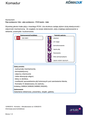 Komadur Asortyment Płyty syntetyczne i folie :: płyty syntetyczne :: PCW twarde :: białe Wysokiej jakości białe płyty z twardego PCW. Lita struktura nadaje płytom dużą elastyczność i odporność mechaniczną. Ze względu na swoje właściwości, płyty znajdują zastosowanie w reklamie, przemyśle i budownictwie. Zastosowania/Certyfikaty: ISO 9001 Techniki zadruku: sitodruk UV inkjet termofomowanie cięcie piłą frezowanie folia samoprzylepna cięcie nożem ręcznym Zalety produktu - wytrzymały mechanicznie, - termoplastyczny, - odporny chemicznie - niska absorpcja wilgoci, - łatwy w obróbce, - możliwość sprowadzenia płyt kolorowych pod zamówienie klienta, - Komadur D dedykowany do zadruku, (indeksy:349624,349628,349660,350240). Zastosowanie Galanteria reklamowa, prezentery, stojaki, gabloty. 12/06/2015 - Komadur - Aktualizowane na 12/06/2015 Informacje poza kontraktowe Strona 1 /2 Komadur Odpowiednie techniki Techniki zadruku: - sitodruk (po przygotowaniu) - inkjet: UV, solvent, latex (po przygotowaniu) Wykończenie i obróbka: - termoformowanie (wytłaczanie, zaginanie) - cięcie - frezowanie - grawerowanie - wiercenie 12/06/2015 - Komadur - Aktualizowane na 12/06/2015 Informacje poza kontraktowe Strona 2 /2