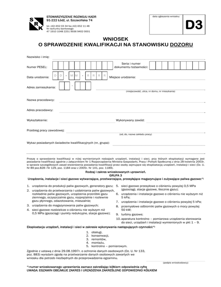 STOWARZYSZENIE ROZWOJU KADR 91-222 Łódź, ul. Szczecińska 74 data zgłoszenia wniosku: tel. (42) 652 03 34 fax (42) 652 11 48 Nr rachunku bankowego: 47 1910 1048 2251 9936 9402 0001 D3 WNIOSEK O SPRAWDZENIE KWALIFIKACJI NA STANOWISKU DOZORU Nazwisko i imię: Seria i numer dokumentu tożsamości: Numer PESEL: Data urodzenia: D D Adres zamieszkania: - M M - R R R R Miejsce urodzenia: (miejscowość, ulica, nr domu, nr mieszkania) Nazwa pracodawcy: Adres pracodawcy: Wykształcenie: Wykonywany zawód: Przebieg pracy zawodowej: (od, do, nazwa zakładu pracy) Wykaz posiadanych świadectw kwalifikacyjnych (nr, grupa): Proszę o sprawdzenie kwalifikacji w niżej wymienionych rodzajach urządzeń, instalacji i sieci, przy których eksploatacji wymagane jest posiadanie kwalifikacji zgodnie z załącznikiem Nr 1 Rozporządzenia Ministra Gospodarki, Pracy i Polityki Społecznej z dnia 28 kwietnia 2003r. w sprawie szczegółowych zasad stwierdzenia posiadania kwalifikacji przez osoby zajmujące się eksploatacją urządzeń, instalacji i sieci (Dz. U. Nr 89 poz.828 i Nr 129, poz. 1184 oraz z 2005r. Nr 141, poz. 1189). Rodzaj i zakres wnioskowanych uprawnień. GRUPA 3 Urządzenia, instalacje i sieci gazowe wytwarzające, przetwarzające, przesyłające magazynujące i zużywające paliwa gazowe:*) 1. urządzenia do produkcji paliw gazowych, generatory gazu; 2. urządzenia do przetwarzania i uzdatniania paliw gazowych, rozkładnie paliw gazowych, urządzenia przeróbki gazu ziemnego, oczyszczalnie gazu, rozprężalnie i rozlewnie gazu płynnego, odazotowanie, mieszalnie; 3. urządzenia do magazynowania paliw gazowych; 4. sieci gazowe rozdzielcze o ciśnieniu nie wyższym niż 0,5 MPa (gazociągi i punkty redukcyjne, stacje gazowe); 5. sieci gazowe przesyłowe o ciśnieniu powyżej 0,5 MPa (gazociągi, stacje gazowe, tłocznie gazu); 6. urządzenia i instalacje gazowe o ciśnieniu nie wyższym niż 5 kPa; 7. urządzenia i instalacje gazowe o ciśnieniu powyżej 5 kPa; 8. przemysłowe odbiorniki paliw gazowych o mocy powyżej 50 kW; 9. turbiny gazowe; 10. aparatura kontrolno – pomiarowa urządzenia sterowania do sieci, urządzeń i instalacji wymienionych w pkt 1 – 9. Eksploatacja urządzeń, instalacji i sieci w zakresie wykonywania następujących czynności:*) 1. 2. 3. 4. 5. obsługi, konserwacji, remontów, montażu, kontrolno – pomiarowym. Zgodnie z ustawą z dnia 29.08.1997r. o ochronie danych osobowych (Dz. U. Nr 133, poz. 883) wyrażam zgodę na przetwarzanie danych osobowych zawartych we wniosku dla potrzeb niezbędnych do przeprowadzenia egzaminu. (podpis wnioskodawcy) *) numer wnioskowanego uprawnienia zaznacz zakreślając kółkiem odpowiednia cyfrę UWAGA: EGZAMIN OBEJMUJE ZAKRES I URZADZENIA ZAKREŚLONE ODPOWIEDNIO KÓŁKIEM D3 dnia (pieczęć Komisji Kwalifikacyjnej) PROTOKÓŁ NR D / / 660 / Z egzaminu sprawdzającego znajomość przepisów i zasad w zakresie eksploatacji na stanowisku DOZORU (nazwisko i imię egzaminowanego) Zespół Egzaminacyjny w składzie: 1. Przewodniczący 2. Członek 3. Członek 4. Członek 5. Sekretarz I. Wyniki egzaminu ze znajomości przepisów, zasad, instrukcji i norm: lp. zakres wymaganej wiedzy wyniki**) 1. Przepisy dotyczące przyłączania urządzeń i instalacji do sieci, dostarczania paliw i energii oraz prowadzenia ruchu i eksploatacji urządzeń, instalacji i sieci. pozytywny/ negatywny *) 2. Przepisy i zasady postępowania przy programowaniu pracy urządzeń, instalacji i sieci, z uwzględnieniem zasad racjonalnego użytkowania paliw i energii. pozytywny/ negatywny *) 3. Przepisy dotyczące eksploatacji, wymagań w zakresie prowadzenia dokumentacji technicznej i eksploatacyjnej oraz stosowania instrukcji eksploatacji urządzeń, instalacji i sieci. pozytywny/ negatywny *) 4. Przepisy dotyczące budowy urządzeń, instalacji i sieci oraz norm i warunków technicznych, jakim powinny odpowiadać te urządzenia, instalacje i sieci. pozytywny/ negatywny *) 5. Przepisy dotyczące bezpieczeństwa i higieny pracy oraz ochrony przeciwpożarowej, z uwzględnieniem udzielania pierwszej pomocy oraz wymagań ochrony środowiska. pozytywny/ negatywny *) 6. Zasady postępowania w razie awarii, pożaru lub innego zagrożenia bezpieczeństwa ruchu urządzeń przyłączonych do sieci. pozytywny/ negatywny *) 7. Zasady dysponowania mocą urządzeń przyłączonych do sieci. pozytywny/ negatywny *) 8. Zasady i warunki wykonywania prac kontrolno – pomiarowych i montażowych. pozytywny/ negatywny *) WYNIK OGÓLNY pozytywny/ negatywny *) II. W wyniku egzaminu stwierdzono, że egzaminowany spełnia (nie spełnia)*) wymagania kwalifikacyjne do wykonania prac na stanowisku dozoru w zakresie: obsługi, konserwacji, remontów, montażowym, kontrolno – pomiarowym*) dla następujących rodzajów urządzeń, instalacji i sieci wymienionych we wniosku pod pozycją: Grupa 3: III. Wydano świadectwo nr D / ………………………. /660/……………… ważne do dnia …………………………………….. IV. Sprawdzono tożsamość egzaminowanego PESEL: V. Seria i numer dokumentu tożsamości: Wynik egzaminu przyjąłem do wiadomości: (podpis egzaminowanego) *) niepotrzebne skreślić Podpisy Członków Zespołu Egzaminacyjnego Podpis Przewodniczącego Zespołu Egzaminacyjnego (podpis i pieczątka)