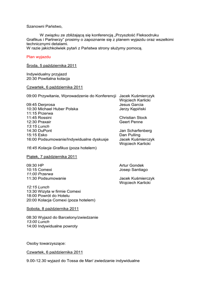 Szanowni Państwo, W związku ze zbliżającą się konferencją „Przyszłość Fleksodruku Grafikus i Partnerzy” prosimy o zapoznanie się z planem wyjazdu oraz wszelkimi technicznymi detalami. W razie jakichkolwiek pytań z Państwa strony służymy pomocą. Plan wyjazdu Środa, 5 października 2011 Indywidualny przyjazd 20:30 Powitalna kolacja Czwartek, 6 października 2011 09:00 Przywitanie, Wprowadzenie do Konferencji Jacek Kuśmierczyk Wojciech Karlicki 09:45 Derprosa Jesus Garcia 10:30 Michael Huber Polska Jerzy Kępiński 11:15 Przerwa 11:45 Rossini Christian Stock 12:30 Praxair Geert Penne 13:15 Lunch 14:30 DuPont Jan Scharfenberg 15:15 Esko Dan Pulling 16:00 Podsumowanie/Indywidualne dyskusje Jacek Kuśmierczyk Wojciech Karlicki 16:45 Kolacja Grafikus (poza hotelem) Piątek, 7 października 2011 09:30 HP 10:15 Comexi 11:00 Przerwa 11:30 Podsumowanie Artur Gondek Josep Santiago Jacek Kuśmierczyk Wojciech Karlicki 12:15 Lunch 13:30 Wizyta w firmie Comexi 18:00 Powrót do Hotelu 20:00 Kolacja Comexi (poza hotelem) Sobota, 8 października 2011 08:30 Wyjazd do Barcelony/zwiedzanie 13:00 Lunch 14:00 Indywidualne powroty Osoby towarzyszące: Czwartek, 6 października 2011 9.00-12.30 wyjazd do Tossa de Mar/ zwiedzanie indywidualne 13:15 Lunch (hotel) 14.00-16.00 czas wolny ( hotel, miejscowość Platja D’Aro) Piątek, 7 października 2011 9.00-12.00 czas wolny ( hotel, miejscowość Platja D’Aro) 12.15 Lunch (hotel) 13.30 -16.30 wyjazd do Girony /zwiedzanie indywidualne 1. Zasady Ubioru (Dress code) Konferencja – business casual Kolacja – casual 2. Wszyscy klienci zostaną objęci ubezpieczeniem na podróż (w tym również bagaż). 3. Transport z lotniska Barcelona/Girona do Hotelu San Jorge będzie odbywał się autokarami oznaczonymi „Grafikus Conference” BUS 1 dla osób przylatujących do Barcelony ok. godz. 11:45 (osoba kontaktowa Józef Jarosz) BUS 2 dla osób przylatujących do Barcelony ok. godz. 14:00 (osoba kontaktowa Lena Chmielewska/Wojciech Karlicki BUS 3 dla osób przylatujących do Girona ok. godz. 12.30 Dla pozostałych zostały zamówione taxi Transport z Hotelu w Barcelonie/Gironie w dniu 09.10.2011 będzie organizowany oraz opłacany osobiście przez uczestników 4. Płatność za Hotel San Jorge została uregulowana wobec tego uczestnicy nie pokrywają kosztów osobiście. Płatność za hotel w Barcelonie sobota – niedziela 08 – 09.10.2011 będzie regulowana w hotelu osobiście przez każdego uczestnika. 5. Proszę o wydrukowanie biletu elektronicznego i zachowanie go na czas podróży. 6. Telefony kontaktowe do organizatorów Wojciech Karlicki + 48 501 205 776 Józef Jarosz + 48 501 324 182 Lena Chmielewska +48 501 205 803 Z poważaniem Lena Chmielewska