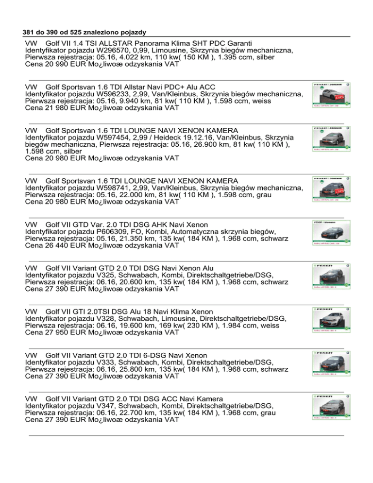 381 do 390 od 525 znaleziono pojazdy VW Golf VII 1.4 TSI ALLSTAR Panorama Klima SHT PDC Garanti Identyfikator pojazdu W296570, 0,99, Limousine, Skrzynia biegów mechaniczna, Pierwsza rejestracja: 05.16, 4.022 km, 110 kw( 150 KM ), 1.395 ccm, silber Cena 20 990 EUR Mo¿liwoæ odzyskania VAT VW Golf Sportsvan 1.6 TDI Allstar Navi PDC+ Alu ACC Identyfikator pojazdu W596233, 2,99, Van/Kleinbus, Skrzynia biegów mechaniczna, Pierwsza rejestracja: 05.16, 9.940 km, 81 kw( 110 KM ), 1.598 ccm, weiss Cena 21 980 EUR Mo¿liwoæ odzyskania VAT VW Golf Sportsvan 1.6 TDI LOUNGE NAVI XENON KAMERA Identyfikator pojazdu W597454, 2,99 / Heideck 19.12.16, Van/Kleinbus, Skrzynia biegów mechaniczna, Pierwsza rejestracja: 05.16, 26.900 km, 81 kw( 110 KM ), 1.598 ccm, silber Cena 20 980 EUR Mo¿liwoæ odzyskania VAT VW Golf Sportsvan 1.6 TDI LOUNGE NAVI XENON KAMERA Identyfikator pojazdu W598741, 2,99, Van/Kleinbus, Skrzynia biegów mechaniczna, Pierwsza rejestracja: 05.16, 22.000 km, 81 kw( 110 KM ), 1.598 ccm, grau Cena 20 980 EUR Mo¿liwoæ odzyskania VAT VW Golf VII GTD Var. 2.0 TDI DSG AHK Navi Xenon Identyfikator pojazdu P606309, FO, Kombi, Automatyczna skrzynia biegów, Pierwsza rejestracja: 05.16, 21.350 km, 135 kw( 184 KM ), 1.968 ccm, schwarz Cena 26 440 EUR Mo¿liwoæ odzyskania VAT VW Golf VII Variant GTD 2.0 TDI DSG Navi Xenon Alu Identyfikator pojazdu V325, Schwabach, Kombi, Direktschaltgetriebe/DSG, Pierwsza rejestracja: 06.16, 20.600 km, 135 kw( 184 KM ), 1.968 ccm, schwarz Cena 27 390 EUR Mo¿liwoæ odzyskania VAT VW Golf VII GTI 2.0TSI DSG Alu 18 Navi Klima Xenon Identyfikator pojazdu V328, Schwabach, Limousine, Direktschaltgetriebe/DSG, Pierwsza rejestracja: 06.16, 19.600 km, 169 kw( 230 KM ), 1.984 ccm, weiss Cena 27 950 EUR Mo¿liwoæ odzyskania VAT VW Golf VII Variant GTD 2.0 TDI 6-DSG Navi Xenon Identyfikator pojazdu V333, Schwabach, Kombi, Direktschaltgetriebe/DSG, Pierwsza rejestracja: 06.16, 25.800 km, 135 kw( 184 KM ), 1.968 ccm, schwarz Cena 27 390 EUR Mo¿liwoæ odzyskania VAT VW Golf VII Variant GTD 2.0 TDI DSG ACC Navi Kamera Identyfikator pojazdu V347, Schwabach, Kombi, Direktschaltgetriebe/DSG, Pierwsza rejestracja: 06.16, 22.700 km, 135 kw( 184 KM ), 1.968 ccm, grau Cena 27 390 EUR Mo¿liwoæ odzyskania VAT VW Golf VII GTI 2.0TSI 6-DSG Navi Xenon Alu 18 ACC Identyfikator pojazdu V353, Schwabach, Limousine, Direktschaltgetriebe/DSG, Pierwsza rejestracja: 06.16, 18.500 km, 169 kw( 230 KM ), 1.984 ccm, schwarz Cena 27 950 EUR Mo¿liwoæ odzyskania VAT