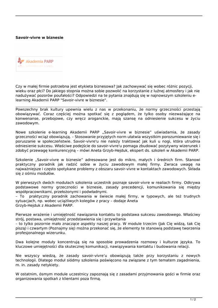 Savoir-vivre w biznesie Czy w małej firmie potrzebna jest etykieta biznesowa? Jak zachowywać się wobec różnic pozycji, wieku oraz płci? Do jakiego stopnia można sobie pozwolić na korzystanie z luźnej atmosfery i jak nie nadużywać pozorów poufałości? Odpowiedzi na te pytania znajdują się w najnowszym szkoleniu elearning Akademii PARP "Savoir-vivre w biznesie". Powszechny brak kultury upewnia wielu z nas w przekonaniu, że normy grzeczności przestają obowiązywać. Coraz częściej można spotkać się z poglądem, że tylko osoby niezważające na konwenanse, przebojowe, czy wręcz aroganckie, mają szansę na odniesienie sukcesu w życiu zawodowym. Nowe szkolenie e-learning Akademii PARP „Savoir-vivre w biznesie” uświadamia, że zasady grzeczności wciąż obowiązują. – Stosowanie przyjętych norm ułatwia wszystkim porozumiewanie się i poruszanie w społeczeństwie. Savoir-vivre'u nie należy traktować jak kuli u nogi, która utrudnia odniesienie sukcesu. Właściwe podejście do savoir-vivre'u pomaga zbudować pozytywny wizerunek i zdobyć przewagę konkurencyjną – mówi Aneta Grzyb-Hejduk, ekspert ds. szkoleń w Akademii PARP. Szkolenie „Savoir-vivre w biznesie” adresowane jest do mikro, małych i średnich firm. Stanowi praktyczny poradnik jak radzić sobie w życiu zawodowym małej firmy. Zwraca uwagę na najważniejsze i często spotykane problemy z obszaru savoir-vivre w kontaktach zawodowych. Składa się z ośmiu modułów. W pierwszych dwóch modułach szkolenia uczestnik poznaje savoir-vivre w realiach firmy. Odkrywa podstawowe normy grzeczności w biznesie, zasady precedencji, komunikowania się między współpracownikami, przełożonymi i podwładnymi. – To praktyczny poradnik zachowania w świecie małej firmy, w typowych, ale też trudnych sytuacjach, np. wobec uciążliwych kolegów z pracy – dodaje Aneta Grzyb-Hejduk z Akademii PARP. Pierwsze wrażenie i umiejętność nawiązania kontaktu to podstawa sukcesu zawodowego. Właściwy strój, postawa, umiejętność przedstawienia się i przywitania – to tylko pozornie mało znaczące aspekty naszej pracy. W module trzecim (Jak Cię widzą, tak Cię piszą) i czwartym (Poznajmy się) można przekonać się, że elementy te stanowią podstawę tworzenia profesjonalnego wizerunku. Dwa kolejne moduły koncentrują się na sposobie prowadzenia rozmowy i kulturze języka. To kluczowe umiejętności dla skutecznej komunikacji, nawiązywania kontaktu i budowania relacji. Nie wszyscy wiedzą, że zasady savoir-vivre’u obowiązują także przy korzystaniu z nowych technologii. Dlatego moduł siódmy szkolenia poświęcono na związane z tym tematem zagadnienia, m. in. zasady netykiety. W ostatnim, ósmym module uczestnicy zapoznają się z zasadami przyjmowania gości w firmie oraz organizowania spotkań z klientami poza firmą. 1/2 „Savoir-vivre w biznesie” to 45. szkolenie e-learning Akademii PARP. Portal szkoleniowy www.akademiaparp.gov.pl oferuje jeszcze 44 szkolenia e-learning i 32 szkolenia m-learning (dostępnych na smartfonach i tabletach). Wszyscy przedsiębiorcy i pracownicy sektora MSP oraz osoby planujące rozpoczęcie własnej działalności gospodarczej mogą podjąć bezpłatną naukę. Wiedza potwierdzana jest certyfikatem. Projekt jest realizowany na zlecenie Polskiej Agencji Rozwoju Przedsiębiorczości i współfinansowany ze środków UE w ramach Europejskiego Funduszu Społecznego. kontakt: [email protected] Infolinia 0-801 444 MSP (czyli 0-801 444 677) 2/2 Powered by TCPDF (www.tcpdf.org)