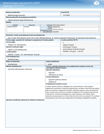 Biotechnologia żywności #13.3.0527 Sylabusy - Centrum Informatyczne UG Dział Kształcenia Nazwa przedmiotu Kod ECTS Biotechnologia żywności Nazwa jednostki prowadzącej przedmiot 13.3.0527 Katedra Biotechnologii Molekularnej Studia wydział Wydział Chemii kierunek Chemia poziom forma moduł specjalnościowy specjalizacja pierwszego stopnia stacjonarne chemia żywności wszystkie Nazwisko osoby prowadzącej (osób prowadzących) prof. dr hab. Piotr Skowron; prof. UG, dr hab. Elżbieta Kamysz; dr Joanna Jeżewska-Frąckowiak; dr Agnieszka Żylicz-Stachula Formy zajęć, sposób ich realizacji i przypisana im liczba godzin Liczba punktów ECTS Formy zajęć 4 Wykład, Ćw. laboratoryjne Sposób realizacji zajęć zajęcia 45 godz. konsultacje 10 godz. praca własna studenta 45 godz. RAZEM: 100 godz. - 4 ECTS zajęcia w sali dydaktycznej Liczba godzin Wykład: 15 godz., Ćw. laboratoryjne: 30 godz. Cykl dydaktyczny 2018/2019 letni Status przedmiotu obowiązkowy Metody dydaktyczne ćwiczenia laboratoryjne i terenowe Język wykładowy polski Forma i sposób zaliczenia oraz podstawowe kryteria oceny lub wymagania egzaminacyjne Sposób zaliczenia - Egzamin - Zaliczenie na ocenę Formy zaliczenia - egzamin pisemny testowy - kolokwium Podstawowe kryteria oceny • wykład: egzamin pisemny, składający się z pytań testowych, obej-mujących zagadnienia wymienione w treściach programowych wy-kładu; ocena końcowa według skali ocen podanej w Regulaminie Studiów; dodatkowy egzamin ustny dla studentów, którzy w pierw-szym terminie nie uzyskali wymaganych 51% punktacji maksymal-nej; • laboratorium: kolokwium składające się z pytań testowych i/lub krótkich zadań otwartych; poprawa pisemna w formie testu dla osób, które nie uzyskały 51% punktacji maksymalnej; ocena koń-cowa według skali ocen podanej w Regulaminie Studiów Sposób weryfikacji założonych efektów kształcenia Biotechnologia żywności #13.3.0527 | Strona 1 z 3 Biotechnologia żywności #13.3.0527 Sylabusy - Centrum Informatyczne UG Dział Kształcenia Sposób weryfikacji przyswojenia wiedzy: Rozwiązuje test egzaminacyjny i testy podczas ćwiczeń laboratoryjnych o zakresie podanym w sylabusie dla tego przedmiotu (K_W05). Umie wyjaśnić celowość zastosowania wybranej aparatury naukowo-badawczej w kontekście konkretnego eksperymentu podczas zajęć laboratoryjnych, odpowiada na pytania testowe związane z podstawowymi zagadnieniami dotyczącymi stosowanej aparatury (KW_10). Sposób weryfikacji nabycia umiejętności: Rozpoznaje, odczytuje i poprawnie interpretuje wyniki dokonanego rozdziału elektroforetycznego. Umie wskazać wynik błędny i przyczyny jego powstania (K_U01). Wykorzystuje otrzymany wynik wykonanego samodzielnie doświadczenia biotechnologicznego do zaplanowania kolejnego etapu eksperymentu. Po rozpoznaniu wyniku błędnego wykonuje czynności korygujące lub powtarza procedurę. Odczytuje wynik eksperymentu i go interpretuje, opisując na tej podstawie wpływ warunków eksperymentu na otrzymany wynik (K_U02). Wykorzystuje podstawowy sprzęt laboratoryjny do eksperymentów o charakterze biotechnologicznym (K_U03). Wykorzystując wykonaną dokumentację cyfrową danych wykonuje pisemne sprawozdanie wyników otrzymanego doświadczenia (K_U07). Sposób weryfikacji nabrania kompetencji społecznych: Student uczestniczy w podziale grupy ćwiczeniowej na mniejsze zespoły, podejmując odpowiedzialność za zakres wykonywanych obowiązków i otrzymywanych wyników lub pracuje samodzielnie (K_K02). Planuje kolejność wykonywania przewidzianych eksperymentów uwzględniając ich pracochłonność i czasochłonność. (K_K03). Zachowuje zasady pracy jałowej i dobrej praktyki laboratoryjnej GLP DLA biotechnologii, stosuje wskazane środki ochrony osobistej w przypadku pracy z chemikaliami lub czynnikami fizycznymi (promieniowanie UV, mikrofale). Pracuje na wyznaczonym przez prowadzącego stanowisku (K_K05). Określenie przedmiotów wprowadzających wraz z wymogami wstępnymi A. Wymagania formalne biochemia, mikrobiologia B. Wymagania wstępne znajomość komórkowych procesów biochemicznych, znajomość budowy komórki bakteryjnej Cele kształcenia zapoznanie studentów z wszystkimi zagadnieniami wymienionymi w treściach programowych wykładu; zapoznanie studentów mikroorganizmami oraz z podstawowymi procesami wykorzystywanymi w biotechnologii żywności zapoznanie studentów z współczesnymi metodami, wykorzystywanymi w biotechnologii żywności Treści programowe A. Problematyka wykładu przemysł spożywczy i rolnictwo, przemysł mleczarski, bakterie fermentacji mlekowej, homo- hetero fermentacja mlekowa, cha-rakterystyka bakterii fermentacji mlekowej, infekcje bakteriofagami, zastosowanie bakteriofagów, fermentowane produkty mleczne, fermentowane surowce roślinne, fermentacja pieczywa i mięsa, prebiotyki, bakterie kwasu octowego, charakterystyka, wykorzystanie przemysłowe, octy, zanieczyszczenia w przemyśle owocowo-warzywnym i fermentacyjnym, bioprodukcja ami-nokwasów, transgeniczne rośliny i zwierzęta, odporność na czynniki biotyczne i abiotyczne, rośliny jako bioreaktory i jadalne szczepionki, bakteryjna stymulacja wzrostu roślin, insektycydy pochodzenia bakteryjnego, inżynieria biotoksyn, bakulowirusy jako narzędzia biokontroli, organizmy modyfikowane genetycznie a produkcja żywności, metody diagnostyczne stosowane do wykrywania GMO w produktach spożywczych, regulacje prawne GMO – uwalnianie do środowiska B. Problematyka ćwiczeń / konwersatorium / laboratorium analiza jakościowa i ilościowa składu fermentowanych i niefermentowanych produktów spożywczych (np. mleko, jogurt, ser, mięso); flora bakteryjna fermentowanych i niefermentowanych produktów żywnościowych, obsługa mikroskopu świetlnego, detekcja GMO w produktach spożywczych Wykaz literatury A. Literatura wymagana do ostatecznego zaliczenia zajęć (zdania egzaminu): A.1. wykorzystywana podczas zajęć b