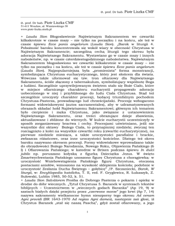 o. prof. Dr hab. Piotr Liszka CMF o. prof. Dr hab. Piotr Liszka CMF 51-611 Wrocław, ul. Wieniawskiego 38 www.piotr-liszka.strefa.pl + Lauda Sion Błogosławienie Najświętszym Sakramentem we czwartki kilkakrotnie w czasie mszy – nie tylko na początku i na końcu, ale też w czasie śpiewu Ecce panis angelorum (Lauda Sion). „Barok w liturgii 4. Pobożność baroku koncentrowała się wokół wiary w obecność Chrystusa w Najświętszym Sakramencie; szczególną cechą liturgii tego okresu była adoracja Najświętszego Sakramentu. Wystawiano go w czasie mszy i innych nabożeństw, np. w czasie czterdziestogodzinnego nabożeństwa. Najświętszym Sakramentem błogosławiono we czwartki kilkakrotnie w czasie mszy – nie tylko na początku i na końcu, ale też w czasie śpiewu Ecce panis angelorum (Lauda Sion). Najpopularniejszą była „promienista” forma monstrancji, symbolizująca Chrystusa eucharystycznego, który jest słońcem dla świata. Wówczas także uformował się tzw. tron ołtarzowy dla Najświętszego Sakramentu, ściśle złączony z tabernakulum, symbolizujący wspólnotę Boga z ludźmi. Szczególnie uprzywilejowanym świętem stało się Boże Ciało, które w miejsce ofiarniczego charakteru eucharystii propagowało adorację uobecnionego w niej i przybliżonego do ludu Ciała Chrystusa. Stąd też szczególnie uroczysty charakter procesji, będącej triumfalnym pochodem Chrystusa-Pasterza, prowadzącego lud chrześcijański. Procesję wzbogacono formami widowiskowymi (autos sacramentales), aby w udramatyzowanych obrazach składać hołd Najświętszemu Sakramentowi; głównym ich tematem było cierpienie i męka Chrystusa, jako związane z ustanowieniem Najświętszego Sakramentu, oraz treści obrazujące dzieje zbawienia, aktualizowane i zbliżone do wiernych. W kulcie eucharystii uczestniczyły w sposób zorganizowany bractwa i cechy. Procesjami uświetniano, jeśli nie wszystkie dni oktawy Bożego Ciała, to przynajmniej niedzielę; zwyczaj ten rozciągnięto z kolei na wszystkie czwartki roku (czwartki eucharystyczne), na pierwsze niedziele miesiąca, a także uroczystości parafialne i brackie, zwłaszcza różańcowe, oraz inne uroczystości kościelne. Dlatego też okres baroku nazywano okresem procesji. Formy widowiskowe wprowadzano także do obrzędowości Bożego Narodzenia, Nowego Roku, Objawienia Pańskiego (6 I) i Ofiarowania Pańskiego; w katedrze w Brixen podczas śpiewu In dulci jubilo np. poruszano kołyską z figurką Dzieciątka Jezus. W święto Zmartwychwstania Pańskiego unoszono figurę Chrystusa z chorągiewką: w uroczystość Wniebowstąpienia Pańskiego figurę Chrystusa, otoczoną postaciami aniołów, wznoszono na wysokość sklepienia kościoła; podobnie w uroczystość Zesłania Ducha Świętego – gołębicę” /P. Szczaniecki, Barok, W liturgii, w: Encyklopedia katolicka, T. II, red. F. Gryglewicz, R. Łukaszyk, Z. Sułowski, Lublin 1985, 50-52, k. 51. + Lauda Sion Salvátorem Prośba do Dobrego Pasterza o pokarm i opiekę w drodze do dóbr wiecznych. „Tytuł Chrystusa 5. Baranek w syntezach tekstów biblijnych – Uczestnictwem w „wiecznych godach Baranka” (Ap 19, 9) w szatach białych dzięki przejściu przez „czerwone morze” jego krwi (Ap 7, 14) nazywa sakramenty wielkanocne hymn nieszporny tego okresu Ad cenam Agni providi (BR 1643-1970 Ad regias Agni dames), następnie zaś głosi, iż Chrystus Baranek „stał się naszą Paschą”, gdyż został ofiarowany, a jego 1 o. prof. Dr hab. Piotr Liszka CMF Ciało stało się „dla nas przaśnym chlebem szczerości” (1 Kor 5, 7-8). Szczególnie syntetyczny obraz „Baranka na górze, spod którego stóp wytryska zdrój wody żywej, rozweselający Miasto Boże” (Ap 14, 1; 22,1; Ps 45, 5) ukazuje antyfona nieszporów o św. Klemensie Rzymskim; o „zdroju wody żywej", który „wytrysnął z przebitego na krzyżu Serca Jezusa", abyśmy mogli „obmywać szaty we krwi Baranka” (Ap 22, 1; J 19, 34; Ap 7, 14), mówi hymn nieszporny o Sercu Jezusa (BR 1765-1970) En ut superba criminum, stosując ten obraz do sakramentów jako „siedmiorakiego zdroju". Najnowszą tego rodzaju syntezą, łączącą świadectwo o obecności Zbawiciela (J 1, 29) w eucharystii z wezwaniem do jej spożywania jako zadatku na wieczność (Ap 19, 9), jest nowa (MR 1970) formuła przy ukazaniu Hostii na początku komunii. Baranek Tytuł wyznawców Chrystusa – Chrystus nazywał wiernych swoimi owcami i barankami, prawdopodobnie zamiennie. Jego słowa o Dobrym Pasterzu (J 10, 1-16) zastosowano w czytaniach mszy IV niedzieli Wielkanocy, natomiast słowa przekazania władzy Piotrowi (J 21, 15-17) — w mszalnych formularzach na dni pasterzy (biskupów i kapłanów) oraz przy udzielaniu święceń kapłańskich (MR 1970). Określenie baranka zawiera responsorium Isti sunt agni novelli, z wersetem z Ap 7, 9 (odnoszące się pierwotnie do nowo ochrzczonych) przeznaczone na święta apostołów okresu wielkanocnego. O owcach, które odkupił Baranek, mówi tylko sekwencja wielkanocna Victimae paschali laudes, zaś zakończenie sekwencji Lauda Sion Salvátorem zawiera prośbę do Dobrego Pasterza o pokarm i opiekę w drodze do dóbr wiecznych (Jungmann MS I 439-441, 454, II 414-415, 461-462; P. Bruylants, Les oraisons du Missel romain, Lv 1952, II 332, 1888; H. Strykowski, Chrystus – Baranek w Piśmie Świętym. Lb 1961, 48-51, 62, 127 (bibliogr.); F. Nikolasch, Das Lamm als Christussymbol in den Schriften der Väter, W 1963; J. Pascher, Das liturgische Jahr, Mn 1963 (passim); A. Pflieger, Liturgicae orationis concordantia verbalia I. Missale romanum. Fr 1964, 22-23; Blaise 343; V. Loi, La tipologia dell'agnello pasquale e l'attesa escatologica in età patristica. Sal 33(1971) 187-204)” W. Danielski, Baranek, II. W liturgii, w: Encyklopedia katolicka, T. II, red. F. Gryglewicz, R. Łukaszyk, Z. Sułowski, Lublin 1985, 5-7, k. 7/. + Lauda Sion Salvatorem Spożywanie baranka paschalnego w St
