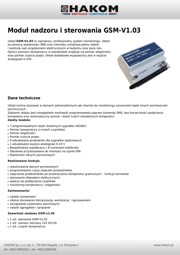 Moduł nadzoru i sterowania GSM-V1.03 Układ GSM-V1.03 to najnowszy, profesjonalny system monitoringu. Układ za pomocą wiadomości SMS oraz internetu umożliwia pełny nadzór i kontrolę nad urządzeniami elektrycznymi w budynku oraz poza nim. Oprócz pomiaru temperatury w standardzie znajduje się pomiar wilgotności oraz pomiar zużycia prądu. Układ dodatkowo wyposażony jest w wyjście analogowe 0-10V. Dane techniczne Układ można stosować w domach jednorodzinnych jak również do monitoringu serwerowni bądź innych pomieszczeń technicznych. Zaletami układu jest niewątpliwie możliwość programowania poprzez komendy SMS, bez konieczności podpinania komputera oraz automatyczny pomiar i dozór trzech niezależnych temperatur. Zalety modułu: ● ● ● ● ● ● ● ● ● 7 programowalnych wejść dowolnych sygnałów (NO/NC) Pomiar temperatury (z trzech czujników) Pomiar wilgotności Pomiar zużycia prądu 4 wbudowane przekaźniki dla sygnałów wyjściowych 1 wbudowane wyjście analogowe 0-10 V Bezpośrednia współpraca z 8 numerami telefonów Obudowa przystosowana do montażu na szynie DIN Rejestrator danych pomiarowych Realizowane funkcje: ● ● ● ● ● ● rejestrowanie danych pomiarowych programowalne czasy załączeń przekaźników załączenie przekaźników po przekroczeniu temperatur granicznych – funkcja termostat sterowanie obwodami elektrycznymi wejścia do podłączenia czujników monitoring temperatury / wilgotności Zastosowanie: ● ● ● ● nadzór serwerowni zdalne sterowanie klimatyzacją, wentylacją i ogrzewaniem zarządzanie systemami alarmowymi nadzór agregatów i sprężarek Zawartość zestawu GSM-v1.05 ● ● ● 1 szt. sterownik GSM-V1.03 1 szt. zasilacz sieciowy 12V DC/2A 1 szt. czujnik temperatury ● ● ● Szyna TS 35 Wkręty montażowe Instrukcja obsługi Sprawdź możliwości układu! Zaloguj się do panelu administracyjnego i zobacz co potrafi nasz sterownik.Wpisz w przeglądarce adres: http://185.15.83.6:88, a następnie uzupełnij dane: Login: admin i hasło: admin
