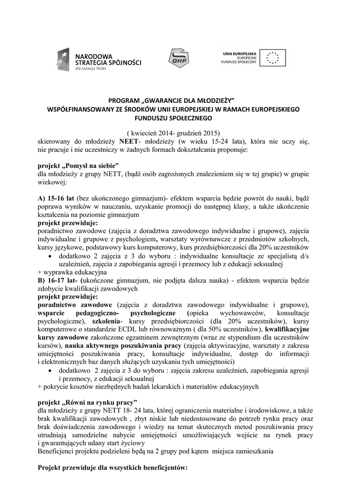 PROGRAM „GWARANCJE DLA MŁODZIEŻY” WSPÓŁFINANSOWANY ZE ŚRODKÓW UNII EUROPEJSKIEJ W RAMACH EUROPEJSKIEGO FUNDUSZU SPOŁECZNEGO ( kwiecień 2014- grudzień 2015) skierowany do młodzieży NEET- młodzieży (w wieku 15-24 lata), która nie uczy się, nie pracuje i nie uczestniczy w żadnych formach dokształcania proponuje: projekt „Pomysł na siebie” dla młodzieży z grupy NETT, (bądź osób zagrożonych znalezieniem się w tej grupie) w grupie wiekowej: A) 15-16 lat (bez ukończonego gimnazjum)- efektem wsparcia będzie powrót do nauki, bądź poprawa wyników w nauczaniu, uzyskanie promocji do następnej klasy, a także ukończenie kształcenia na poziomie gimnazjum projekt przewiduje: poradnictwo zawodowe (zajęcia z doradztwa zawodowego indywidualne i grupowe), zajęcia indywidualne i grupowe z psychologiem, warsztaty wyrównawcze z przedmiotów szkolnych, kursy językowe, podstawowy kurs komputerowy, kurs przedsiębiorczości dla 20% uczestników dodatkowo 2 zajęcia z 3 do wyboru : indywidualne konsultacje ze specjalistą d/s uzależnień, zajęcia z zapobiegania agresji i przemocy lub z edukacji seksualnej + wyprawka edukacyjna B) 16-17 lat- (ukończone gimnazjum, nie podjęta dalsza nauka) - efektem wsparcia będzie zdobycie kwalifikacji zawodowych projekt przewiduje: poradnictwo zawodowe (zajęcia z doradztwa zawodowego indywidualne i grupowe), wsparcie pedagogicznopsychologiczne (opieka wychowawców, konsultacje psychologiczne), szkolenia- kursy przedsiębiorczości (dla 20% uczestników), kursy komputerowe o standardzie ECDL lub równoważnym ( dla 50% uczestników), kwalifikacyjne kursy zawodowe zakończone egzaminem zewnętrznym (wraz ze stypendium dla uczestników kursów), nauka aktywnego poszukiwania pracy (zajęcia aktywizacyjne, warsztaty z zakresu umiejętności poszukiwania pracy, konsultacje indywidualne, dostęp do informacji i elektronicznych baz danych służących uzyskaniu tych umiejętności) dodatkowo 2 zajęcia z 3 do wyboru : zajęcia zakresu uzależnień, zapobiegania agresji i przemocy, z edukacji seksualnej + pokrycie kosztów niezbędnych badań lekarskich i materiałów edukacyjnych projekt „Równi na rynku pracy” dla młodzieży z grupy NETT 18- 24 lata, której ograniczenia materialne i środowiskowe, a także brak kwalifikacji zawodowych , zbyt niskie lub niedostosowane do potrzeb rynku pracy oraz brak doświadczenia zawodowego i wiedzy na temat skutecznych metod poszukiwania pracy utrudniają samodzielne nabycie umiejętności umożliwiających wejście na rynek pracy i gwarantujących udany start życiowy Beneficjenci projektu podzieleni będą na 2 grupy pod kątem miejsca zamieszkania Projekt przewiduje dla wszystkich beneficjentów: poradnictwo zawodowe (zajęcia z doradztwa zawodowego w formie indywidualnej i grupowej), wsparcie pedagogiczno- psychologiczne (wsparcie opiekunów, konsultacje psychologiczne), szkolenia zawodowe (w tym kursy przekwalifikowujące lub doskonalące) wraz z kosztem badań lekarskich oraz kosztem egzaminu kwalifikacyjnego w instytucji zewnętrznej), szkolenia w zakresie umiejętności poszukiwanych przez pracodawców w tym z zakresu kompetencji miękkich oraz językowych, cyfrowych i innych np. kurs prawa jazdy kat.B (w przypadku osób z terenów wiejskich- ew. uzyskanie uprawnień do kierowania ciągnikiem) wraz z kosztem badań lekarskich oraz kosztem egzaminu kwalifikacyjnego w instytucji zewnętrznej, 6- miesięczne staże zawodowe (wraz ze stypendium dla uczestników staży i dodatkami do wynagrodzeń dla opiekunów stażu z zakładu pracy), wsparcie zatrudnienia, nauka aktywnego poszukiwania pracy (zajęcia aktywizacyjne, warsztaty z umiejętności poszukiwania pracy, konsultacje indywidualne, dostęp do informacji i elektronicznych baz danych służących uzyskaniu umiejętności poszukiwania pracy i in.), pośrednictwo pracy lub pośrednictwo w zakresie organizacji staży Ponadto refundacja kosztów opieki nad dziećmi lub osobami zależnymi na czas uczestnictwa w projekcie, niezbędnych badań lekarskich i psychologicznych oraz materiałów edukacyjnych. Gwarantuje pokrycie kosztów zewnętrznych egzaminów potwierdzających uprawnienia zawodowe. dodatkowe wsparcie dla osób zamieszkujących tereny wiejskie i małe miejscowości Indywidualne wsparcie opiekuna/tutora, wsparcie mobilności geograficznej, wsparcie udzielane zależnie od potrzeb wskazanych w diagnozie indywidualnej- konsultacje psychologiczne, pedagogiczne lub inne konsultacje specjalistyczne, trening umiejętności społecznych (autoprezentacja, komunikacja itp.) Ponadto wszystkim uczestnikom w trakcie realizacji projektu zapewniamy wsparcie w postaci finansowania kosztów wyżywienia, dojazdu oraz ubezpieczenia NNW PROJEKT JEST CAŁKOWICIE BEZPŁATNY! 11-23 Środowiskowy Hufiec Pracy rekrutuje uczestników do projektów następujących grupach: Projekt „Pomysł na siebie” 2 grupy 10 osobowe ( 18 osób z terenów wiejskich, 2 osoby z miasta) 1 grupa A (15-16 lat) 10 uczestników: w tym 4 dziewczęta i 6 chłopców rekrutacja do końca czerwca 2014 1 grupa B (16-17 lat) 10 uczestników: w tym 4 dziewczęta i 6 chłopców rekrutacja do końca czerwca 2014 Projekt „Równi na rynku pracy” 3 grupy 15 osobowe (30 osób z terenów wiejskich, 15 osób z miasta) 60% kobiet, 40% mężczyzn- rekrutacja do września 2014 11-23 Środowiskowy Hufiec Pracy ,76-200 Słupsk, ul. Dunikowskiego 3, Tel 59/844 19 59 lub kom: 502 857 646 Zapraszamy! UWAGA!!! Czas rekrutacji może zostać przedłużony!
