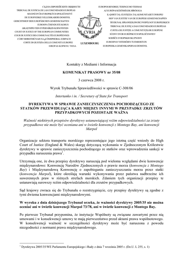 СЪД НА ЕВРОПЕЙСКИТЕ ОБЩНОСТИ TRIBUNAL DE JUSTICIA DE LAS COMUNIDADES EUROPEAS EUROPOS BENDRIJŲ TEISINGUMO TEISMAS AZ EURÓPAI KÖZÖSSÉGEK BÍRÓSÁGA SOUDNÍ DVŮR EVROPSKÝCH SPOLEČENSTVÍ IL-QORTI TAL-ĠUSTIZZJA TAL-KOMUNITAJIET EWROPEJ DE EUROPÆISKE FÆLLESSKABERS DOMSTOL HOF VAN JUSTITIE VAN DE EUROPESE GEMEENSCHAPPEN GERICHTSHOF DER EUROPÄISCHEN GEMEINSCHAFTEN TRYBUNAŁ SPRAWIEDLIWOŚCI WSPÓLNOT EUROPEJSKICH EUROOPA ÜHENDUSTE KOHUS TRIBUNAL DE JUSTIÇA DAS COMUNIDADES EUROPEIAS ∆ΙΚΑΣΤΗΡΙΟ ΤΩΝ ΕΥΡΩΠΑΪΚΩΝ ΚΟΙΝΟΤΗΤΩΝ CURTEA DE JUSTIŢIE A COMUNITĂŢILOR EUROPENE COURT OF JUSTICE OF THE EUROPEAN COMMUNITIES SÚDNY DVOR EURÓPSKYCH SPOLOČENSTIEV COUR DE JUSTICE DES COMMUNAUTÉS EUROPÉENNES SODIŠČE EVROPSKIH SKUPNOSTI CÚIRT BHREITHIÚNAIS NA gCÓMHPHOBAL EORPACH EUROOPAN YHTEISÖJEN TUOMIOISTUIN CORTE DI GIUSTIZIA DELLE COMUNITÀ EUROPEE EIROPAS KOPIENU TIESA EUROPEISKA GEMENSKAPERNAS DOMSTOL Kontakty z Mediami i Informacja KOMUNIKAT PRASOWY nr 35/08 3 czerwca 2008 r. Wyrok Trybunału Sprawiedliwości w sprawie C-308/06 Intertanko i in. / Secretary of State for Transport DYREKTYWA W SPRAWIE ZANIECZYSZCZENIA POCHODZĄCEGO ZE STATKÓW PRZEWIDUJĄCA KARY MIĘDZY INNYMI W PRZYPADKU ZRZUTÓW PRZYPADKOWYCH POZOSTAJE WAŻNA Ważność niektórych przepisów dyrektywy ustanawiającej reżim odpowiedzialności za zrzuty przypadkowe nie może być oceniana ani w świetle konwencji z Montego Bay, ani konwencji Marpol Organizacje sektora transportu morskiego reprezentujące jego istotną część wniosły do High Court of Justice (England & Wales) skargę dotyczącą wykonania w Zjednoczonym Królestwie dyrektywy w sprawie zanieczyszczenia pochodzącego ze statków oraz wprowadzenia sankcji w przypadku naruszenia prawa1. Utrzymują one, że dwa przepisy dyrektywy naruszają pod wieloma względami dwie konwencje międzynarodowe: Konwencję Narodów Zjednoczonych o prawie morza (konwencja z Montego Bay) i Międzynarodową Konwencję o zapobieganiu zanieczyszczaniu morza przez statki (konwencja Marpol), które określają warunki wykonywania przez państwa nadbrzeżne ich suwerennych praw w różnych strefach morskich. Zdaniem tych organizacji przepisy te ustanawiają surowszy reżim odpowiedzialności dla zrzutów przypadkowych. Sąd krajowy zwraca się do Trybunału o rozstrzygnięcie, czy przepisy dyrektywy są zgodne z tymi dwiema konwencjami międzynarodowymi. W wyroku z dnia dzisiejszego Trybunał orzeka, że ważności dyrektywy 2005/35 nie można oceniać ani w świetle konwencji Marpol 73/78, ani w świetle konwencji z Montego Bay. Po pierwsze Trybunał przypomina, że instytucje Wspólnoty są związane zawartymi przez nią umowami i w konsekwencji umowy te mają pierwszeństwo przed aktami prawa wspólnotowego. W konsekwencji ważność w szczególności dyrektywy może być naruszona z powodu niezgodności z normami prawa międzynarodowego. 1 Dyrektywa 2005/35/WE Parlamentu Europejskiego i Rady z dnia 7 września 2005 r. (Dz.U. L 255, s. 1) Po drugie Trybunał wskazuje przesłanki pozwalające mu na ocenę ważności normy wspólnotowej w świetle traktatu międzynarodowego. Z jednej strony niezbędne jest, aby Wspólnota była związana takim traktatem, a z drugiej strony aby jego charakter i struktura nie sprzeciwiały się w szczególności ocenie ważności przez Trybunał. Po przypomnieniu tych reguł Trybunał przystępuje do pogłębionej analizy obu traktatów międzynarodowych. Jeżeli chodzi o konwencję Marpol, Trybunał zaznacza, że Wspólnota nie jest jej stroną. Sam fakt, iż dyrektywa 2005/35 obejmuje określone normy zawarte w akcie międzynarodowym nie wystarcza do tego, aby dać Trybunałowi możliwość kontroli legalności dyrektywy w świetle tej konwencji. Jeżeli chodzi o konwencję z Montego Bay, została ona podpisana i zatwierdzona przez Wspólnotę, co powoduje w konsekwencji, że Wspólnota jest nią związana. Niemniej konwencja ta nie wprowadza norm, które miałyby być stosowane bezpośrednio i natychmiastowo względem jednostek. Nie przyznaje ona jednostkom praw lub wolności, które mogłyby one podnosić wobec państw, niezależnie od postawy państwa bandery statku. W konsekwencji charakter i struktura tej konwencji stoją na przeszkodzie temu, aby Trybunał mógł oceniać ważność aktu wspólnotowego w jej świetle. Dokument nieoficjalny, sporządzony na użytek mediów, który nie wiąże w żaden sposób Trybunału Sprawiedliwości. Dostępne wersje językowe: CS, DE, EL, EN, ES, FR, HU, IT, PL, PT, RO, SK, SL Pełny tekst wyroku znajduje się na stronie internetowej Trybunału http://curia.europa.eu/jurisp/cgi-bin/form.pl?lang=PL&Submit=rechercher&numaff=C-308/06 Tekst jest z reguły dostępny od godz. 12.00 CET w dniu ogłoszenia. W celu uzyskania dodatkowych informacji proszę skontaktować się z Ireneuszem Kolowcą Tel. (00352) 4303 2793 Faks (00352) 4303 2053