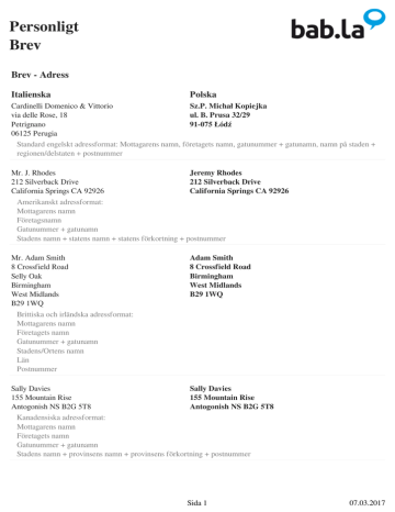 Personligt Brev Brev - Adress Italienska Polska Cardinelli Domenico & Vittorio Sz.P. Michał Kopiejka via delle Rose, 18 ul. B. Prusa 32/29 Petrignano 91-075 Łódź 06125 Perugia Standard engelskt adressformat: Mottagarens namn, företagets namn, gatunummer + gatunamn, namn på staden + regionen/delstaten + postnummer Mr. J. Rhodes Jeremy Rhodes 212 Silverback Drive 212 Silverback Drive California Springs CA 92926 California Springs CA 92926 Amerikanskt adressformat: Mottagarens namn Företagsnamn Gatunummer + gatunamn Stadens namn + statens namn + statens förkortning + postnummer Mr. Adam Smith 8 Crossfield Road Selly Oak Birmingham West Midlands B29 1WQ Brittiska och irländska adressformat: Mottagarens namn Företagets namn Gatunummer + gatunamn Stadens/Ortens namn Län Postnummer Adam Smith 8 Crossfield Road Birmingham West Midlands B29 1WQ Sally Davies Sally Davies 155 Mountain Rise 155 Mountain Rise Antogonish NS B2G 5T8 Antogonish NS B2G 5T8 Kanadensiska adressformat: Mottagarens namn Företagets namn Gatunummer + gatunamn Stadens namn + provinsens namn + provinsens förkortning + postnummer Sida 1 07.03.2017 Personligt Brev Ms. Celia Jones 47 Herbert Street Floreat Perth WA 6018 Australiensiskt adressformat: Mottagarens namn Företagets namn Gatunummer + gatunamn Provinsens namn Stadens namn + postnummer Celia Jones 47 Herbert Street Floreat Perth WA 6018 Miss. L. Marshall 745 King Street West End Wellington 0680 Nyzeeländskt adressformat: Mottagarens namn Gatunummer + gatunamn Förort/RD (rural delivery) nummer/Box Stadens/Ortens namn + postnummer Alex Marshall 745 King Street West End Wellington 0680 Brev - Öppning Italienska Polska Caro Luca, Informellt, standardiserat sätt att adressera en vän Drogi Janie, Cari mamma e papà, Droga Mamo/Drogi Tato, / Kochani Rodzice, Informellt, standardsättet att adressera en av dina föräldrar Caro zio Flavio, Drogi Wujku, Informellt, standardsättet att adressera en familjemedlem Ciao Matteo, Informellt, standardiserat sätt att adressera en vän Cześć Michale, Ciao Matty! Hej Janku, Mycket informellt, standardsättet att adressera en vän Sida 2 07.03.2017 Personligt Brev Luca, Informellt, ett direkt sätt att adressera en vän Janku, Tesoro, Mój Drogi/Moja Droga, Mycket informellt, används när man adresserar en nära anhörig Amore, Mój Najdroższy/Moja Najdroższa, Mycket informellt, används när man adresserar en partner Amore mio, Informellt, används när man adresserar en partner Najdroższy/Najdroższa, Grazie per avermi scritto. Används när du svarar på korrespondens Dziękuję za Twój list. Che bello sentirti! Används när du svarar på korrespondens Cieszę się, że się odezwałeś/-aś. Scusami per non averti scritto per così tanto tempo. Przepraszam, że nie pisałem/-am tak długo. Används när du skriver till en gammal vän som du inte har kontaktat på ett tag È passato così tanto tempo dall'ultima volta. Minęło sporo czasu od naszego ostatniego kontaktu. Används när du skriver till en gammal vän som du inte har kontaktat på länge Brev - Huvuddel Italienska Polska Ti scrivo perché ho delle notizie importanti da darti. Används när du har viktiga nyheter Piszę, by przekazać Ci... Hai già dei piani per...? Czy masz już plany na...? Används när du vill bjuda in någon till ett evenemang eller vill träffa dem Grazie per aver inviato / invitato / allegato... Dziękuję bardzo za przesłanie/zaproszenie/załączenie... Används för att tacka någon / bjuda in någon någonstans / bifoga information Ti ringrazio molto per avermi fatto sapere... / per Jestem Ci bardzo wdzięczny za poinformowanie avermi offerto... / per avermi scritto... mnie/zaoferowanie mi/napisanie mi... Används för att hjärtligt tacka någon för att de har berättat något för dig / erbjudit dig något / har skrivit till dig gällande något Sida 3 07.03.2017 Personligt Brev Sono felice di ricevere la tua lettera / il tuo invito / Jak miło, że do mnie napisałeś/mnie zaprosiłeś il tuo messaggio do/przesłałeś mi... Används när du verkligen uppskattar något som någon skrivit till dig / bjudit in dig till / skickat till dig Sono felice di annunciarti che... Används för att tillkännage goda nyheter till vänner Z przyjemnością powiadamiam, że... Sono davvero felice di sapere che... Används att förmedla ett budskap eller nyheter Ucieszyłem się słysząc, że... Mi dispiace molto doverti dire che... Används för att meddela vänner dåliga nyheter Z przykrością piszę, że... Mi dispiace sapere che... Tak przykro mi słyszeć, że... Används för att trösta en vän gällande dåliga nyheter som de har fått Brev - Avslutning Italienska Polska Porta i miei saluti a... e digli/dille che mi manca Ucałuj ode mnie ... i przekaż im, jak bardzo za nimi molto. tęsknię. Används när du via brevets mottagare vill berätta för någon att du saknar dem ...ti manda i suoi saluti. Pozdrowienia od... Används när du skickar hälsningar från någon annan Salutami... Pozdrów ode mnie... Används när man via personen man skriver till vill hälsa till någon annan Spero di avere presto tue notizie. Används när du vill få ett svarsbrev Czekam na Twoją odpowiedź. Rispondimi presto. Direkt, används när du vill få ett svarsbrev Odpisz szybko. Rispondimi non appena... Odpisz, gdy... Används när du vill att mottagaren ska svara först då när de har nyheter att komma med Sida 4 07.03.2017 Personligt Brev Scrivimi non appena sai qualcosa. Napisz, gdy będziesz miał jakieś nowe informacje. Används när du vill att mottagaren ska svara först då när de har nyheter att komma med Stammi bene. Används när man skriver till familj och vänner Trzymaj się ciepło. Ti amo. Används när du skriver till din partner Kocham Cię. I migliori auguri Pozdrawiam serdecznie, Informellt, används mellan familj, vänner eller kollegor Con i migliori auguri Pozdrawiam ciepło, Informellt, används när man skr