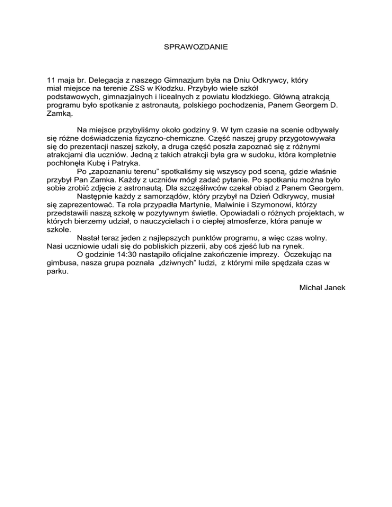 SPRAWOZDANIE 11 maja br. Delegacja z naszego Gimnazjum była na Dniu Odkrywcy, który miał miejsce na terenie ZSS w Kłodzku. Przybyło wiele szkół podstawowych, gimnazjalnych i licealnych z powiatu kłodzkiego. Główną atrakcją programu było spotkanie z astronautą, polskiego pochodzenia, Panem Georgem D. Zamką. Na miejsce przybyliśmy około godziny 9. W tym czasie na scenie odbywały się różne doświadczenia fizyczno-chemiczne. Część naszej grupy przygotowywała się do prezentacji naszej szkoły, a druga część poszła zapoznać się z różnymi atrakcjami dla uczniów. Jedną z takich atrakcji była gra w sudoku, która kompletnie pochłonęła Kubę i Patryka. Po „zapoznaniu terenu” spotkaliśmy się wszyscy pod sceną, gdzie właśnie przybył Pan Zamka. Każdy z uczniów mógł zadać pytanie. Po spotkaniu można było sobie zrobić zdjęcie z astronautą. Dla szczęśliwców czekał obiad z Panem Georgem. Następnie każdy z samorządów, który przybył na Dzień Odkrywcy, musiał się zaprezentować. Ta rola przypadła Martynie, Malwinie i Szymonowi, którzy przedstawili naszą szkołę w pozytywnym świetle. Opowiadali o różnych projektach, w których bierzemy udział, o nauczycielach i o ciepłej atmosferze, która panuje w szkole. Nastał teraz jeden z najlepszych punktów programu, a więc czas wolny. Nasi uczniowie udali się do pobliskich pizzerii, aby coś zjeść lub na rynek. O godzinie 14:30 nastąpiło oficjalne zakończenie imprezy. Oczekując na gimbusa, nasza grupa poznała „dziwnych” ludzi, z którymi mile spędzała czas w parku. Michał Janek