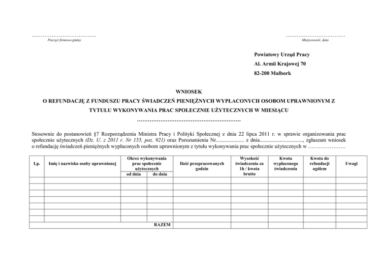 ……………………………… …………………………… Pieczęć firmowa gminy Miejscowość, data Powiatowy Urząd Pracy Al. Armii Krajowej 70 82-200 Malbork WNIOSEK O REFUNDACJĘ Z FUNDUSZU PRACY ŚWIADCZEŃ PIENIĘŻNYCH WYPŁACONYCH OSOBOM UPRAWNIONYM Z TYTUŁU WYKONYWANIA PRAC SPOŁECZNIE UŻYTECZNYCH W MIESIĄCU …………………………………………………. Stosownie do postanowień §7 Rozporządzenia Ministra Pracy i Polityki Społecznej z dnia 22 lipca 2011 r. w sprawie organizowania prac społecznie użytecznych (Dz. U. z 2011 r. Nr 155, poz. 921) oraz Porozumienia Nr..................... z dnia................................, zgłaszam wniosek o refundację świadczeń pieniężnych wypłaconych osobom uprawnionym z tytułu wykonywania prac społecznie użytecznych w ………………… Lp. Imię i nazwisko osoby uprawnionej Okres wykonywania prac społecznie użytecznych od dnia do dnia RAZEM Ilość przepracowanych godzin Wysokość świadczenia za 1h / kwota brutto Kwota wypłaconego świadczenia Kwota do refundacji ogółem Uwagi Nr rachunku bankowego na który należy dokonać refundacji ……………………………………………………………………………………… Załączniki: 1. Kopia listy osób uprawnionych, którym za wykonywanie prac społecznie użytecznych wypłacono świadczenie z podaniem jego wysokości 2. Kopie zwolnień lekarskich. …………………………………….. Pieczęć i podpis