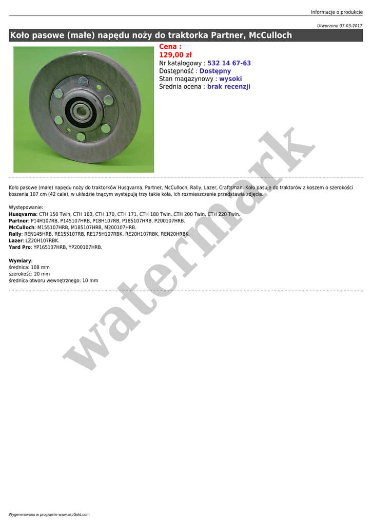 Informacje o produkcie Utworzono 07-03-2017 Koło pasowe (małe) napędu noży do traktorka Partner, McCulloch Cena : 129,00 zł er m ar k Nr katalogowy : 532 14 67-63 Dostępność : Dostępny Stan magazynowy : wysoki Średnia ocena : brak recenzji Koło pasowe (małe) napędu noży do traktorków Husqvarna, Partner, McCulloch, Rally, Lazer, Craftsman. Koło pasuje do traktorów z koszem o szerokości koszenia 107 cm (42 cale), w układzie tnącym występują trzy takie koła, ich rozmieszczenie przedstawia zdjęcie. Występowanie: Husqvarna: CTH 150 Twin, CTH 160, CTH 170, CTH 171, CTH 180 Twin, CTH 200 Twin, CTH 220 Twin. Partner: P14H107RB, P145107HRB, P18H107RB, P185107HRB, P200107HRB. McCulloch: M155107HRB, M185107HRB, M200107HRB. Rally: REN145HRB, RE155107RB, RE175H107RBK, RE20H107RBK, REN20HRBK. Lazer: LZ20H107RBK. Yard Pro: YP165107HRB, YP200107HRB. w at Wymiary: średnica: 108 mm szerokość: 20 mm średnica otworu wewnętrznego: 10 mm Wygenerowano w programie www.oscGold.com