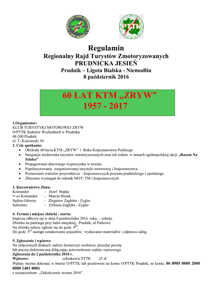 Regulamin Regionalny Rajd Turystów Zmotoryzowanych PRUDNICKA JESIEŃ Prudnik – Ligota Bialska - Niemodlin 8 październik 2016 60 LAT KTM „ZRYW” 1957 - 2017 1.Organizator: KLUB TURYSTYKI MOTOROWEJ ZRYW O/PTTK Sudetów Wschodnich w Prudniku 48-200 Prudnik ul. T. Kościuszki 56 2. Cele spotkania: Obchody 60-lecia KTM „ZRYW” i Roku Krajoznawstwa Polskiego Integracja środowiska turystów zmotoryzowanych oraz ich rodzin w ramach ogólnopolskiej akcji „Razem Na Szlaku” Propagowanie aktywnego wypoczynku w terenie. Popularyzowanie zorganizowanej turystyki motorowej i krajoznawstwa. Poznawanie walorów przyrodniczo – krajoznawczych powiatu prudnickiego i opolskiego Zbieranie wymagań do odznak MOT/ TM i krajoznawczych. 3. Kierownictwo Zlotu: Komandor - Józef Hupka V-ce Komandor - Marcin Husak Sędzia Główny - Zbigniew Zagłoba - Zygler Sekretarz - Elżbieta Zagłoba - Zygler 4. Termin i miejsce zbiórki - startu: Impreza odbywa się w dniu 8 października 2016 roku, – sobota. Zbiórka na parkingu przy łaźni miejskiej, Prudnik, ul Parkowa Na zbiórkę należy zgłosić się do godz. 900. Do godz. 910 nastąpi oznakowanie pojazdów, wydawanie materiałów i odprawa załóg. 5. Zgłoszenie i wpisowe Na załączonych drukach .należy dostarczyć osobiście, przesłać pocztą lub pocztą elektroniczną dołączając potwierdzenie wpłaty wpisowego. Zgłoszenia do 2 października 2016 r. Wpisowe: członkowie PTTK 25 zł Wpłaty można dokonać w biurze O/PTTK lub przelewem na konto O/PTTK Prudnik, nr konta: 06 8905 0000 2000 0000 1401 0001 z zaznaczeniem „Zakończenie sezonu 2016”. 6. Uczestnictwo: Impreza wyłącznie dla członków PTTK Załogi poruszają się sprawnymi pojazdami dopuszczonymi do ruchu drogowego. Członkowie PTTK okazują ważną legitymację z opłaconą składką na 2016r . 7. Świadczenia organizatora w ramach wpisowego: Zwiedzanie Białej, Ligoty Bialskiej, Niemodlina z przewodnikiem Okolicznościowa wlepka (samoprzylepna) Obiad w restauracji w Niemodlinie Udział w konkursach i współzawodnictwie Nagrody dla wyróżnionych, możliwość wykonania ciekawych zdjęć Członkowie PTTK z opłaconymi składkami za 2016 r. są ubezpieczeni od następstw nieszczęśliwych wypadków podczas trwania rajdu , 8. Uprawnienia i obowiązki uczestników: Przestrzeganie zasad bezpiecznej i kulturalnej jazdy, zajmowania miejsc postojowych. Czynny udział w konkursach rekreacyjnych i w zwiedzaniu obiektów . Zgłoszenie protestu do Sędziego Głównego najpóźniej do 10 minut po ogłoszeniu wyników końcowych 9. Ramowy program RAJDU do 900 – zbiórka na parkingu przy łaźni miejskiej w Prudnik, ul. Parkowa 00 10 9 – 9 – wydawanie materiałów, oznakowanie pojazdów, odprawa 910 - 1330 – itinerer, przejazd ze zwiedzaniem i konkursami na trasie Prudnik Biała – Ligota Bialska – Przechód – Tułowice -Niemodlin 1400 – 1600 – zwiedzanie zamku w Niemodlinie i miasta 1600 – 1700 – obiad w restauracji 1700 - 1730 – ogłoszenie wyników, wręczenie nagród. Zakończenie Rajdu i wyjazd do miejsca zamieszkania Bilety wstępu do zamku w Niemodlinie płatne we własnym zakresie! Uwaga ! Poszczególne czasy mogą ulec minimalnej zmianie ! 10. Postanowienia końcowe: Regionalny Rajd Turystów Zmotoryzowanych jest imprezą non-profit, nie ma charakteru komercyjnego. Rajd organizowany jest na zasadach samoorganizacji siłami wolontariatu , zgodnie ze statutem PTTK. Regulamin jest dokumentem wewnętrznym, zatwierdzonym przez Zarząd Klubu Turystyki Motorowej ZRYW w Prudniku na podstawie art.10 pkt. 3 ustawy z dnia 24 kwietnia 2003 roku o działalności pożytku publicznego i o wolontariacie. / Dz. U. z 2003 r. nr 96 poz. 873 z późniejszymi zmianami/ Uczestnicy biorą udział w spotkaniu na własne życzenie i odpowiedzialność. Organizatorzy nie ponoszą odpowiedzialności za szkody wyrządzone osobom trzecim przez uczestników zlotu. Impreza odbywa się niezależnie od pogody. W przypadku nie stawienia się na zbiórkę wpisowe nie podlega zwrotowi. Interpretacja regulaminu oraz wydawanie dodatkowych komunikatów należy do KTM „ZRYW” Impreza motorowa została zatwierdzona przez KTM ZG PTTK jako impreza o randze regionalnej pod nr 161/16 KTM ZG PTTK Zapraszamy i życzymy szerokiej drogi i mocnych wrażeń