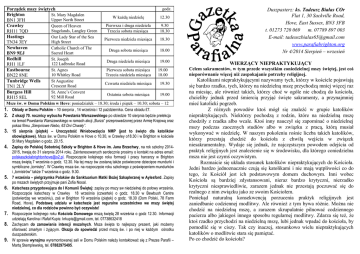 nc Porządek mszy świętych Brighton St. Mary Magdalen Upper North Street BN1 3FH Crawley Queen of Heaven Stagelands, Langley Green RH11 7QD Hastings Our Lady Star of the Sea High Street TN34 3EY Newhaven Catholic Church of The Sacred Heart BN9 9EJ Redhill St. Joseph 122 Ladbroke Road RH1 1LF Eastbourne St. Agnes 10 Whitley Road BN22 8NE Tunbridge Wells St Augustine Crescent Road TN1 2LY Burgess Hill St. Anne’s Convent 92 Mill Road RH15 8EL godz. W każdą niedzielę 12.30 Pierwsza i druga niedziela Trzecia sobota miesiąca 9.30 18.30 Pierwsza niedziela miesiąca 18.30 Druga sobota miesiąca 18.00 Druga niedziela miesiąca 19.00 Pierwsza sobota miesiąca Trzecia niedziela miesiąca 19.00 18.00 Czwarta niedziela miesiąca 19.30 Ostatnia sobota miesiąca 19.00 Msze św. w Domu Polskim w Hove: poniedziałek – 18.30; środa i piątek – 10.30; sobota – 12 1. Obiady w Domu Polskim – 10 sierpnia , 14 września i 12 października. Cena obiadu £7. 2. Z okazji 70. rocznicy wybuchu Powstania Warszawskiego po obiedzie 10 sierpnia będzie prelekcja na temat Powstania Warszawskiego w ramach akcji „Burza” przeprowadzonej przez Armię Krajową oraz pokaz filmu „Sierpniowe Niebo, 63 Dni Chwały”. 3. 15 sierpnia (piątek) – Uroczystość Wniebowzięcia NMP (jest to święto dla katolików obowiązkowe). Msza św. w Domu Polskim w Hove o 10.30, w Crawley o18.30 i w Brighton w kościele St Mary Magdalen o godz. 20.15. 4. Zapisy do Polskiej Sobotniej Szkoły w Brighton & Hove im. Jana Brzechwy, na rok szkolny 20142015, trwają do 31 sierpnia 2014 roku. Zainteresowanych serdecznie prosimy o kontakt na adres email: [email protected]. Rozpoczęcie kolejnego roku formacji i pracy harcerzy w Brighton mszą świętą 7 września o godz. 12.30. Na tej mszy św zostaną także poświecone dziecięce mundurki i symbliczne „tornistry”. W Crawley msza św. na rozpoczęcie roku szkolnego z poświęceniem mundurków i „tornistrów” także 7 września o godz. 9.30. Wartości i wieczne 5. 7 września – pielgrzymka Polakówdoczesne do Sanktuarium Matki Bożej Szkaplerznej w Aylesford. Zapisy „Troszczcie ten pokarm, który ginie” (J 6, 27). po mszach świętych przyjmuje się paninie ZofiaoNosal. Jezusprzygotowująca dowartościował doczesność, oczy na 6. Pan Katecheza do I Komunii Świętej:równocześnie zapisy po mszy swotwierając niedzielnej donam połowy września. Rozpoczęcie katechezy w Crawley 18 września (czwartek) o godz. 18.30 w Bewbush Centre wartości wieczne. (potwierdzęcudu we wrześniu), zaś w Brighton 19 aby września (piątek) o godz. 18.30 (Dom Polski, 78 Farm Dokonał rozmnożenia chleba, dowartościować doczesność. Road, Hove). Podstawą udziału w katechezie jest reguralne uczestnictwo we mszy świętej Podzielił również ryby. Był to cud wyjątkowo oczywisty, ponieważ z pięciu niedzielnej, co dla rodziców powinno być oczywiste! bochenków chleba Domowego Apostołowie koszów 7. Rozpoczęciepodzielonego kolejnego roku Kościoła mszązebrali świętą 28dwanaście września o godz 12.30. Informacji ułomków. udzielają Karolina i Rafał Kupis: [email protected], tel. 07738632418 to błogosławiony chleb,Msza przekazany ludziomprezent, jako pokarm 8. Był Zachęcam do zamawianiachleb, intencjiświęty mszalnych. święta to najlepszy jaki możemy dlaofiarować ich ciałazmarłym w trosce o to, aby niedoustali, gdy przed będąmszą wracać Tego ośrodku i żyjącym. Okazja spowiedzi św. ido po domu. niej w każdym duszpasterskim. chleba głodni szukali u Chrystusa także na drugi dzień. 9. W sprawie wynajmu wyremontowanej sali w Domu Polskim należy kontaktować się z Prezes Parafii – Martą Stemplewską, tel. 07882975495. Duszpasterz: ks. Tadeusz Białas COr Flat 1, 30 Sackville Road, Hove, East Sussex, BN3 3FB t. 01273 720 069 m. 07789 897 003 E-mail: [email protected] www.parafiabrighton.org Nr 4/2014 Sierpień – wrzesień WIERZĄCY NIEPRAKTYKUJĄCY Celem sakramentów, w tym przede wszystkim coniedzielnej mszy świętej, jest coś nieporównanie więcej niż zaspokajanie potrzeby religijnej. Katolikami niepraktykującymi nazywamy tych, którzy w kościele pojawiają się bardzo rzadko, tych, którzy na niedzielną mszę przychodzą mniej więcej raz na miesiąc, ale również takich, którzy choć w ogóle nie chodzą do kościoła, chcieliby jednak przed śmiercią przyjąć święte sakramenty, a przynajmniej mieć katolicki pogrzeb. Z różnych powodów ktoś mógł się znaleźć w grupie katolików niepraktykujących. Niektórzy pochodzą z rodzin, które na niedzielną mszę chodziły z rzadka albo wcale. Ktoś inny nauczył się zapominać o niedzielnej mszy podczas zaocznych studiów albo w związku z pracą, którą musiał wykonywać w niedzielę. W naszym pokoleniu rośnie liczba takich katolików, którzy przestają chodzić do kościoła z chwilą wejścia w związek niesakramentalny. Wydaje się jednak, że najczęstszym powodem odejścia od praktyk religijnych jest znalezienie się w środowisku, dla którego coniedzielna msza nie jest czymś oczywistym. Rozmaicie się układa stosunek katolików niepraktykujących do Kościoła. Jedni bardzo jednoznacznie czują się katolikami i nie mają wątpliwości co do tego, że Kościół jest ich podstawowym domem duchowym. Inni wobec Kościoła są bardziej zdystansowani, nieraz bardzo krytyczni, nierzadko krytyczni niesprawiedliwie, zarazem jednak nie przestają poczuwać się do realnego z nim związku jako ze swoim Kościołem. Poniekąd naturalną konsekwencją porzucenia praktyk religijnych jest zaniedbanie codziennej modlitwy. Ale również z tym bywa różnie. Można nie chodzić na niedzielną mszę, a zarazem skrupulatnie pilnować codziennego pacierza albo jakiegoś innego sposobu regularnej modlitwy. Zdarza się też, że ktoś rzadko przychodzi na niedzielną mszę, lubi jednak wpadać do kościoła, by pomodlić się w ciszy. Tak czy inaczej, stosunkowo wielu nieprakty