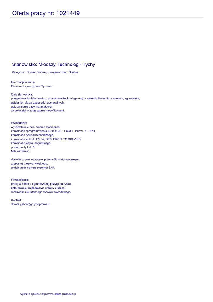 Oferta pracy nr: 1021449 Stanowisko: Młodszy Technolog - Tychy Kategoria: Inżynier produkcji, Województwo: Śląskie Informacje o firmie: Firma motoryzacyjna w Tychach Opis stanowiska: przygotowanie dokumentacji procesowej technologicznej w zakresie tłoczenia, spawania, zgrzewania, ustalanie i aktualizacja cykli operacyjnych, uaktualnianie bazy materiałowej, współudział w zarządzaniu modyfikacjami. Wymagania: wykształcenie min. średnie techniczne, znajomość oprogramowania AUTO CAD, EXCEL, POWER POINT, znajomość rysunku technicznego, znajomość technik: FMEA, SPC, PROBLEM SOLVING, znajomość języka angielskiego, prawo jazdy kat. B. Mile widziane: doświadczenie w pracy w przemyśle motoryzacyjnym, znajomość języka włoskiego, umiejętność obsługi systemu SAP. Firma oferuje: pracę w firmie o ugruntowanej pozycji na rynku, zatrudnienie na podstawie umowy o pracę, możliwość nieustannego rozwoju zawodowego Kontakt: [email protected] wydruk z systemu: http://www.lepsza-praca.com.pl