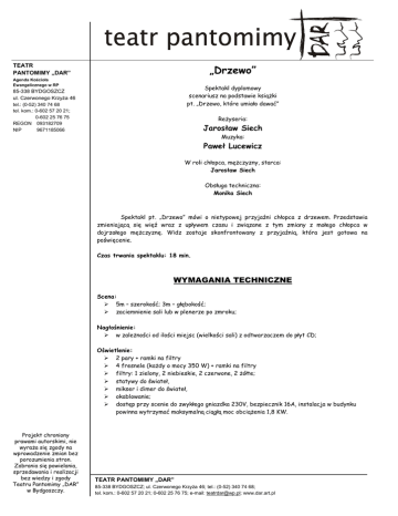 TEATR PANTOMIMY „DAR” „Drzewo” Agenda Kościoła Ewangelicznego w RP Spektakl dyplomowy scenariusz na podstawie ksiąŜki pt. „Drzewo, które umiało dawać” 85-338 BYDGOSZCZ ul. Czerwonego KrzyŜa 46 tel.: (0-52) 340 74 68 tel. kom.: 0-602 57 20 21; 0-602 25 76 75 REGON 093182709 NIP 9671185066 ReŜyseria: Jarosław Siech Muzyka: Paweł Lucewicz W roli chłopca, męŜczyzny, starca: Jarosław Siech Obsługa techniczna: Monika Siech Spektakl pt. „Drzewo” mówi o nietypowej przyjaźni chłopca z drzewem. Przedstawia zmieniającą się więź wraz z upływem czasu i związane z tym zmiany z małego chłopca w dojrzałego męŜczyznę. Widz zostaje skonfrontowany z przyjaźnią, która jest gotowa na poświęcenie. Czas trwania spektaklu: 18 min. WYMAGANIA TECHNICZNE Scena: 5m – szerokość; 3m – głębokość; zaciemnienie sali lub w plenerze po zmroku; Nagłośnienie: w zaleŜności od ilości miejsc (wielkości sali) z odtwarzaczem do płyt CD; Oświetlenie: 2 pary + ramki na filtry 4 fresnele (kaŜdy o mocy 350 W) + ramki na filtry filtry: 1 zielony, 2 niebieskie, 2 czerwone, 2 Ŝółte; statywy do świateł, mikser i dimer do świateł, okablowanie; dostęp przy scenie do zwykłego gniazdka 230V, bezpiecznik 16A, instalacja w budynku powinna wytrzymać maksymalną ciągłą moc obciąŜenia 1,8 KW. Projekt chroniony prawami autorskimi, nie wyraŜa się zgody na wprowadzenie zmian bez porozumienia stron. Zabrania się powielania, sprzedawania i realizacji bez wiedzy i zgody Teatru Pantomimy „DAR” w Bydgoszczy. TEATR PANTOMIMY „DAR” 85-338 BYDGOSZCZ; ul. Czerwonego KrzyŜa 46; tel.: (0-52) 340 74 68; tel. kom.: 0-602 57 20 21; 0-602 25 76 75; e-mail: [email protected]; www.dar.art.pl