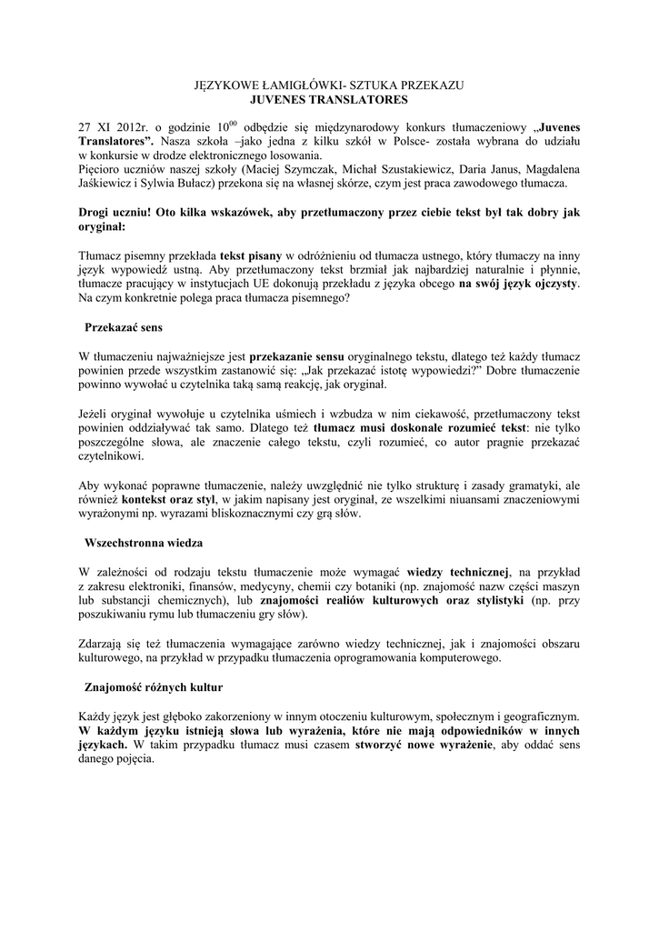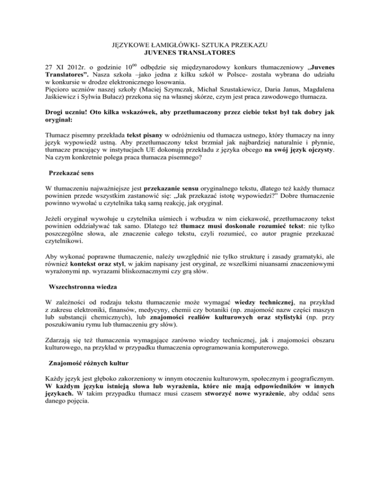 JĘZYKOWE ŁAMIGŁÓWKI- SZTUKA PRZEKAZU JUVENES TRANSLATORES 27 XI 2012r. o godzinie 1000 odbędzie się międzynarodowy konkurs tłumaczeniowy „Juvenes Translatores”. Nasza szkoła –jako jedna z kilku szkół w Polsce- została wybrana do udziału w konkursie w drodze elektronicznego losowania. Pięcioro uczniów naszej szkoły (Maciej Szymczak, Michał Szustakiewicz, Daria Janus, Magdalena Jaśkiewicz i Sylwia Bułacz) przekona się na własnej skórze, czym jest praca zawodowego tłumacza. Drogi uczniu! Oto kilka wskazówek, aby przetłumaczony przez ciebie tekst był tak dobry jak oryginał: Tłumacz pisemny przekłada tekst pisany w odróżnieniu od tłumacza ustnego, który tłumaczy na inny język wypowiedź ustną. Aby przetłumaczony tekst brzmiał jak najbardziej naturalnie i płynnie, tłumacze pracujący w instytucjach UE dokonują przekładu z języka obcego na swój język ojczysty. Na czym konkretnie polega praca tłumacza pisemnego? Przekazać sens W tłumaczeniu najważniejsze jest przekazanie sensu oryginalnego tekstu, dlatego też każdy tłumacz powinien przede wszystkim zastanowić się: „Jak przekazać istotę wypowiedzi?” Dobre tłumaczenie powinno wywołać u czytelnika taką samą reakcję, jak oryginał. Jeżeli oryginał wywołuje u czytelnika uśmiech i wzbudza w nim ciekawość, przetłumaczony tekst powinien oddziaływać tak samo. Dlatego też tłumacz musi doskonale rozumieć tekst: nie tylko poszczególne słowa, ale znaczenie całego tekstu, czyli rozumieć, co autor pragnie przekazać czytelnikowi. Aby wykonać poprawne tłumaczenie, należy uwzględnić nie tylko strukturę i zasady gramatyki, ale również kontekst oraz styl, w jakim napisany jest oryginał, ze wszelkimi niuansami znaczeniowymi wyrażonymi np. wyrazami bliskoznacznymi czy grą słów. Wszechstronna wiedza W zależności od rodzaju tekstu tłumaczenie może wymagać wiedzy technicznej, na przykład z zakresu elektroniki, finansów, medycyny, chemii czy botaniki (np. znajomość nazw części maszyn lub substancji chemicznych), lub znajomości realiów kulturowych oraz stylistyki (np. przy poszukiwaniu rymu lub tłumaczeniu gry słów). Zdarzają się też tłumaczenia wymagające zarówno wiedzy technicznej, jak i znajomości obszaru kulturowego, na przykład w przypadku tłumaczenia oprogramowania komputerowego. Znajomość różnych kultur Każdy język jest głęboko zakorzeniony w innym otoczeniu kulturowym, społecznym i geograficznym. W każdym języku istnieją słowa lub wyrażenia, które nie mają odpowiedników w innych językach. W takim przypadku tłumacz musi czasem stworzyć nowe wyrażenie, aby oddać sens danego pojęcia. Niektóre teksty zawierają tyle odniesień kulturowych, że muszą być tłumaczone inaczej dla różnych odbiorców, w zależności od tego, z jakiej kultury się wywodzą lub gdzie mieszkają. Na przykład hiszpańska wersja gry planszowej z pytaniami z wiedzy ogólnej będzie inna od wersji tej samej gry sprzedawanej np. w Ekwadorze – mimo że mieszkańcy obu krajów posługują się tym samym językiem. Tłumaczenie tego rodzaju określane jest terminem „lokalizacja” (czyli dostosowanie do kontekstu lokalnego). Język jest zmienny Kolejna trudność wynika z tego, że języki stale ewoluują. Codziennie powstają nowe idee oraz wynalazki, a istniejące słowa zmieniają znaczenie. Tłumacz musi zatem wykazać się kreatywnością – znaleźć sposoby wyrażenia nowych pojęć w swoim języku. Jest to być może najtrudniejszy, ale jednocześnie najciekawszy aspekt pracy tłumacza. Sprawdzenie znaczenia słowa w słowniku to zaledwie pierwszy krok. W zależności od kontekstu, w jakim dane słowo występuje, może ono mieć bardzo różne znaczenia. Tłumaczenie to język Europy Umberto Eco