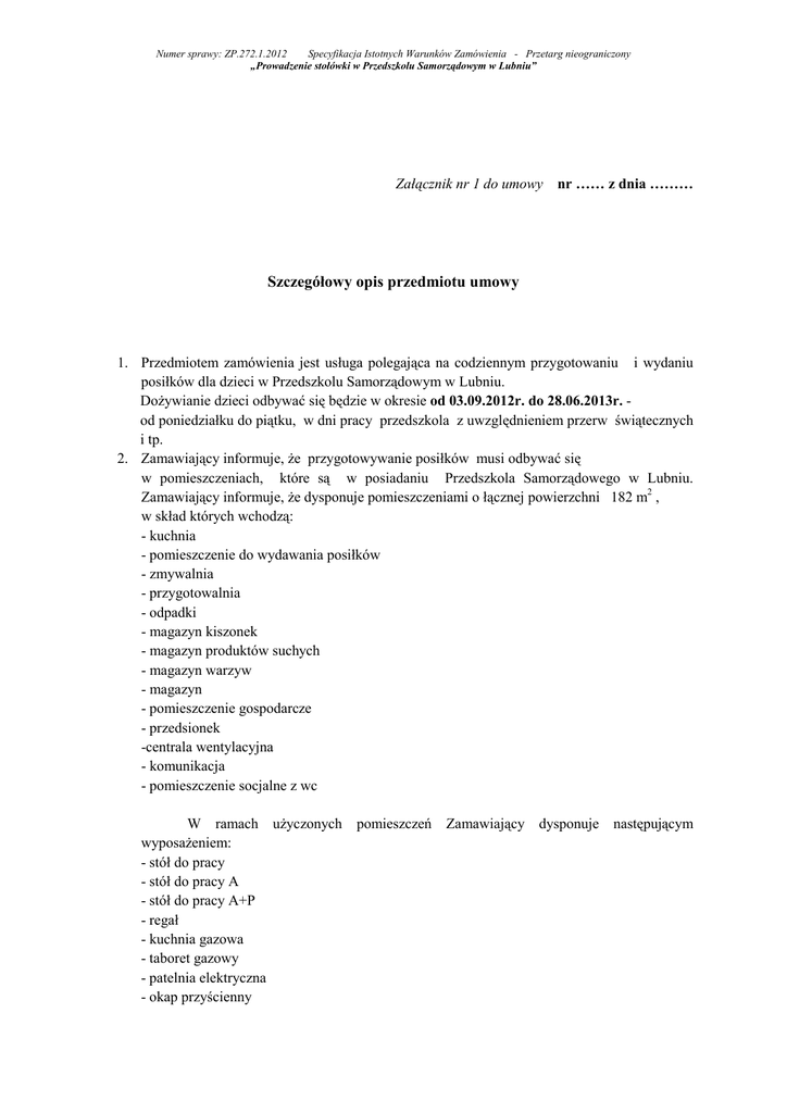 Numer sprawy: ZP.272.1.2012 Specyfikacja Istotnych Warunków Zamówienia - Przetarg nieograniczony „Prowadzenie stołówki w Przedszkolu Samorządowym w Lubniu” Załącznik nr 1 do umowy nr …… z dnia ……… Szczegółowy opis przedmiotu umowy 1. Przedmiotem zamówienia jest usługa polegająca na codziennym przygotowaniu i wydaniu posiłków dla dzieci w Przedszkolu Samorządowym w Lubniu. Dożywianie dzieci odbywać się będzie w okresie od 03.09.2012r. do 28.06.2013r. od poniedziałku do piątku, w dni pracy przedszkola z uwzględnieniem przerw świątecznych i tp. 2. Zamawiający informuje, że przygotowywanie posiłków musi odbywać się w pomieszczeniach, które są w posiadaniu Przedszkola Samorządowego w Lubniu. Zamawiający informuje, że dysponuje pomieszczeniami o łącznej powierzchni 182 m2 , w skład których wchodzą: - kuchnia - pomieszczenie do wydawania posiłków - zmywalnia - przygotowalnia - odpadki - magazyn kiszonek - magazyn produktów suchych - magazyn warzyw - magazyn - pomieszczenie gospodarcze - przedsionek -centrala wentylacyjna - komunikacja - pomieszczenie socjalne z wc W ramach użyczonych wyposażeniem: - stół do pracy - stół do pracy A - stół do pracy A+P - regał - kuchnia gazowa - taboret gazowy - patelnia elektryczna - okap przyścienny pomieszczeń Zamawiający dysponuje następującym Numer sprawy: ZP.272.1.2012 Specyfikacja Istotnych Warunków Zamówienia - Przetarg nieograniczony „Prowadzenie stołówki w Przedszkolu Samorządowym w Lubniu” - stół centralny – 2 sztuki - stół przyścienny z szufladami i drzwiami skrzydłowymi - stół z basenem – 2 sztuki - regał perforowany - zlew 2 – komorowy z drzwiami suwanymi - szafa przelotowa z drzwiami suwanymi - stół przyścienny z półką – 2 sztuki - stół ze zlewem - stół ze zlewem i półką - szafa chłodnicza -Termos z kółkami -szt. 2, -Pokrywka garnka GN 1/1- szt. 3, -Pokrywka z uszczelką- szt. 3, -Garnek GN delux – 65 -szt. 4; -Garnek GN Delux -100 -szt. 1 -Garnek GN 150 -szt. 1 -Pokrywka szczelna ½ - szt. 4 -Garnek GN ½ 200 – szt. 4 -Pokrywka śr – 32 szt. 2; -Pokrywka śr.36 –szt. 1 -Garnek wysoki 22 l – szt.2 -Garnek wysoki 37 l. szt.1 Wyposażenie to Zamawiający udostępni wykonawcy na okres realizacji niniejszego zamówienia. W okresie realizacji zamówienia wykonawca będzie ponosił pełną odpowiedzialność za udostępnione wyposażenie oraz pomieszczenia. W/w pomieszczenia wraz z wyposażeniem zostaną przekazane wykonawcy na podstawie protokołu zdawczo – odbiorczego który będzie stanowił integralną część umowy. Pozostałe wyposażenie, w tym naczynia stołowe i sztućce Wykonawca zaopatrzy się we własnym zakresie. Ponadto Zamawiający informuje, że zgodnie z Zarządzeniem Nr 107/2011 Wójta Gminy Lubień z dnia 21 listopada 2011r. w sprawie : ustalenia minimalnych stawek czynszu miesięcznie brutto w złotych za 1 m2 powierzchni lokali użytkowych oraz ustalenia minimalnych stawek brutto czynszu za 1 m2 dzierżawy gruntu rocznie, Wykonawca będzie ponosił koszty związane z czynszem – opłatą za udostępnione pomieszczeń, w których prowadzona jest stołówka szkolna dla uczniów. Zatem cena ta winna być wkalkulowana w cenę ofertową. Informujemy, że zgodnie z w/w zarządzeniem- czynsz za 1 m2 zajętej powierzchni wynosi 2,20 złotych brutto miesięcznie, natomiast czynsz za korzystanie z wyposażenia kuchni wynosi 50,00 złotych brutto miesięcznie 3. Przygotowując posiłki należy uwzględniać wszelkie wymogi sanitarno-higieniczne. Ciepły posiłek musi odpowiadać normom odżywczym obowiązującym w tzw. punktach zbiorowego żywienia, tj. posiłki powinny być przygotowywane zgodnie z zasadami racjonalnego żywienia, sporządzone z pełnowartościowych, świeżych artykułów spożywczych, posiadających aktualne terminy ważności. Resztki i śmieci pozostałe po wydawaniu posiłków muszą być wywiezione z pomieszczeń stołówki na koszt wykonawcy usługi. Wykonawca będzie przygotowywał posiłki zgodnie z zasadami określonymi w ustawie o bezpieczeństwie żywności i żywienia (Dz. U. z 2006 roku Nr 171, poz. 1225 z późn. zm.) łącznie z przepisami wykonawczymi do tej ustawy. Przede wszystkim Wykonawca musi Numer sprawy: ZP.272.1.2012 Specyfikacja Istotnych Warunków Zamówienia - Przetarg nieograniczony „Prowadzenie stołówki w Przedszkolu Samorządowym w Lubniu” uwzględnić normy Zamawiającego: żywienia w przedszkolach oraz następujące zalecenia W żywieniu dzieci w wieku przedszkolnym należy stosować dietę lekko strawną. Posiłki gorące powinny być gotowane, duszone, pieczone, sporadycznie smażone. W planowaniu jadłospisu należy uwzględnić konieczność podania na śniadanie dwa razy w tygodniu mleka lub produktów zastępczych tj. ser twarogowy lub ser żółty, raz w tygodniu ryb na śniadanie lub obiad. - posiłki powinny być przygotowane zgodnie z zasadami racjonalnego żywienia z pełnowartościowych produktów posiadających aktualne terminy ważności, codziennie musi wystąpić surówka lub warzywa gotowane,- co najmniej 3 razy w tygodniu danie mięsne lub rybne oraz 2 razy w tygodniu do śniadania dodatkiem będą sezonowe owoce lub warzywa (jabłko, marchewka itp.). W sytuacji wyjątkowej spowodowanej czynnikami losowymi co może skutkować „nieprzygotowaniem posiłku”, Wykonawca zobowiązany będzie do zakupu suchego prowiantu o wartości ceny obiadu brutto. Zalecane przez Zamawiającego posiłki to: - Śniadanie: pieczywo mieszane z masłem i dodatkami wędliny, past serowych, sera żółtego jajek, lub dżemów; zupy mleczne lub kiełbaski na ciepło. Do picia: herbata, kakao, kawa zbożowa. Kaloryczność śniadania w przeliczeniu na jedno dziecko winna wynosić ok.400 kcal. - Obiad;. ma być posiłkiem mięsnym/rybnym z urozmaiconymi surówkami lub gotowanymi jarzynami. Do mięsa zamiennie mogą być podawane ziemniaki, kasze, ryż lub makaron. Posiłe